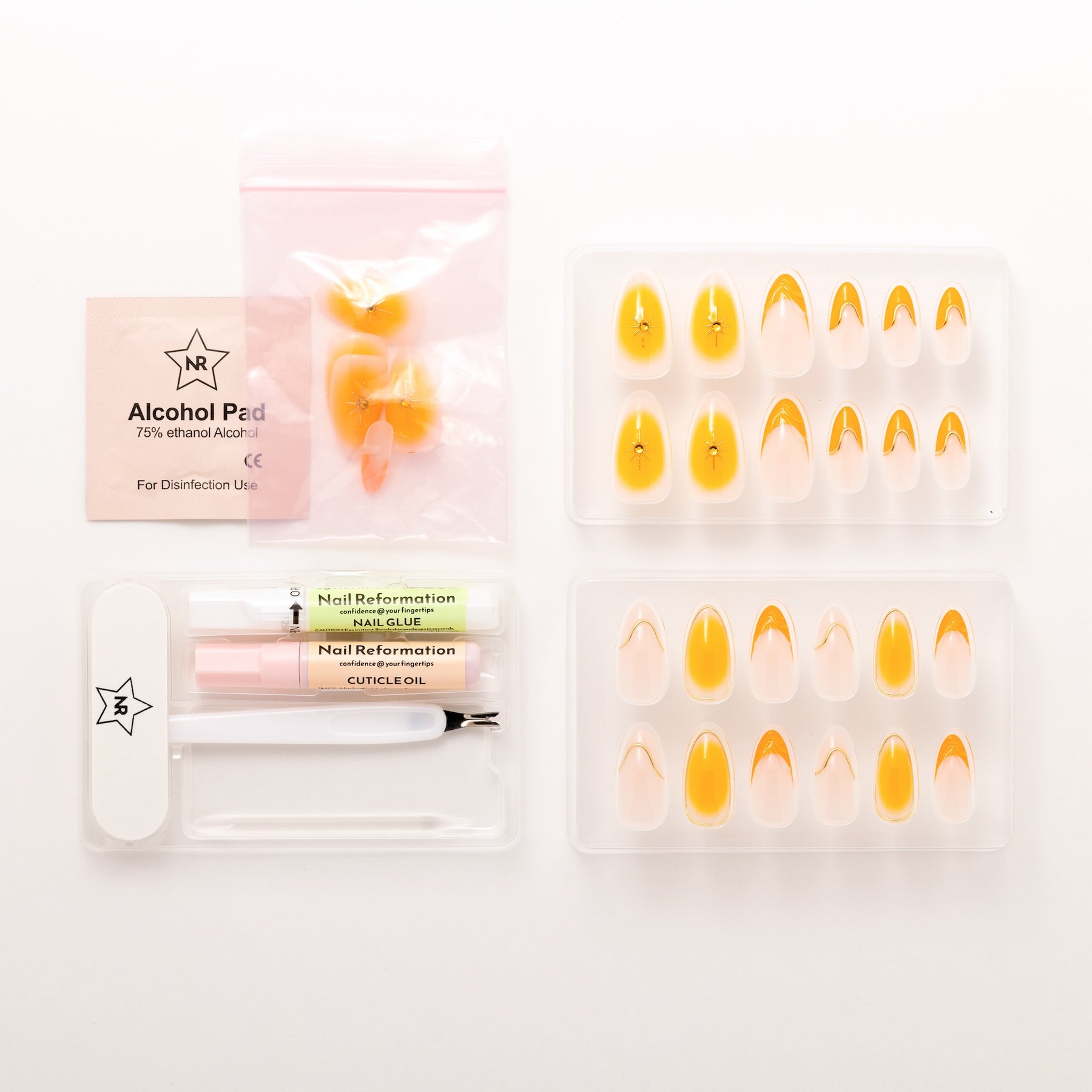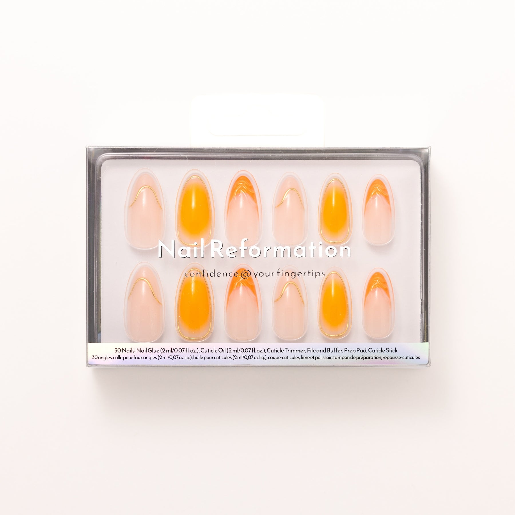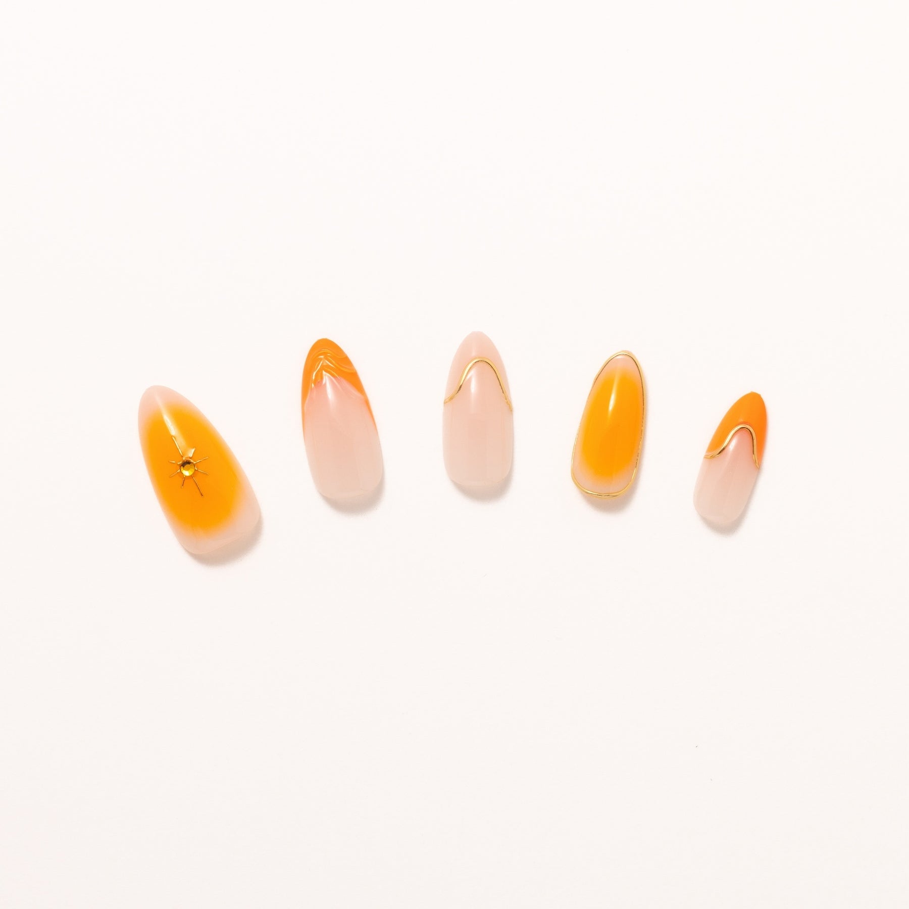 The Citrus Glow press-on nail set brings sun-kissed energy to your fingertips with bright orange ombré, golden undertones, and a sparkling jewel accent. The color-blocked design flows from citrusy warmth into soft nude fades, while metallic touches mimic rays of light. Finished with a smooth gloss, these medium almond tips are like a summer sunset in nail form; radiant, juicy, and ready to shine.