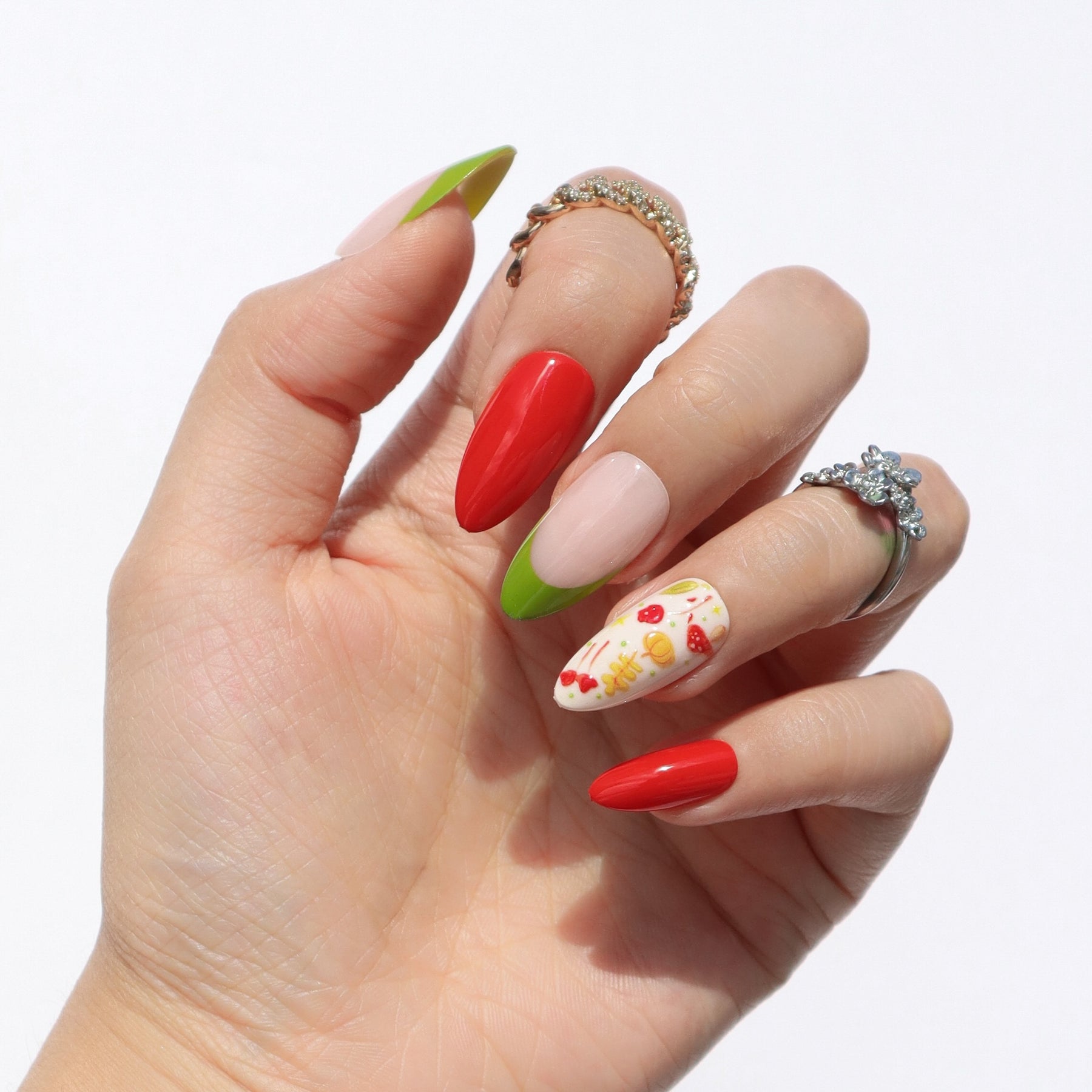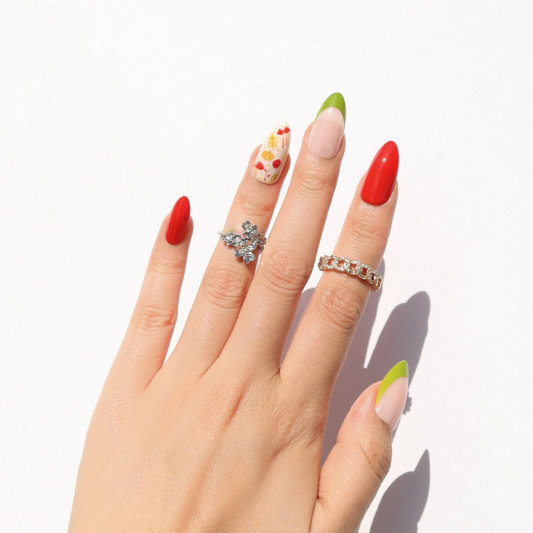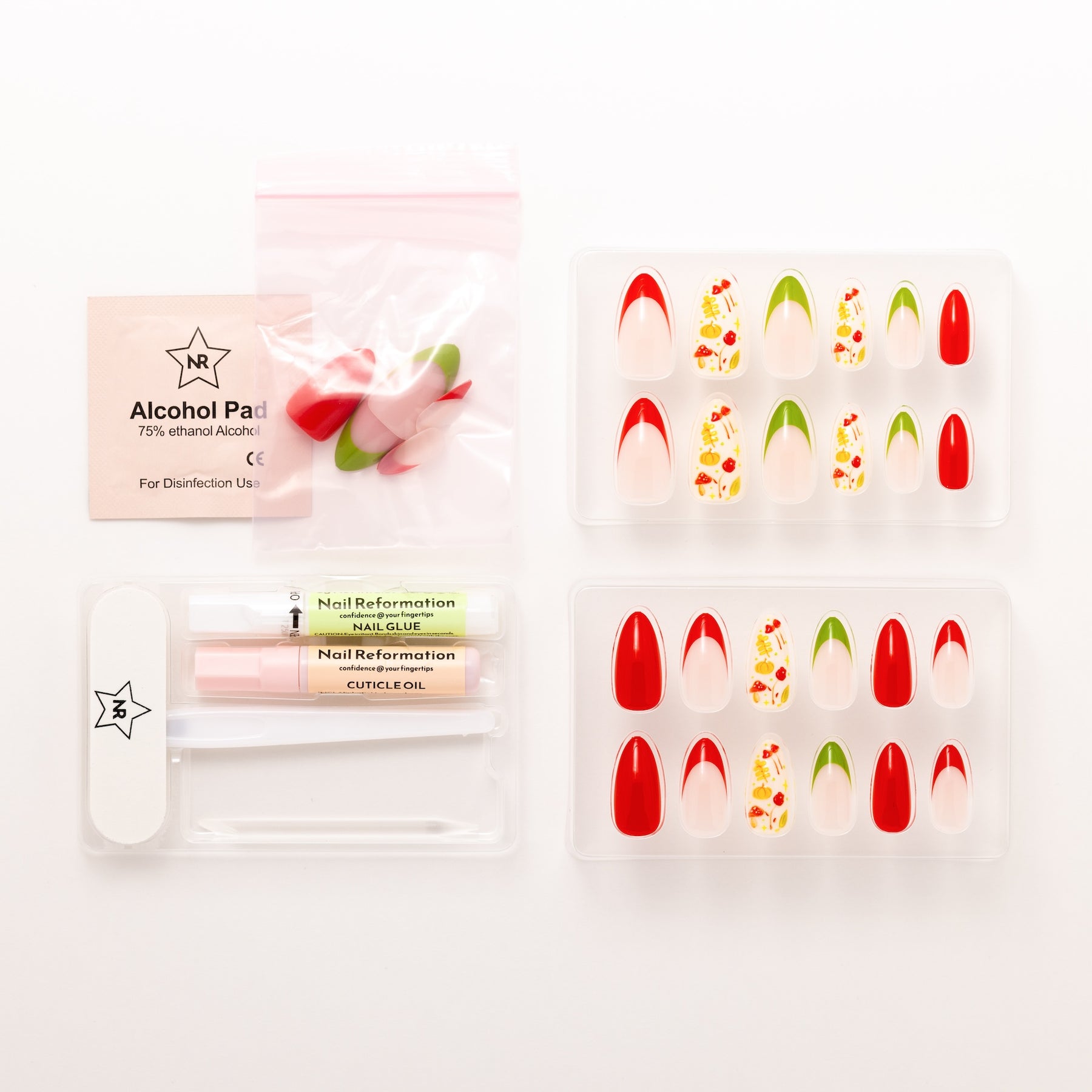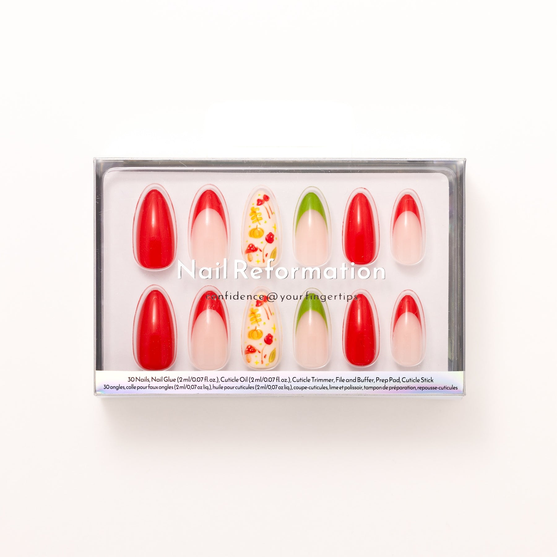 Gourd Times press-on nails deliver cozy vibes in a cheeky, creative way. These medium almond press-on nails feature glossy French tips, caramel swirl accents, and hand-illustrated autumn icons like pumpkins, mushrooms, and falling leaves. With its playful yet polished design, this set turns your manicure into a full-on fall moment. Perfect for pumpkin spice lovers, fall nail art fans, or anyone craving an easy-to-apply autumn nail design that stands out in the patch. Just press on and bring the gourd vibes wherever you go.