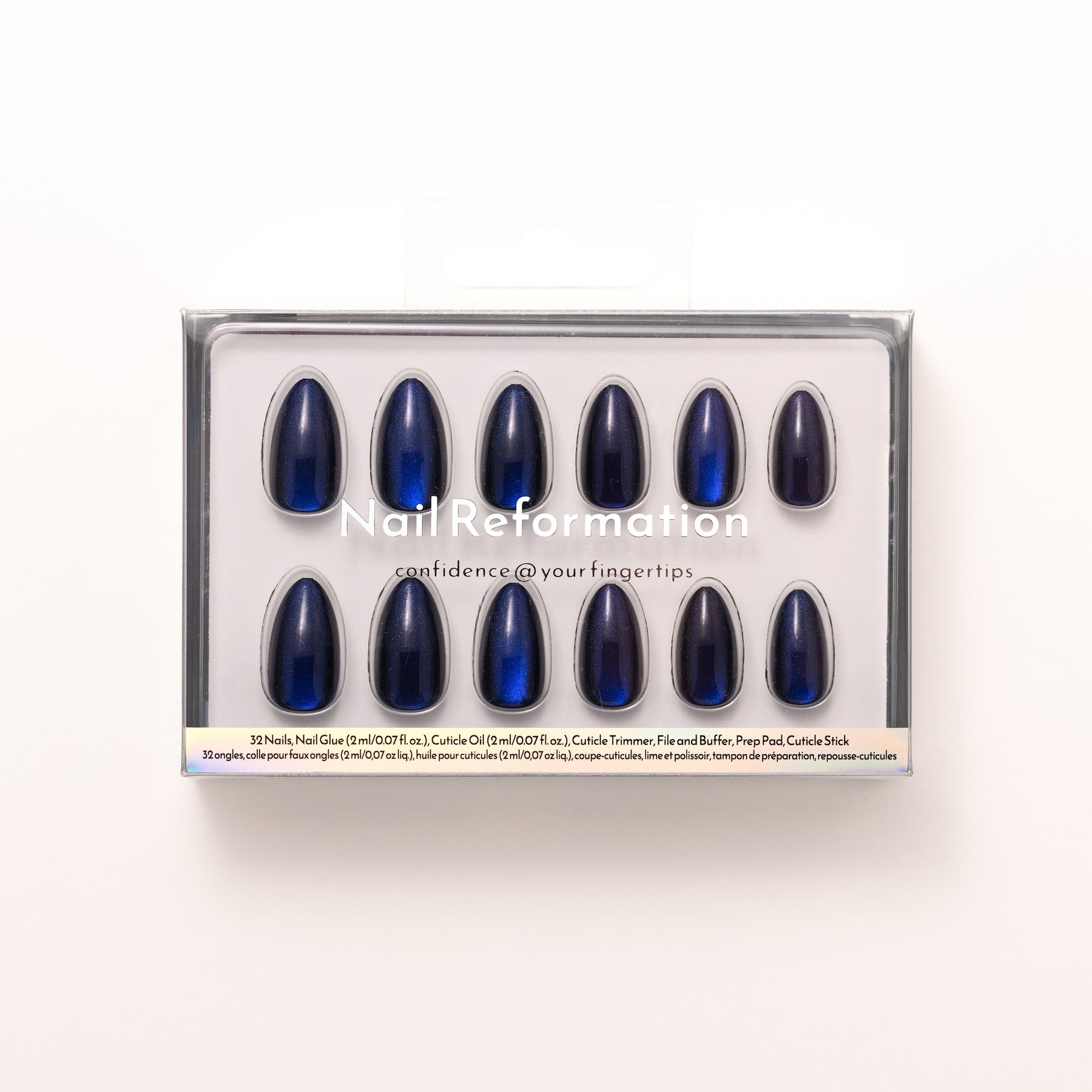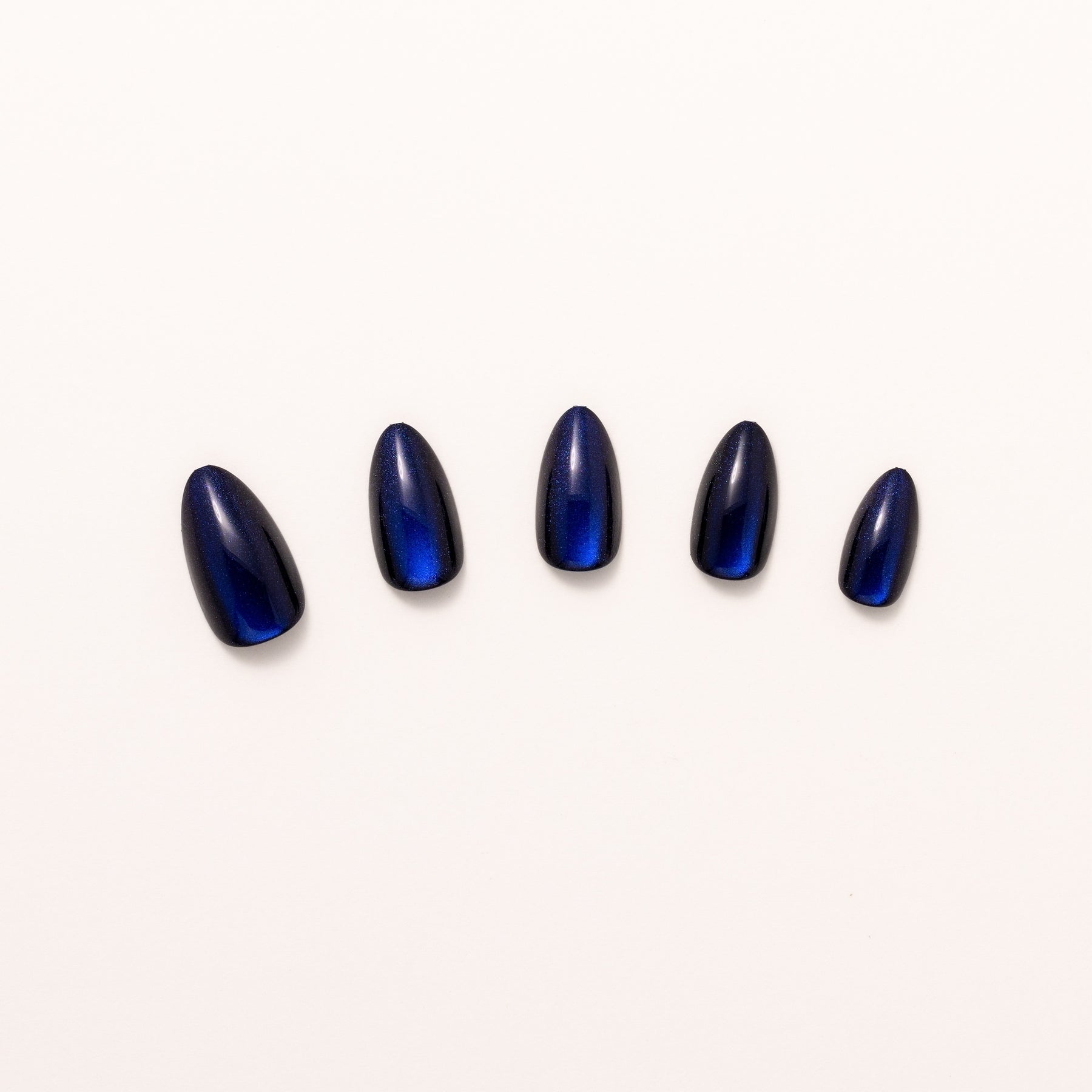 Cosmic Blue press-on nails plunge into the depths of deep space with a rich, navy-indigo hue and a magnetic cat-eye effect that glides like starlight across the void. A layered nail art overlay creates cosmic dimension without bulk, while the short almond shape keeps the look sleek, sharp, and grounded. Glossy, galactic, and full of depth, this set is a portal to something bold, endless, and beautifully dark.