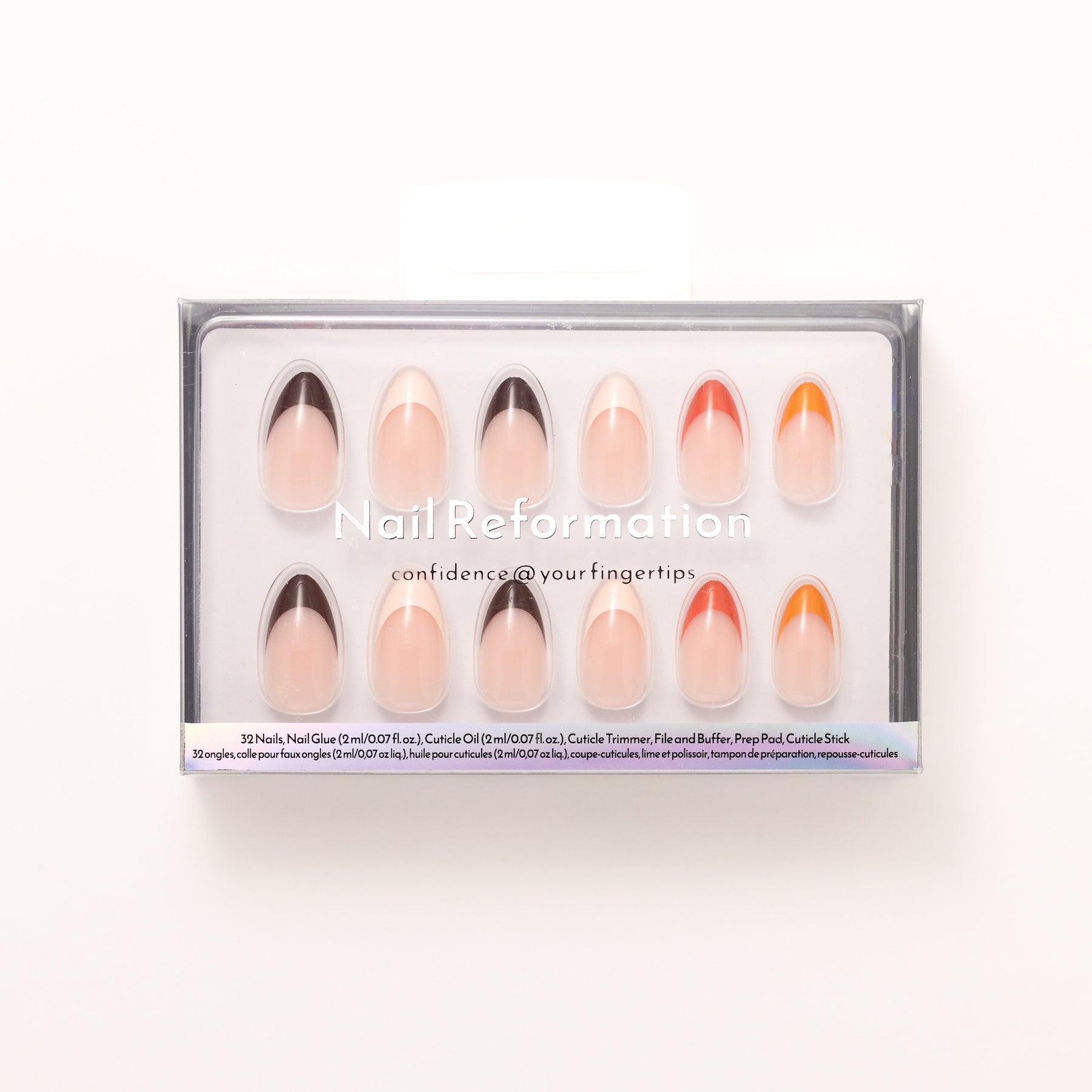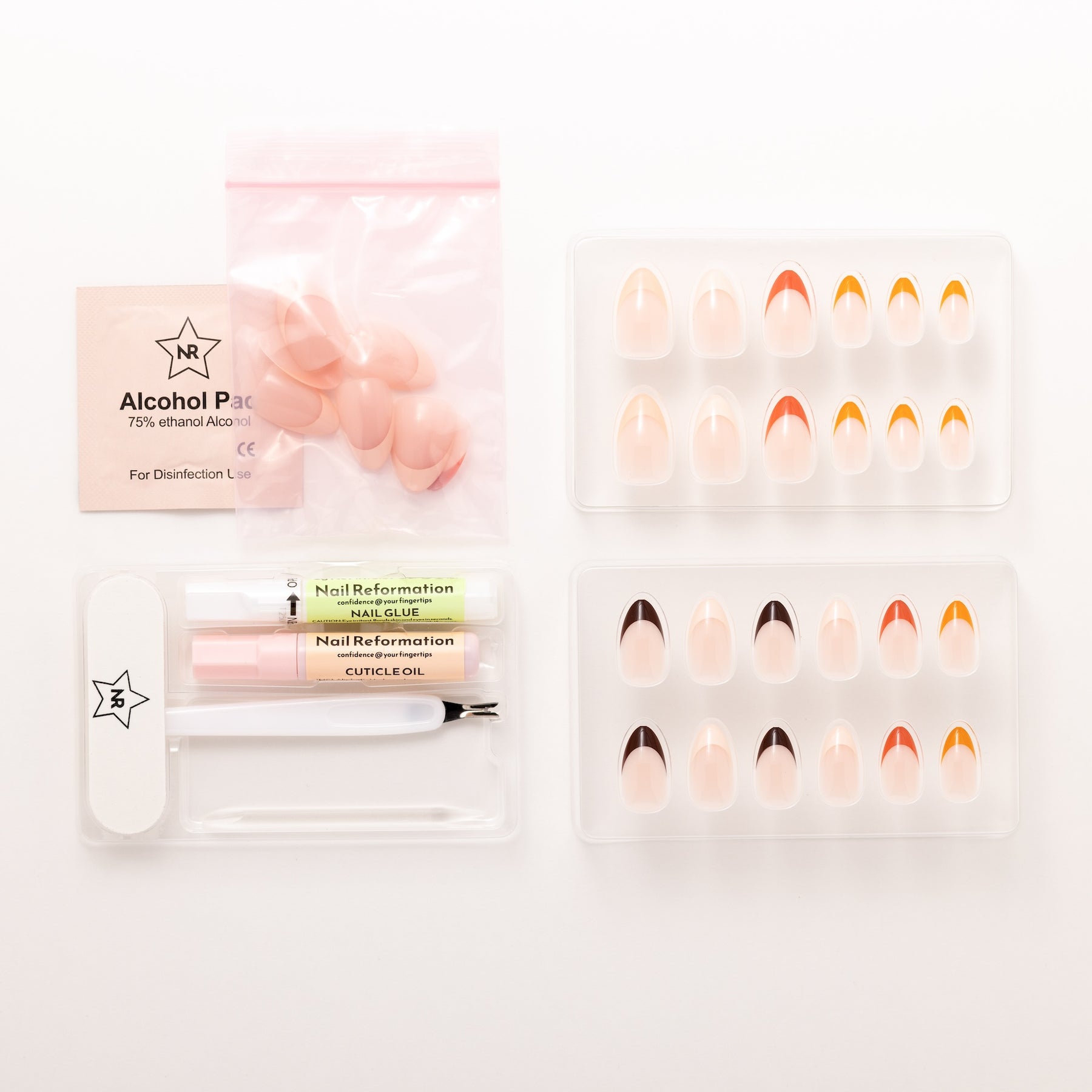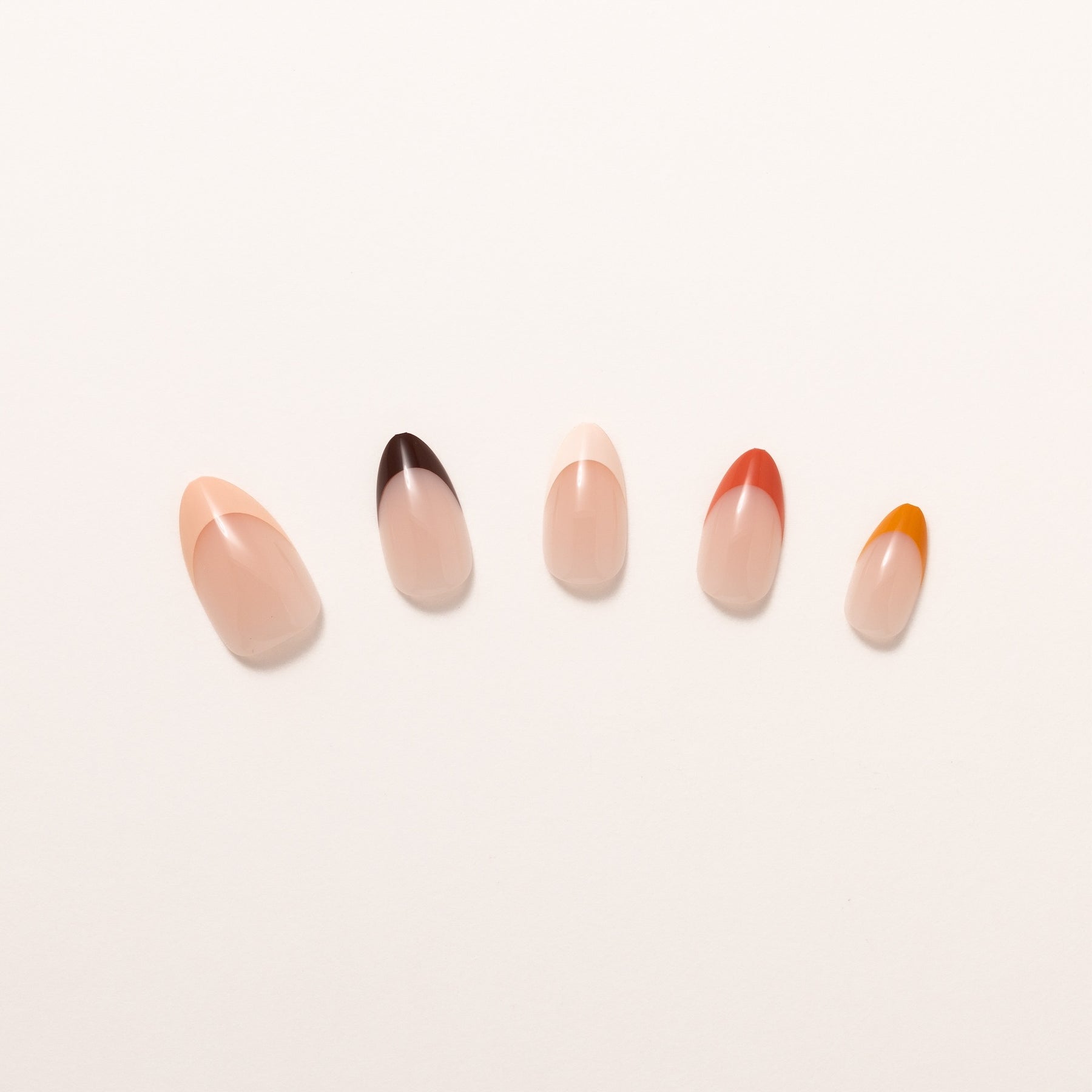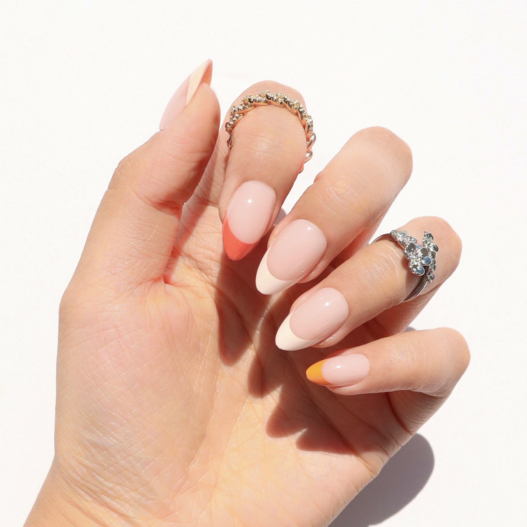 The Elegant Tones short almond press-ons reinvent the French manicure with bold, multi-hued tips in red, gold, black, peach, and ivory. Each shade feels like a snapshot of Paris after dark, where every corner glows under café lights and neon reflections. A soft nude base keeps the look refined, while the glossy top coat effect seals in shine for a polished finish. Sophisticated yet playful, this set is a modern tribute to the City of Lights, a French tip that shines in full spectrum.