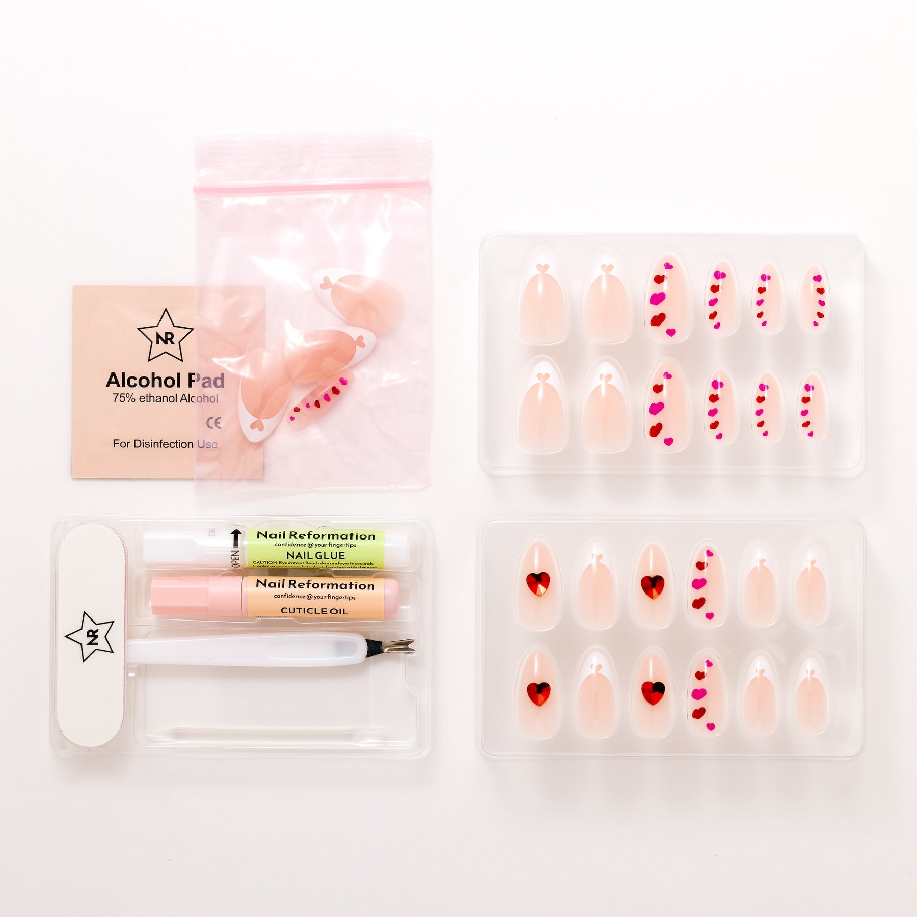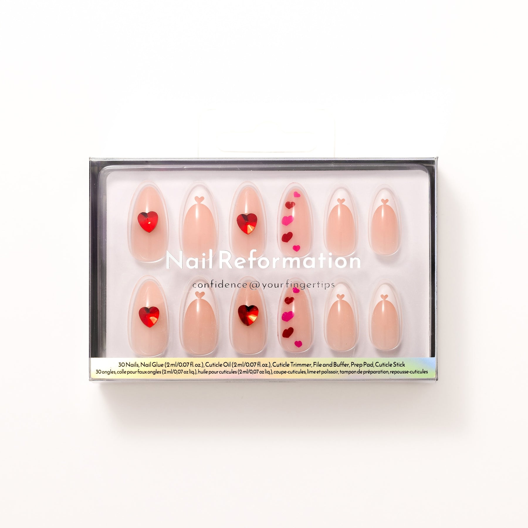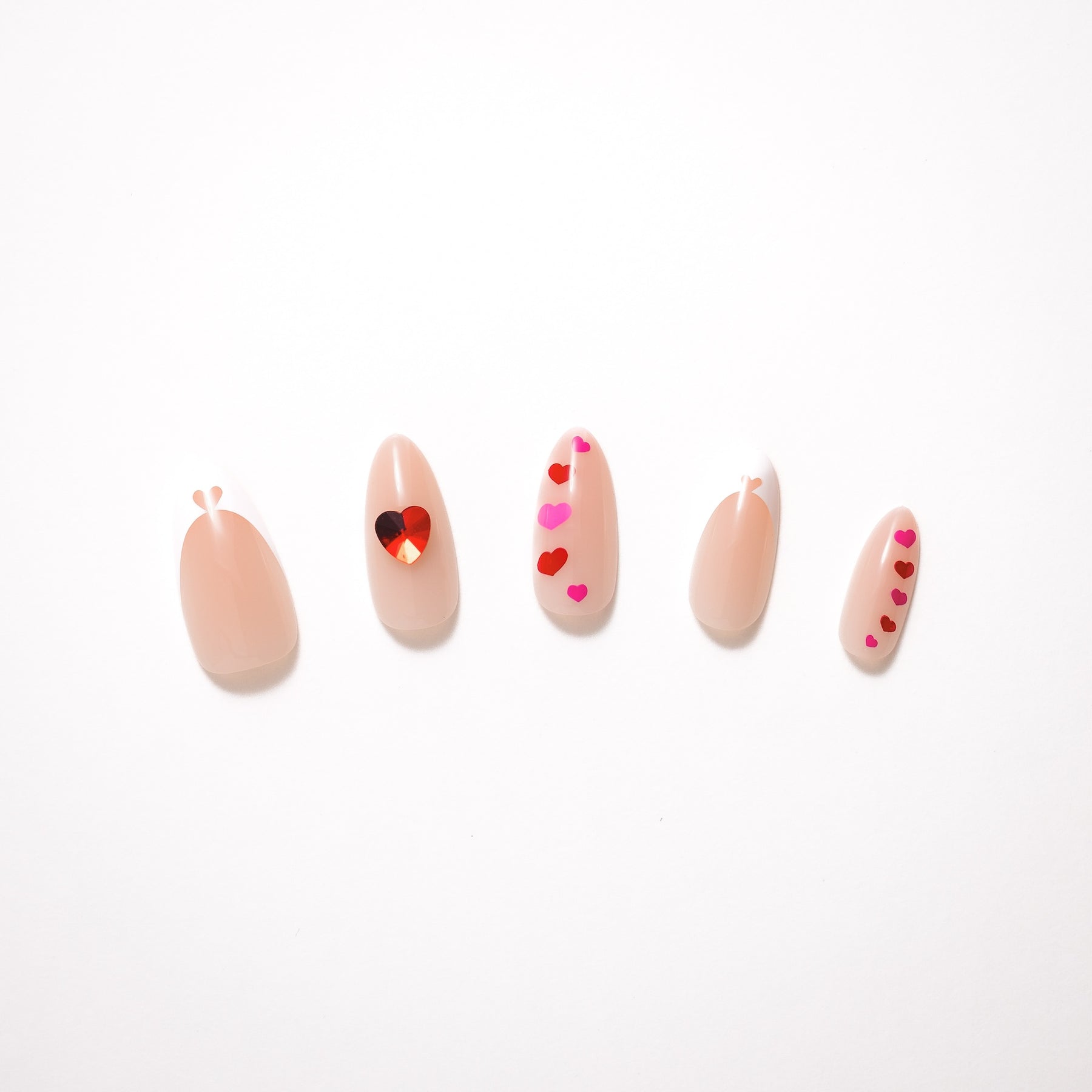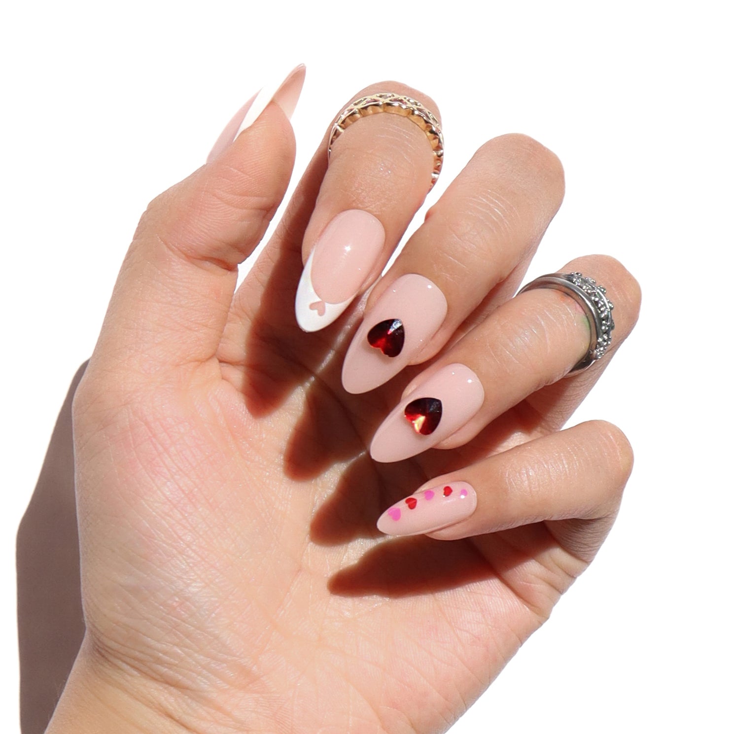 Head over heels. The Falling For You press-ons capture that rush of falling fast with soft French tips and hearts that drift downward like love taking hold. A radiant jeweled accent adds a spark of devotion, while the glossy almond finish keeps it sleek and timeless. Subtle yet sentimental, it’s a look that perfectly mirrors the feeling of falling for someone.