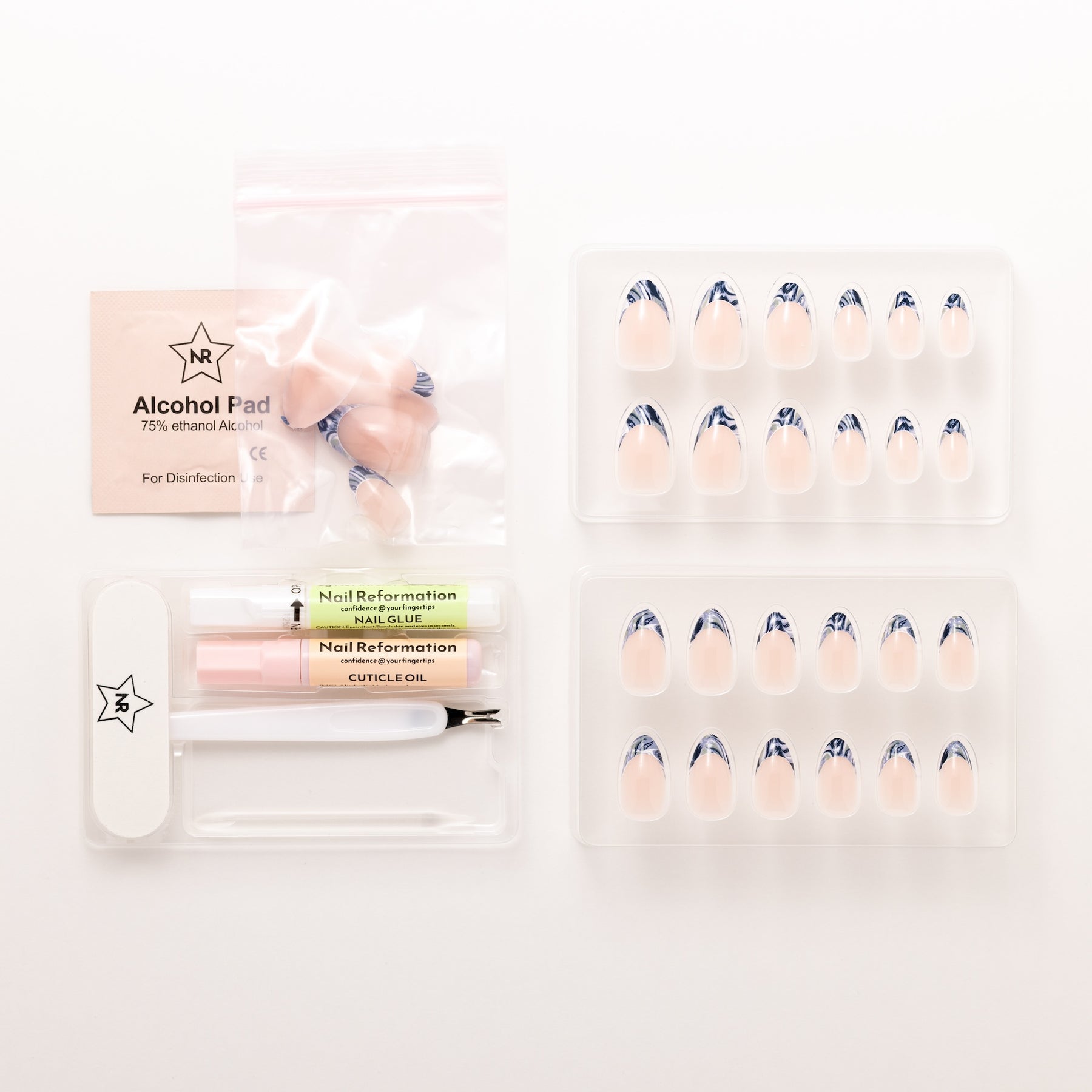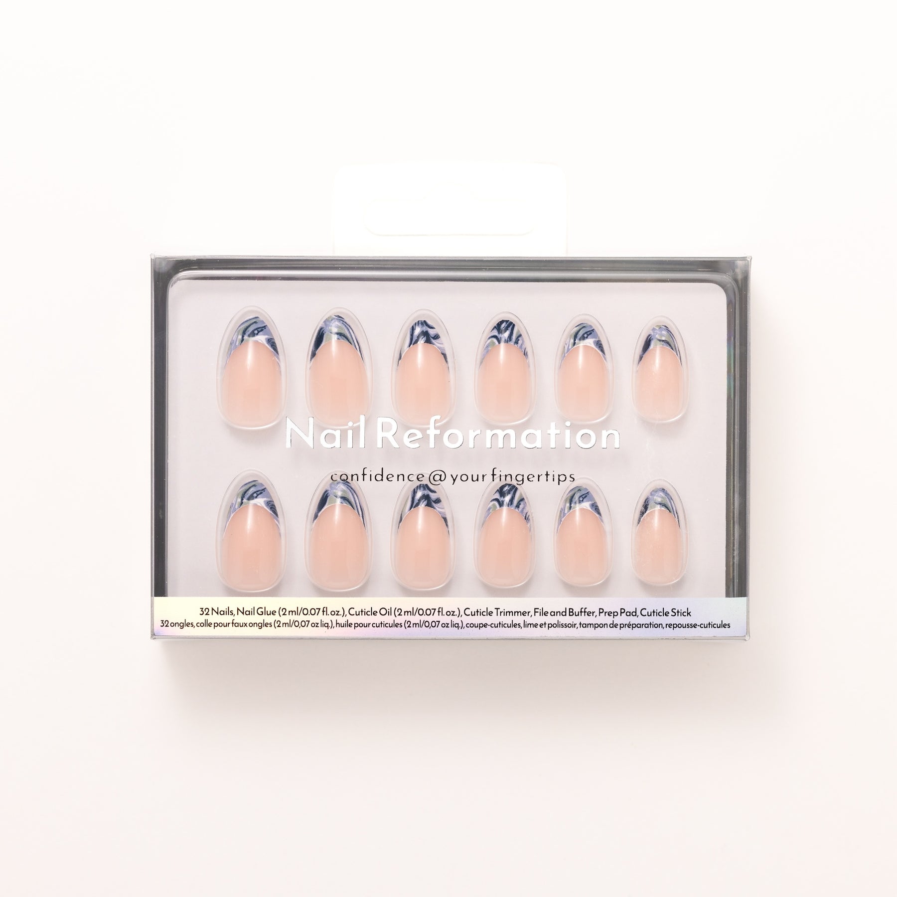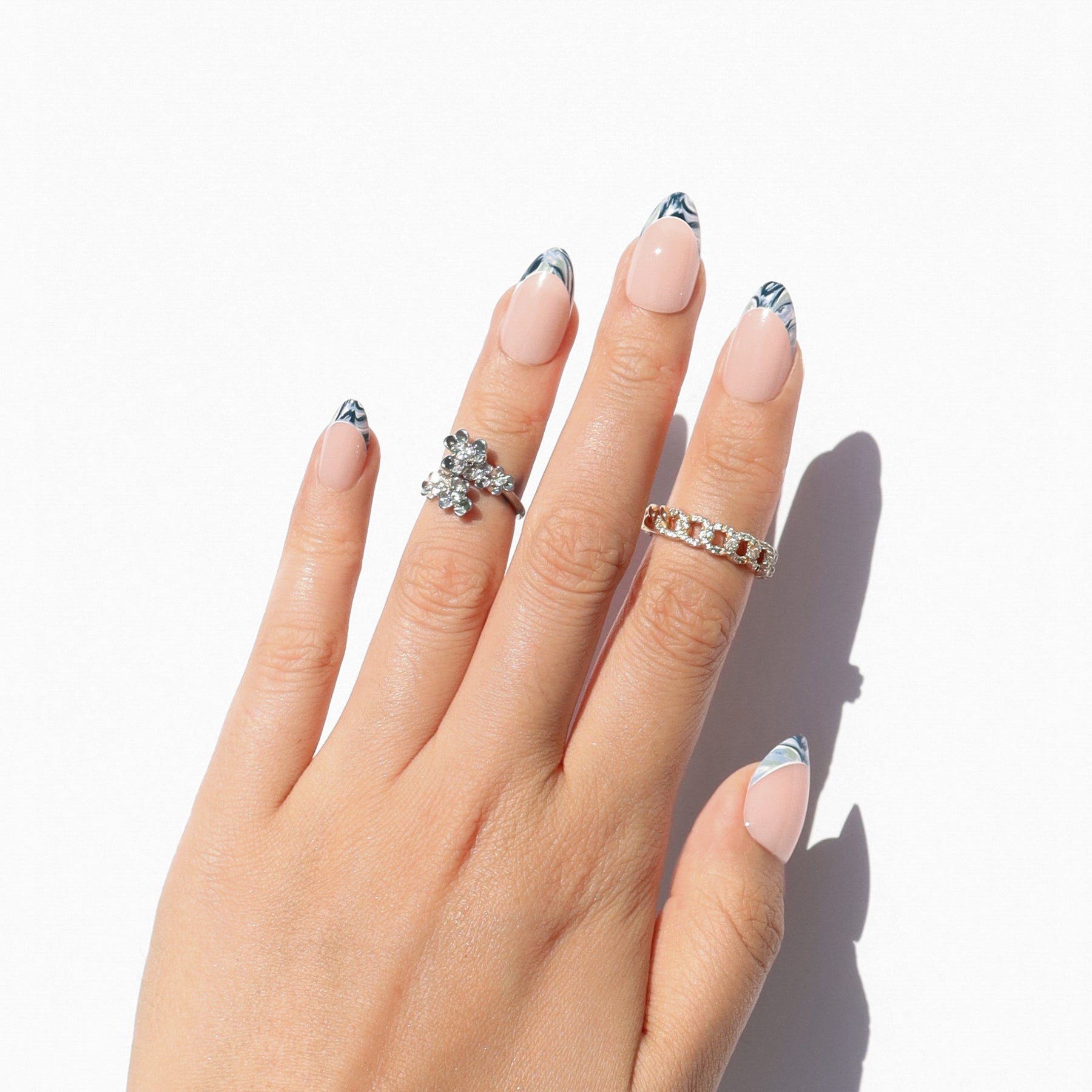The French Marble short almond press-ons reimagine a timeless French manicure with a luxe marble nail art effect. Crisp black-and-white swirls replace the standard white tip, giving each nail the look of sculpted stone polished to perfection. A glossy top coat effect locks in shine, while the almond shape keeps it chic and universally flattering. Minimal yet striking, it’s a fresh take on French that feels both classic and cutting-edge.