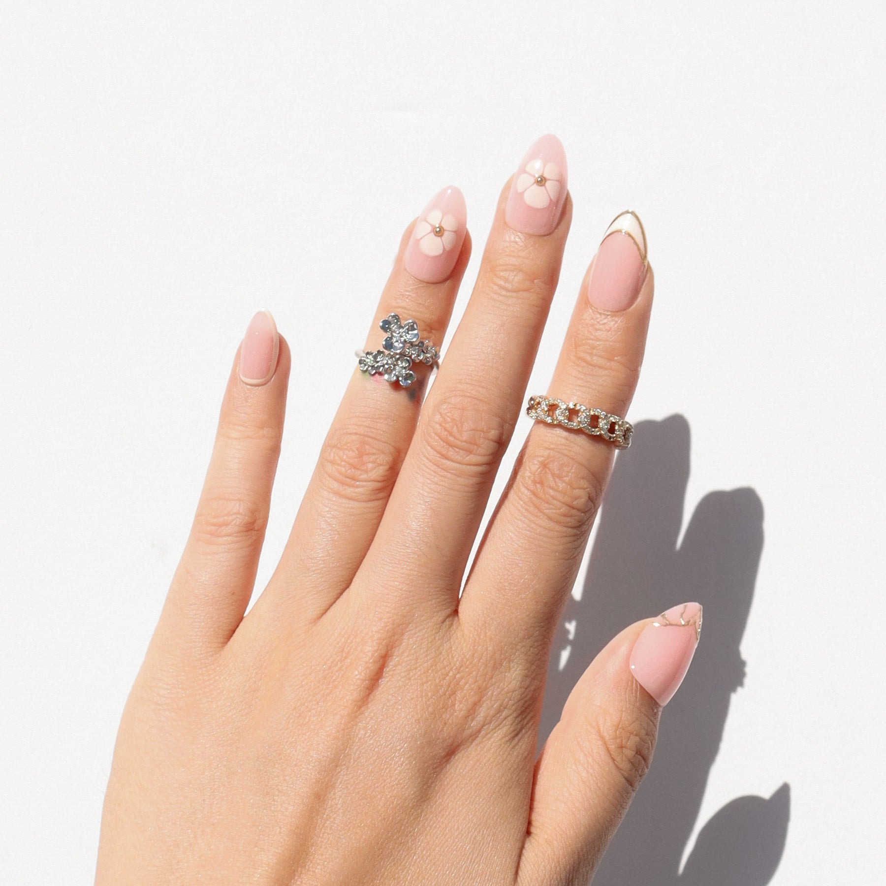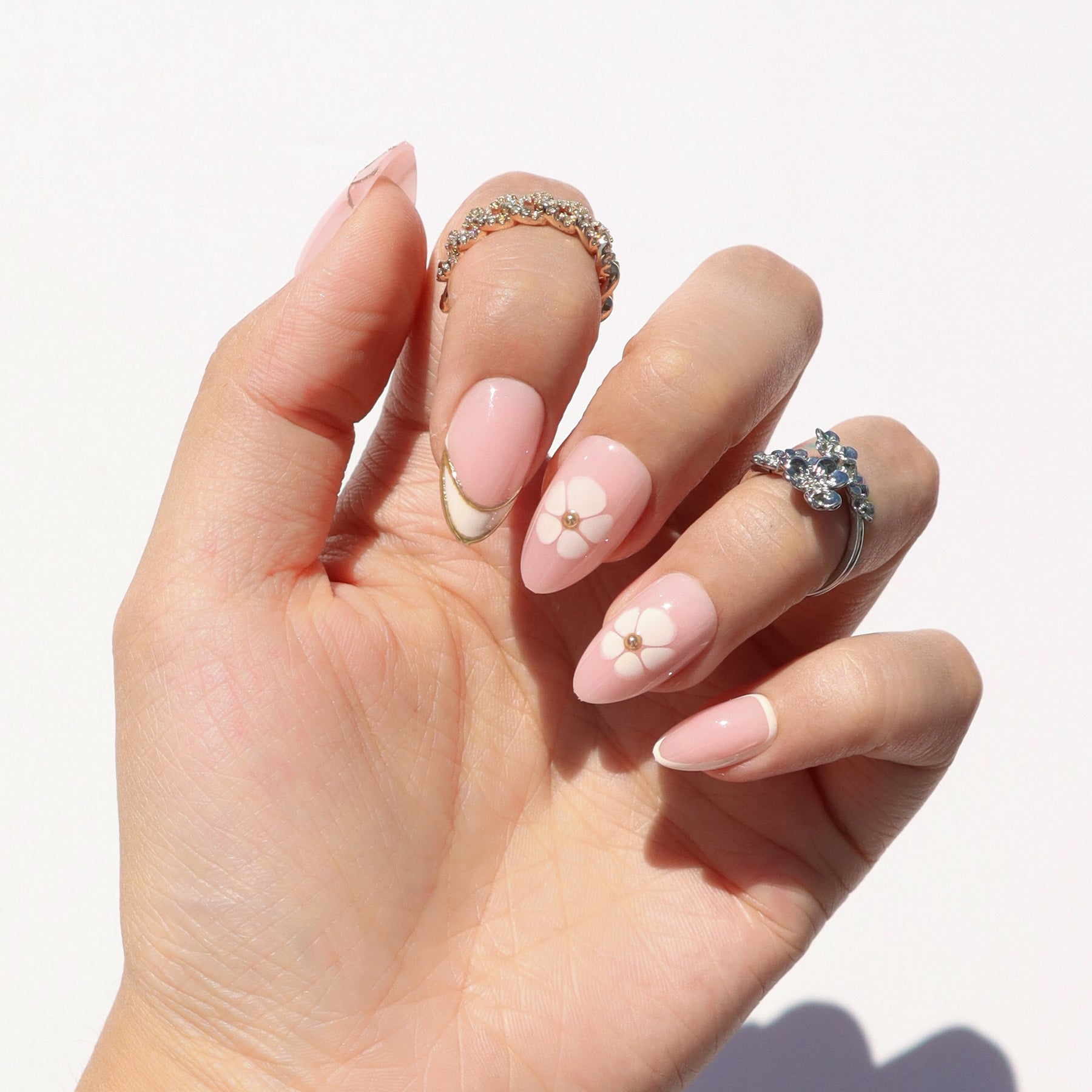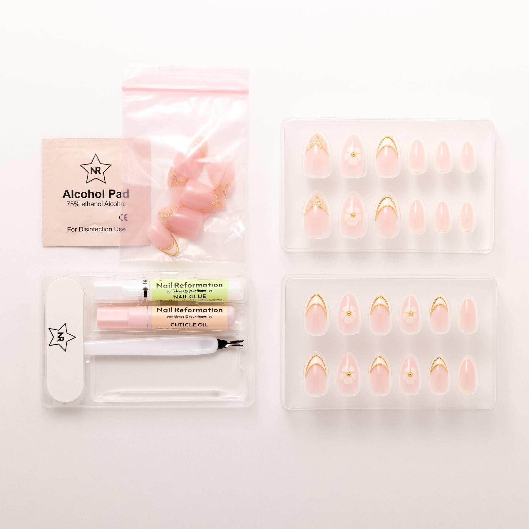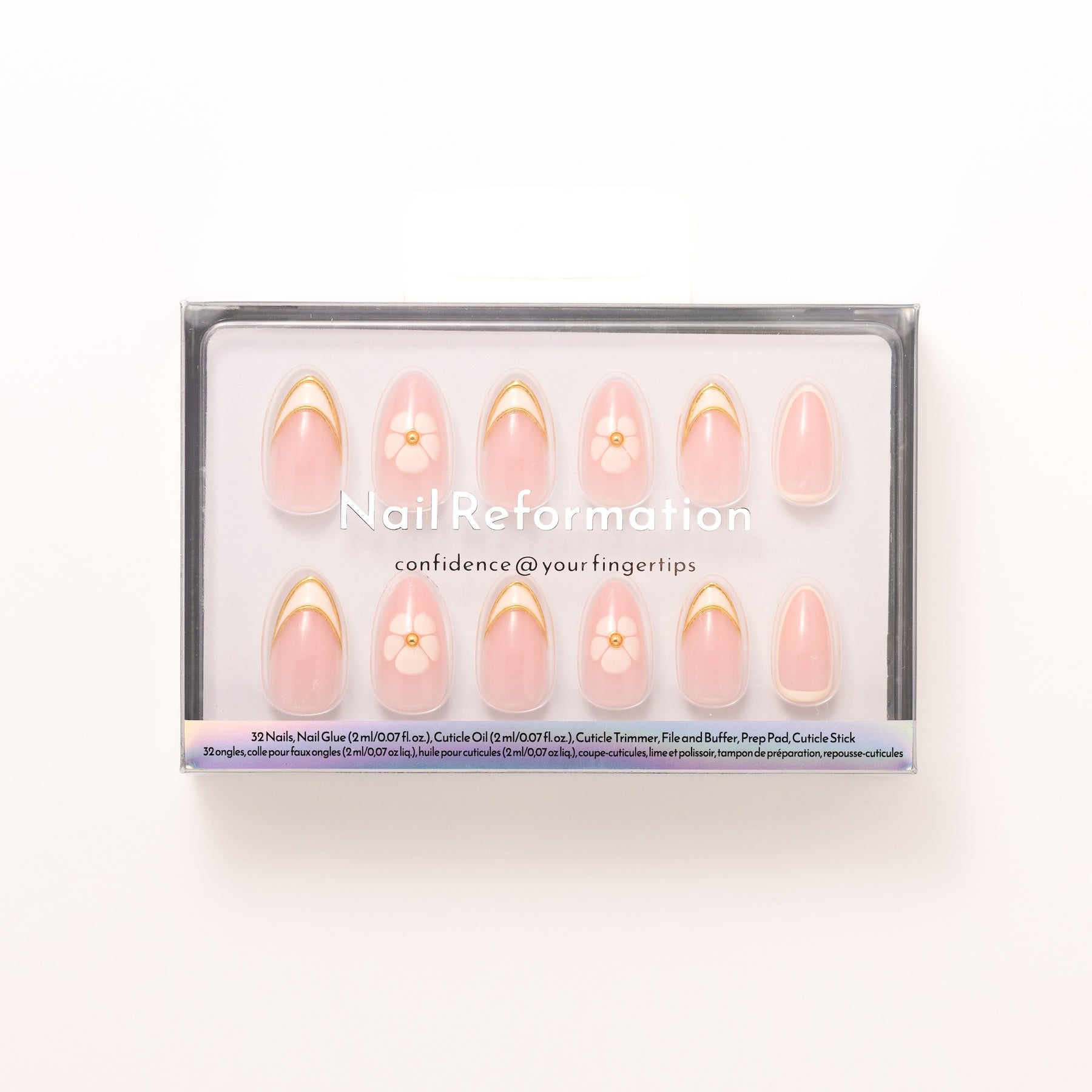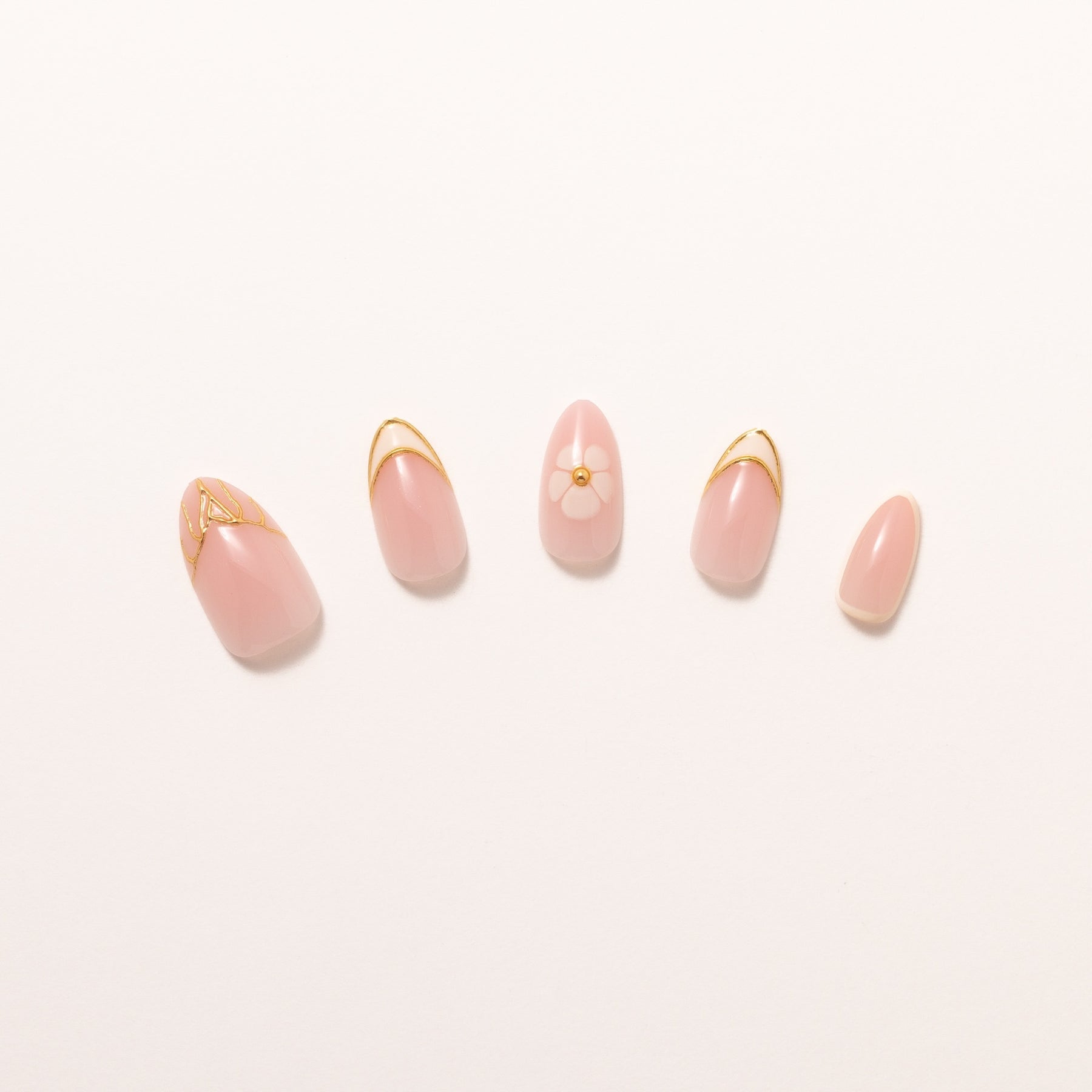 The Gilded Lily short almond press-ons bring a refined, ornamental touch with soft blush tones and intricate gold accents. Inspired by the elegance of lily petals and finished with gleaming details, this set offers a look that feels both fresh and opulent. With its delicate shape and radiant design, Gilded Lily turns every gesture into a statement.