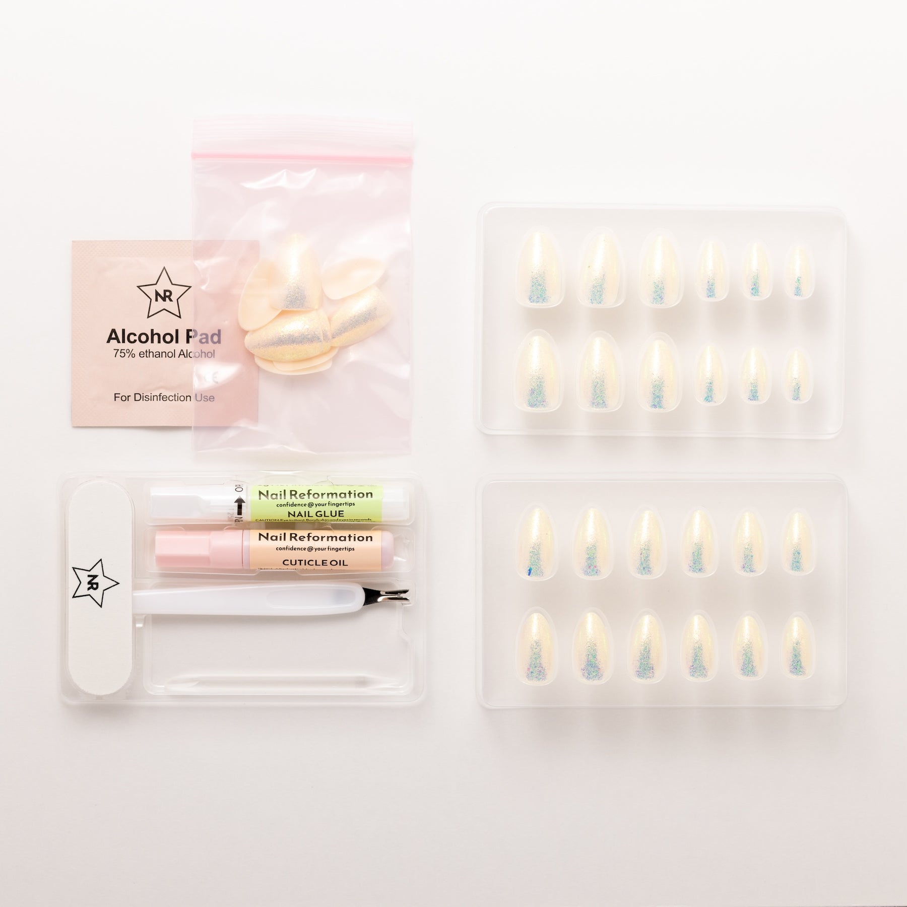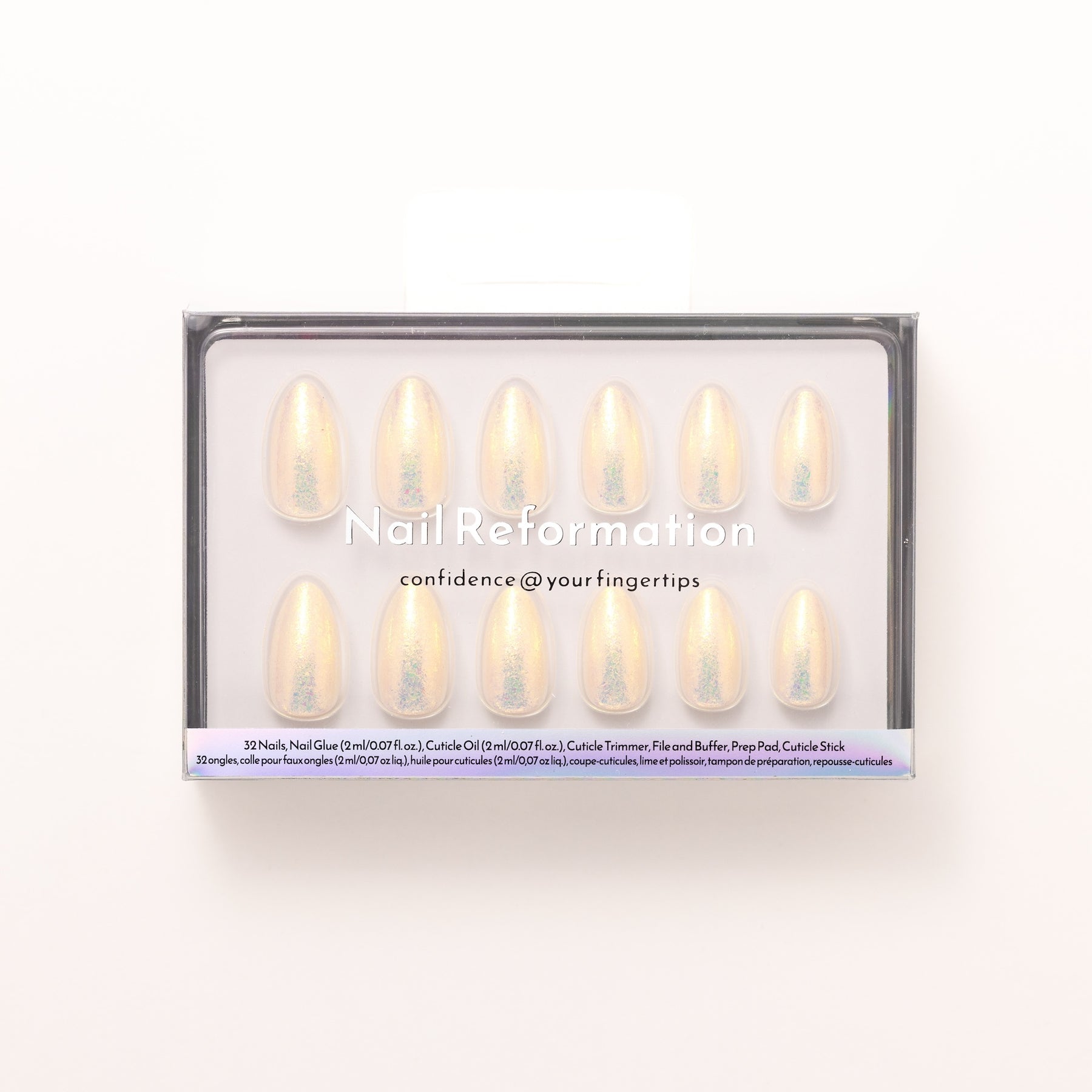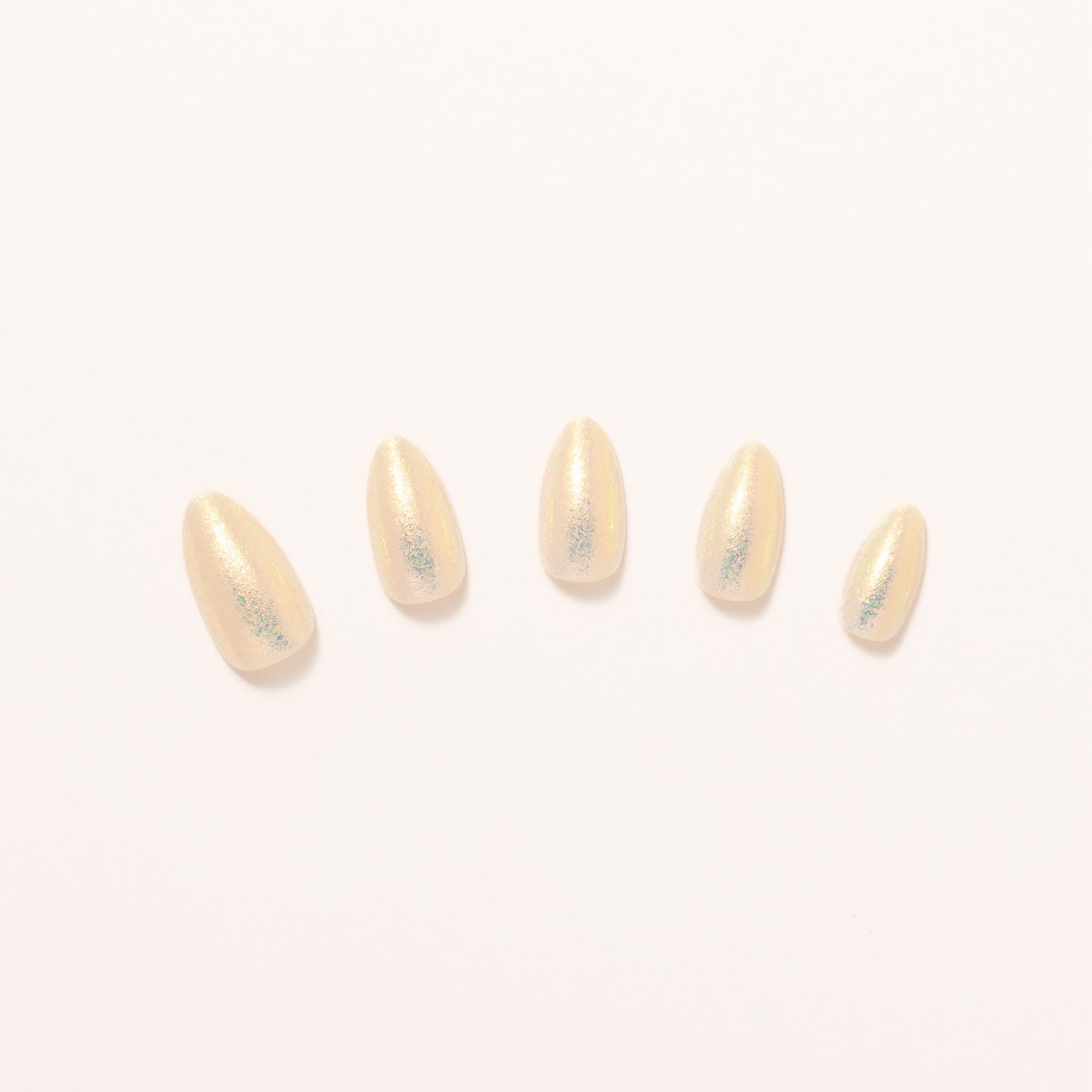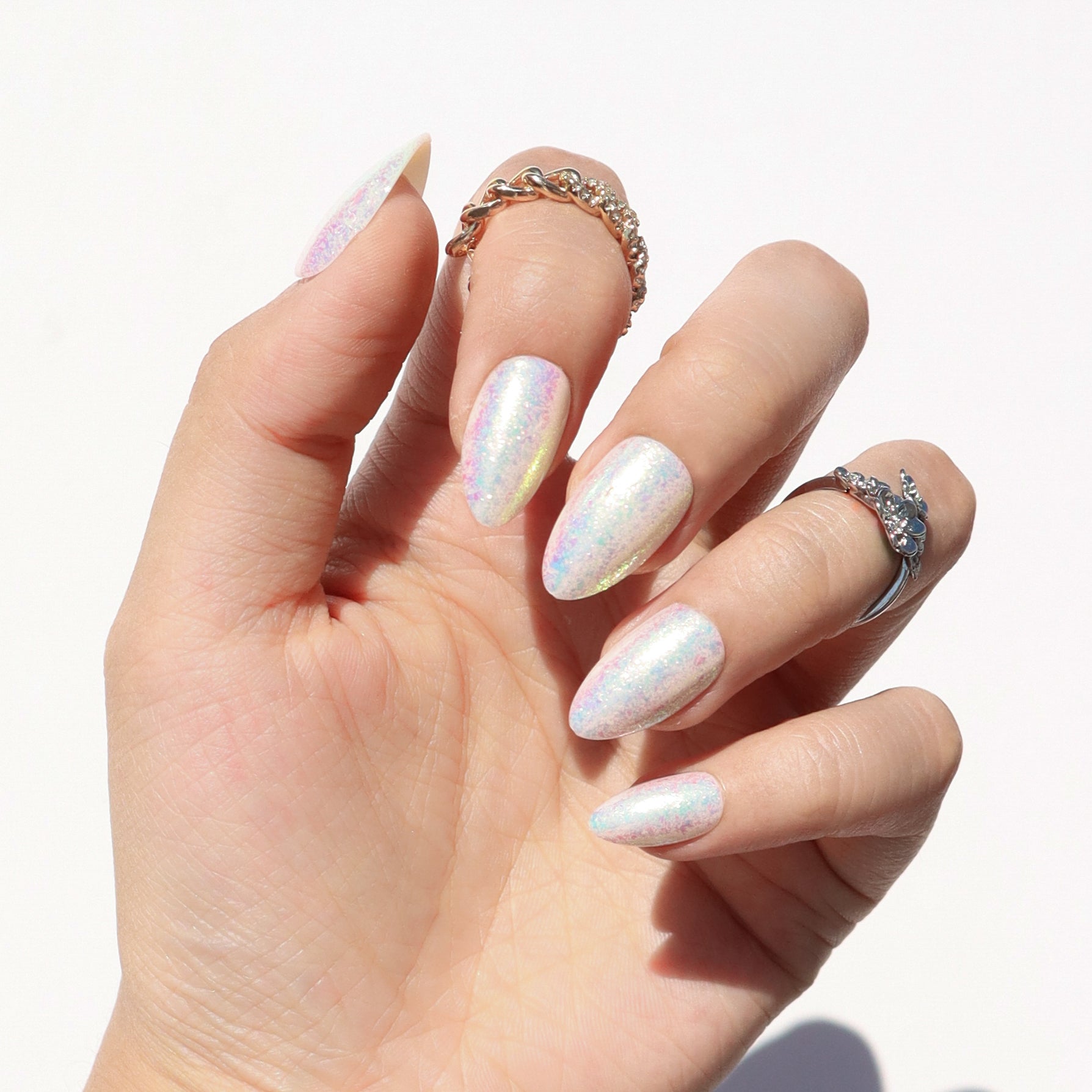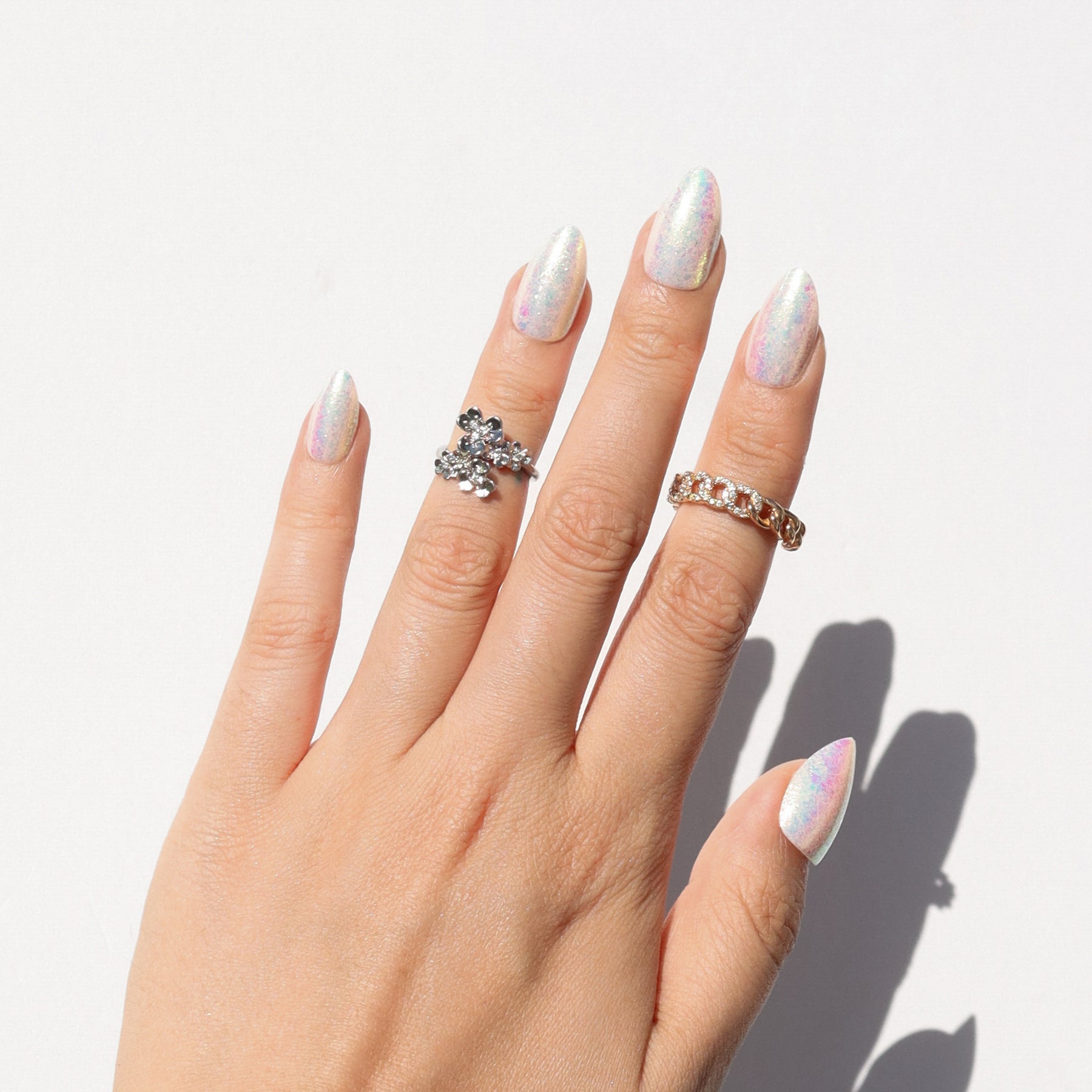 The Glow Light short almond press-ons beam with a luminous nail art effect that shifts from soft gold to iridescent violet with every movement. A glossy finish layers over the surface, creating a glow that feels both ethereal and modern. Sculpted in a sleek almond silhouette, these nails balance subtle radiance with statement shine. It’s the kind of light you don’t just see, you wear.