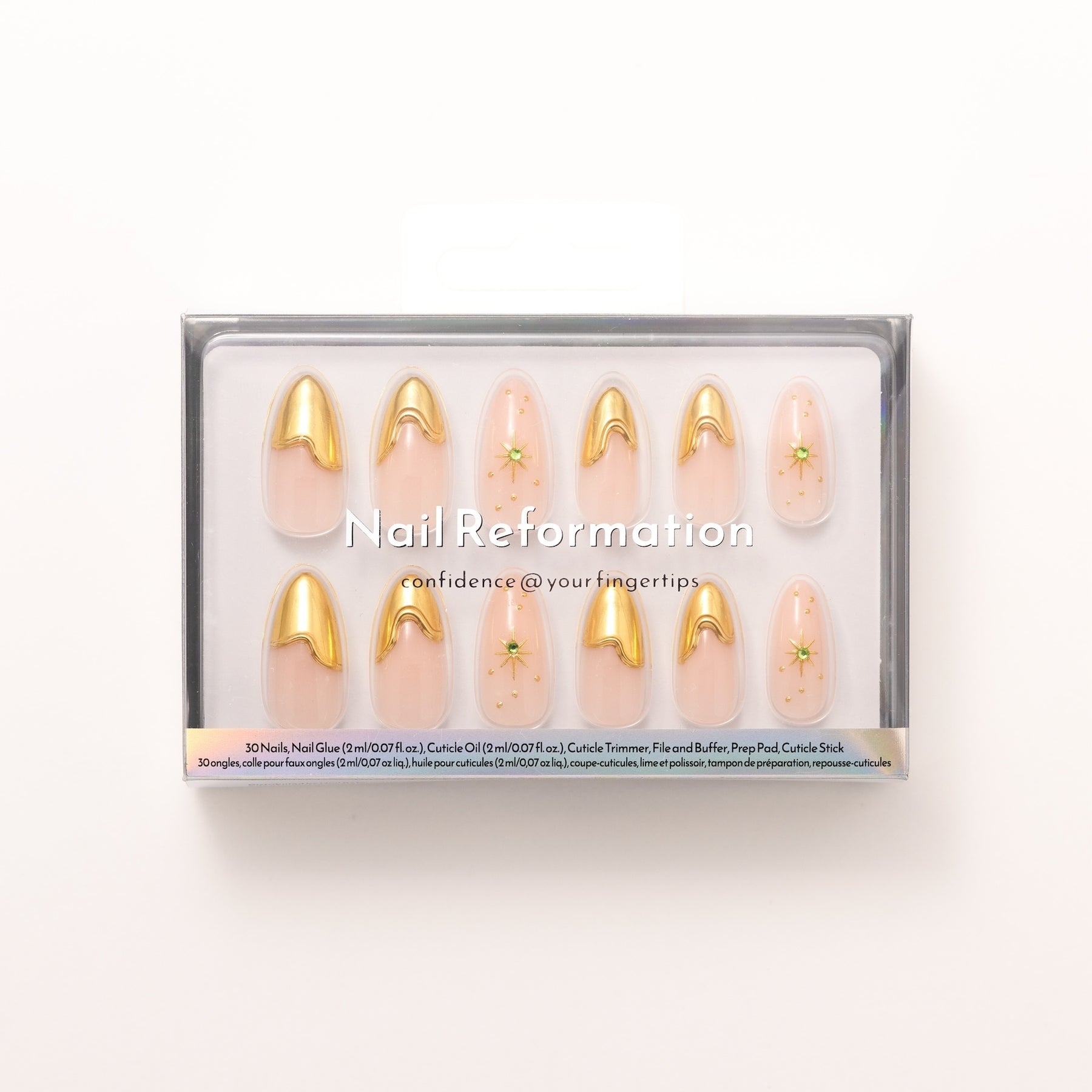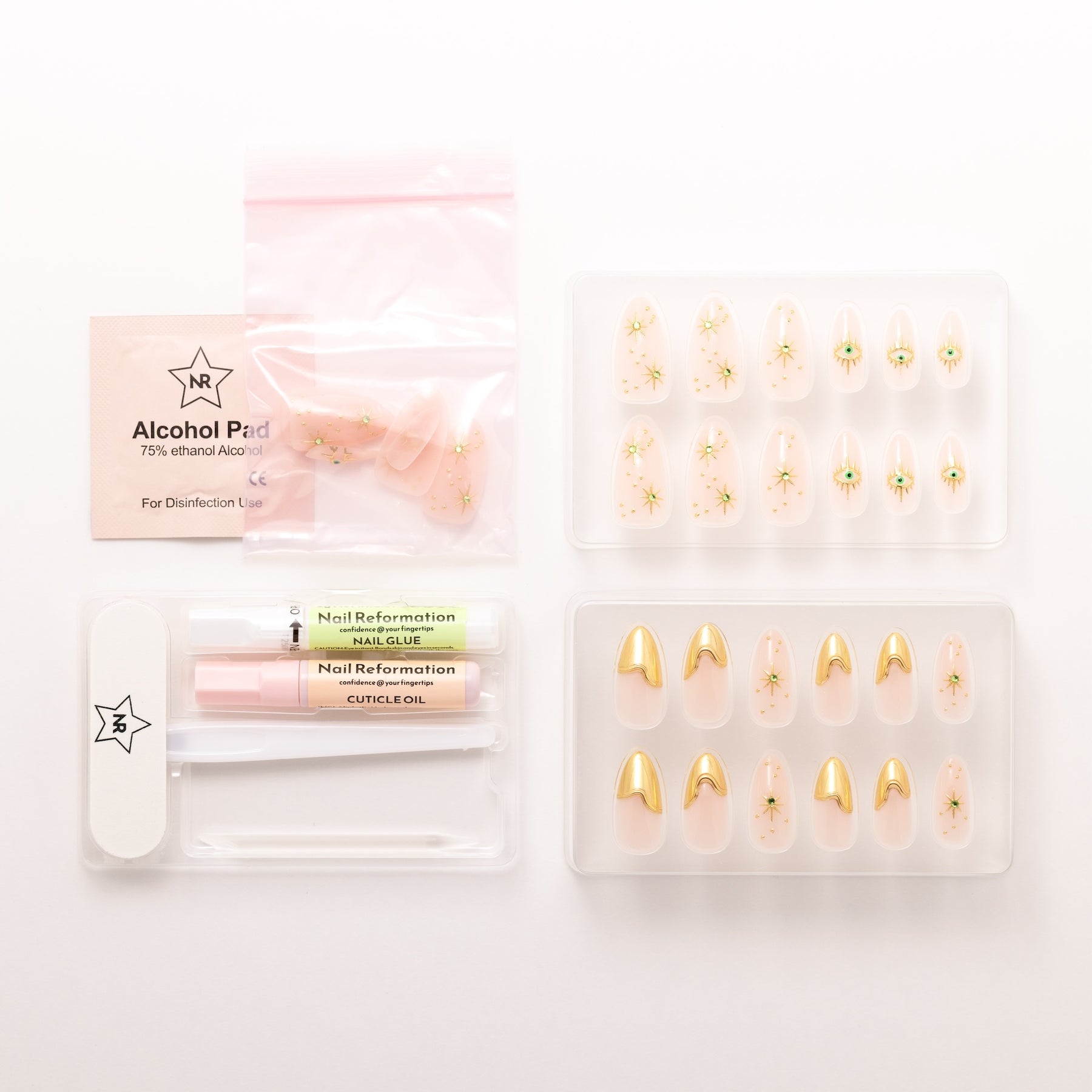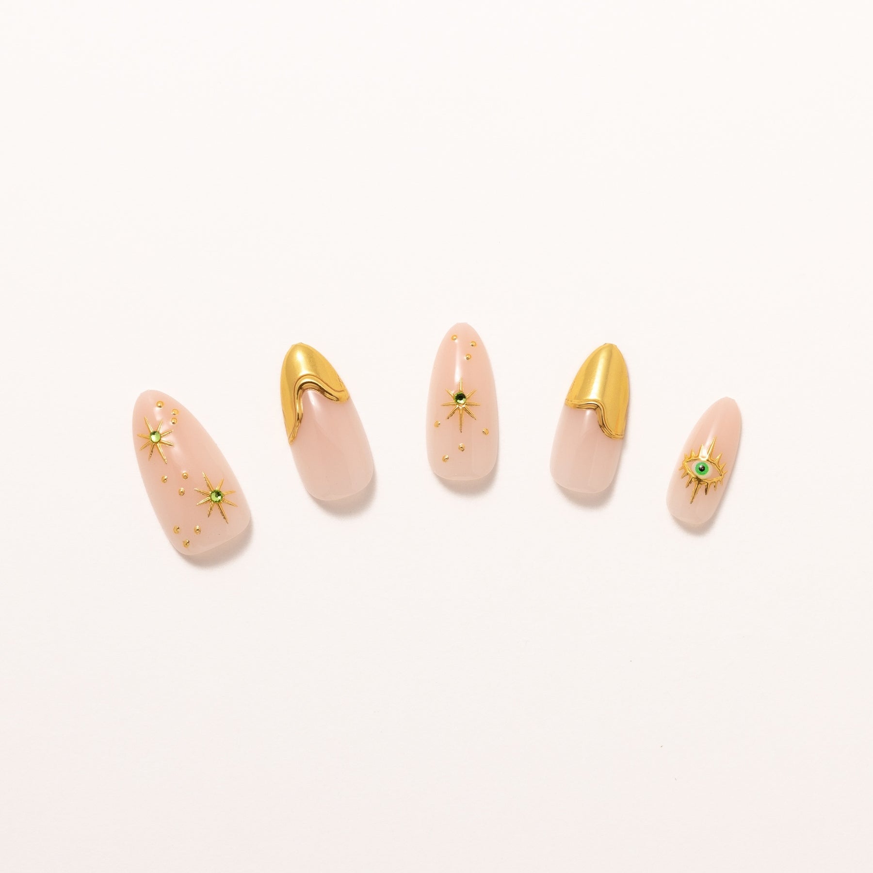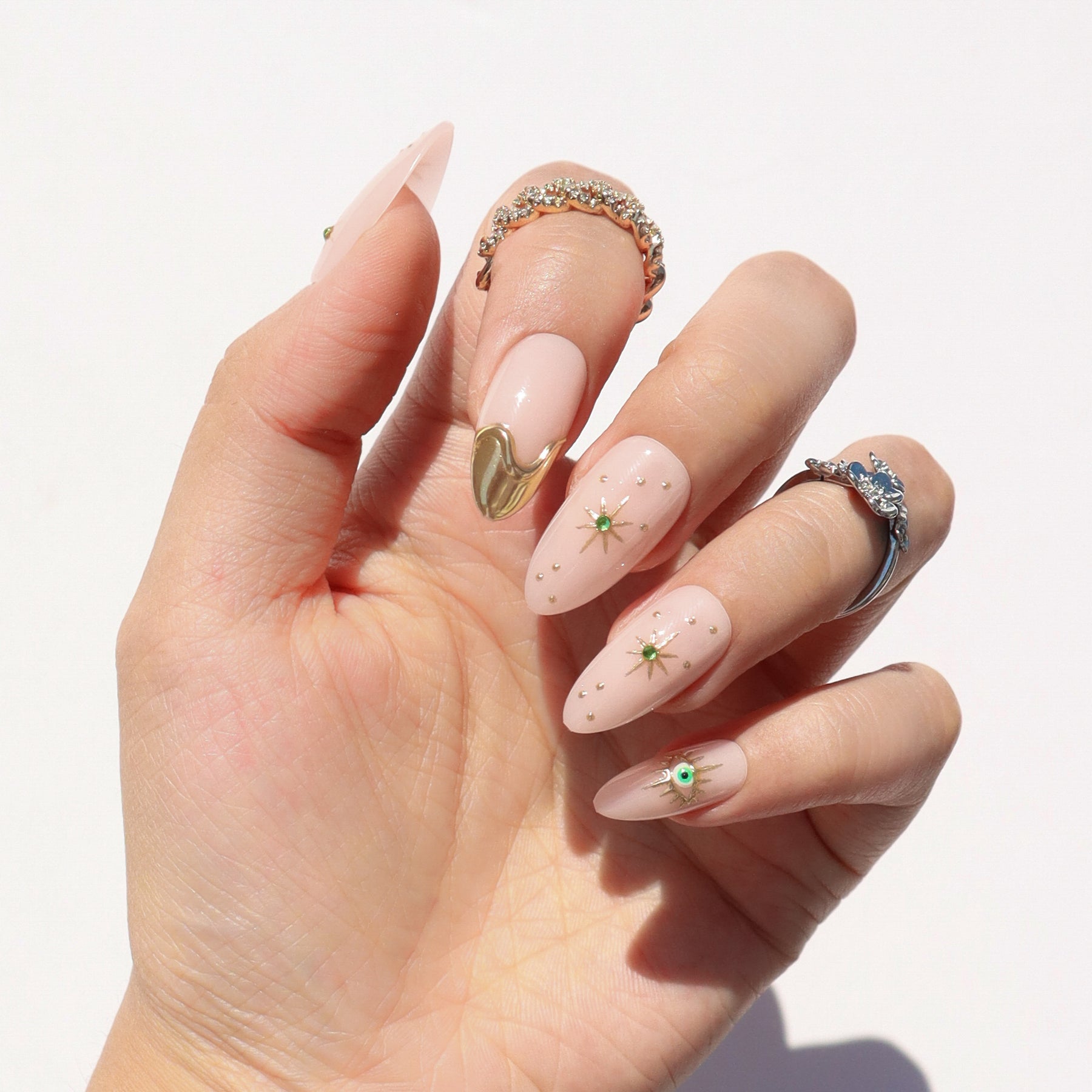 The Gold Suns press-on set turns up the shine with rich gold overlays, radiant starbursts, and luxe details that catch the light from every angle. The medium almond shape elongates the fingers while staying wearable, and the nude base keeps the look elevated and elegant. From the high-shine molten tips to the delicate green-gem centers, every detail is crafted to bring warmth, brilliance, and boldness to your everyday style. It’s a golden-hour glow for your hands, any time of day.