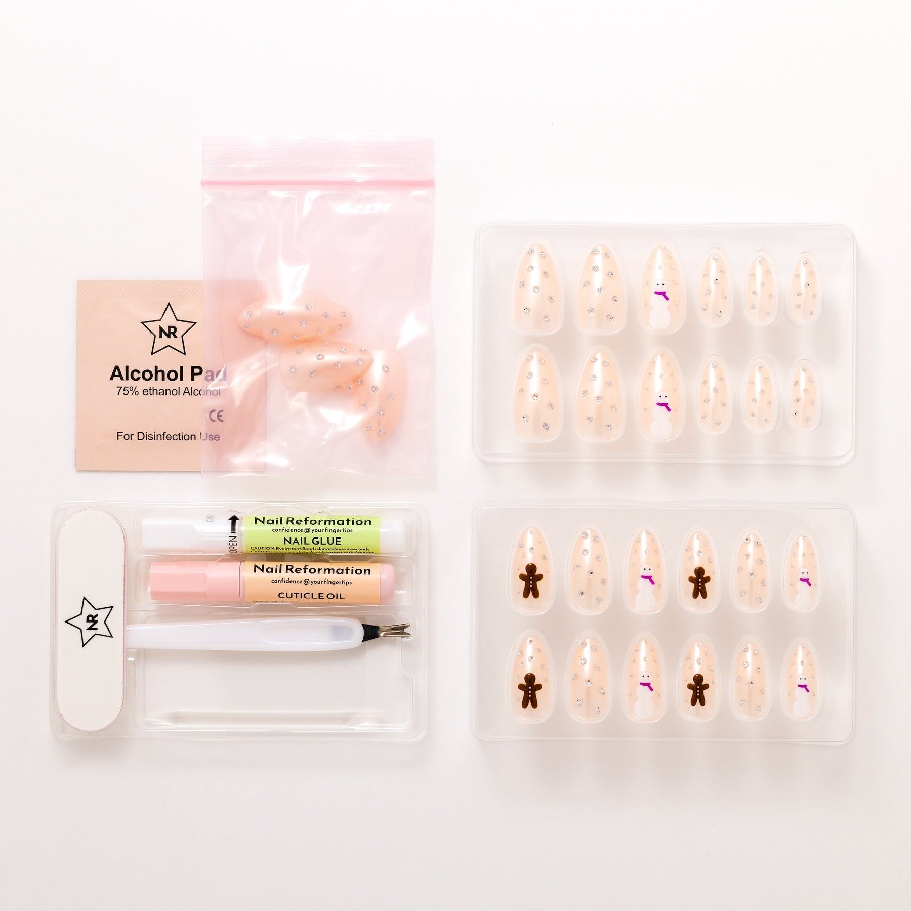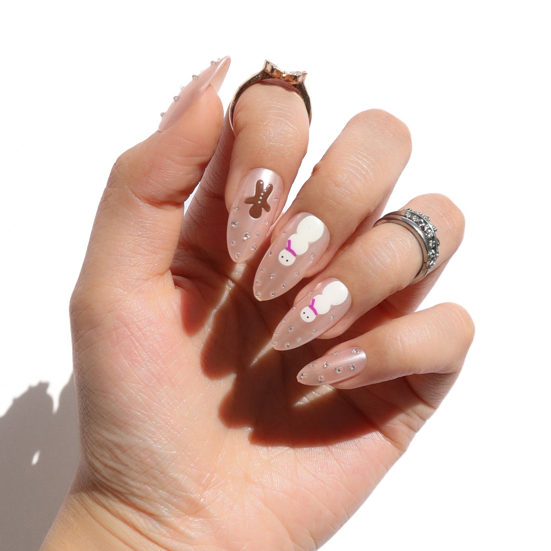 Sweetly spiced and sugar glazed. The Iced Gingerbread press-ons blend cozy charm with sparkling detail, featuring a nude glazed base dotted with silver accents and playful 3D designs of a snowman and gingerbread man. The medium almond shape adds a soft, flattering touch, making this set as sweet as it is stylish. Perfect for fireside parties or festive nights out, it’s a holiday treat for your fingertips.