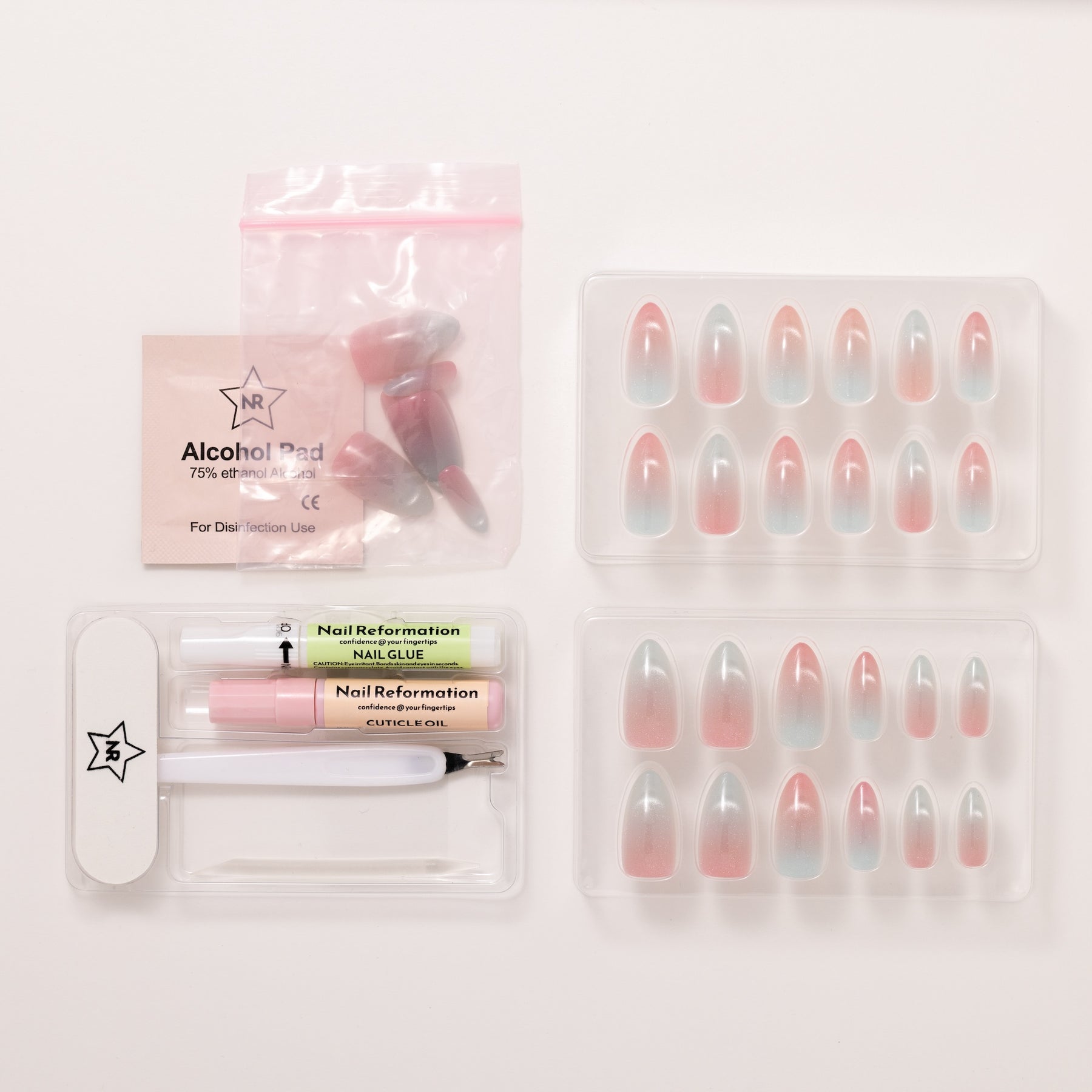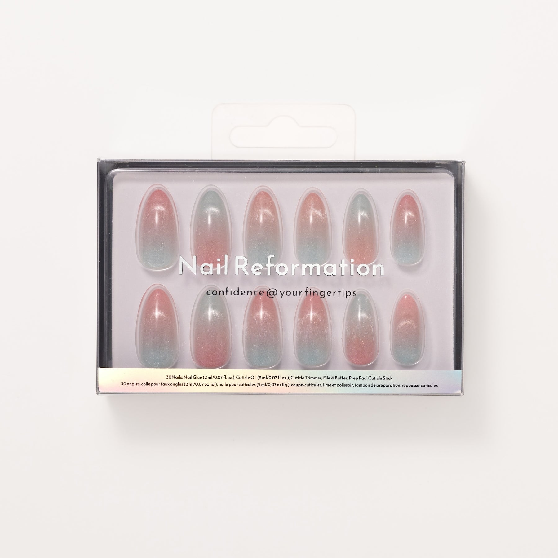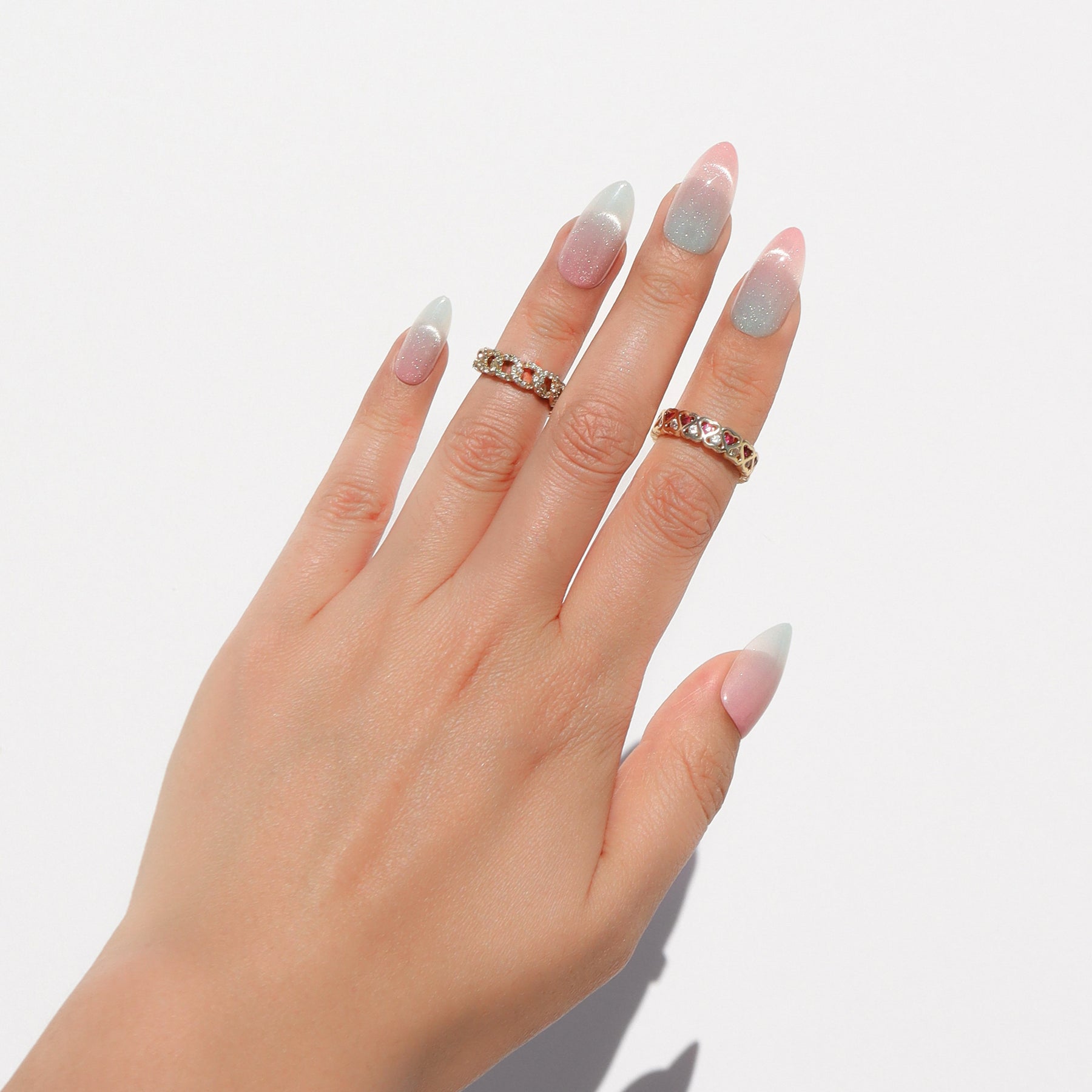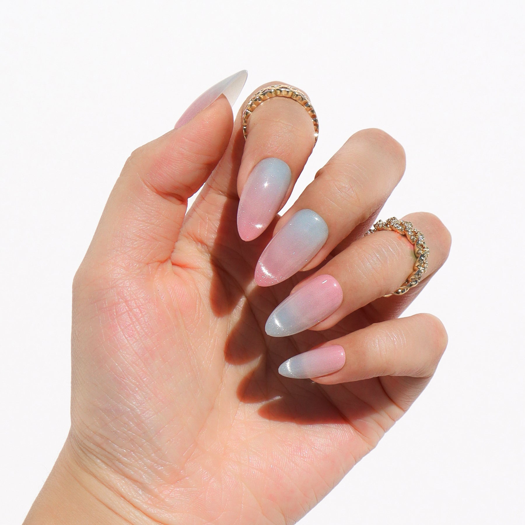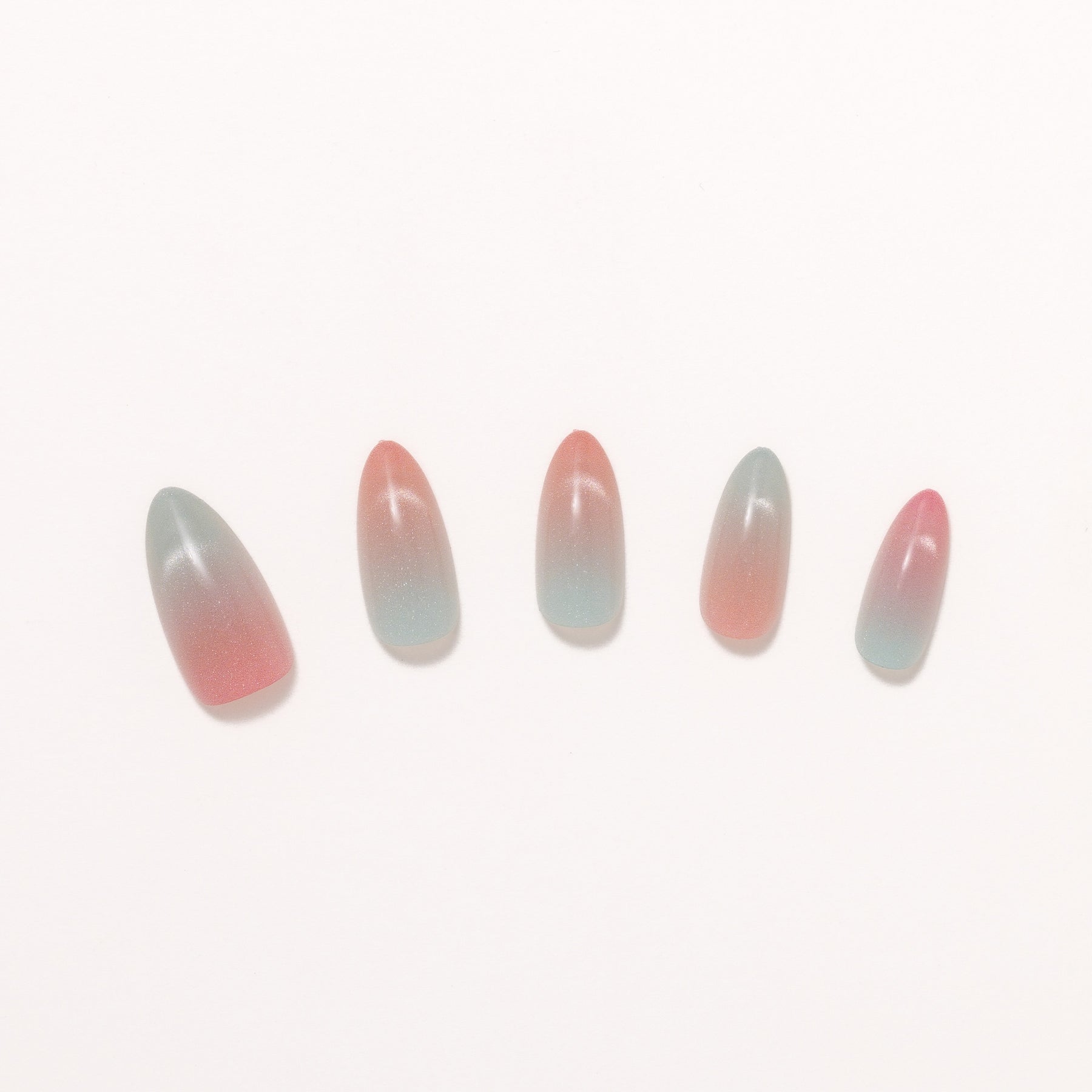 The Iridescent Ice brings a cool, ethereal shimmer to your style. Each medium almond nail features a soft pink base layered with a light blue iridescent finish that draws the light into a sharp, shifting beam. The high-shine glossy coating enhances the frosty glow, creating a concentrated focus that pulls the eye with every movement.
