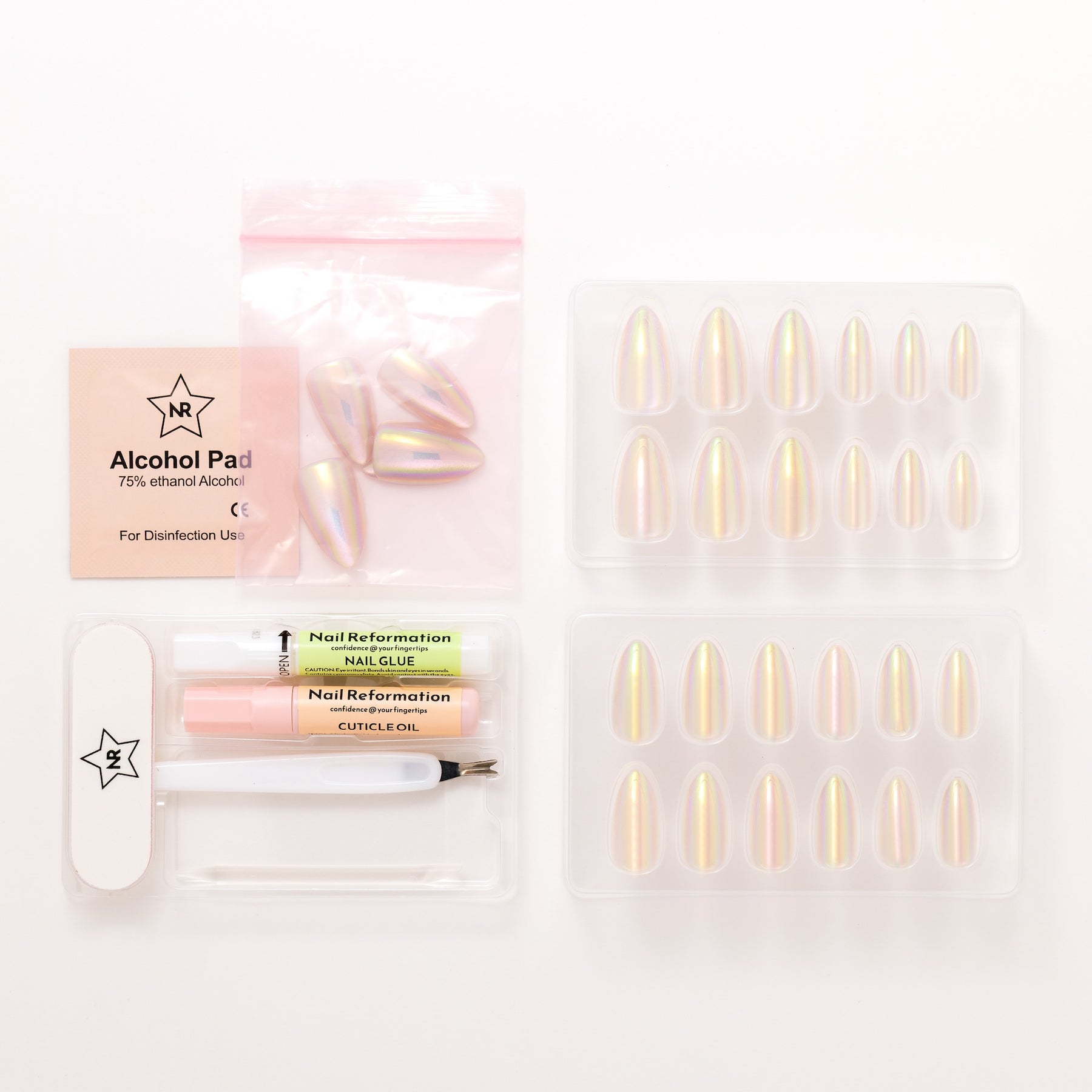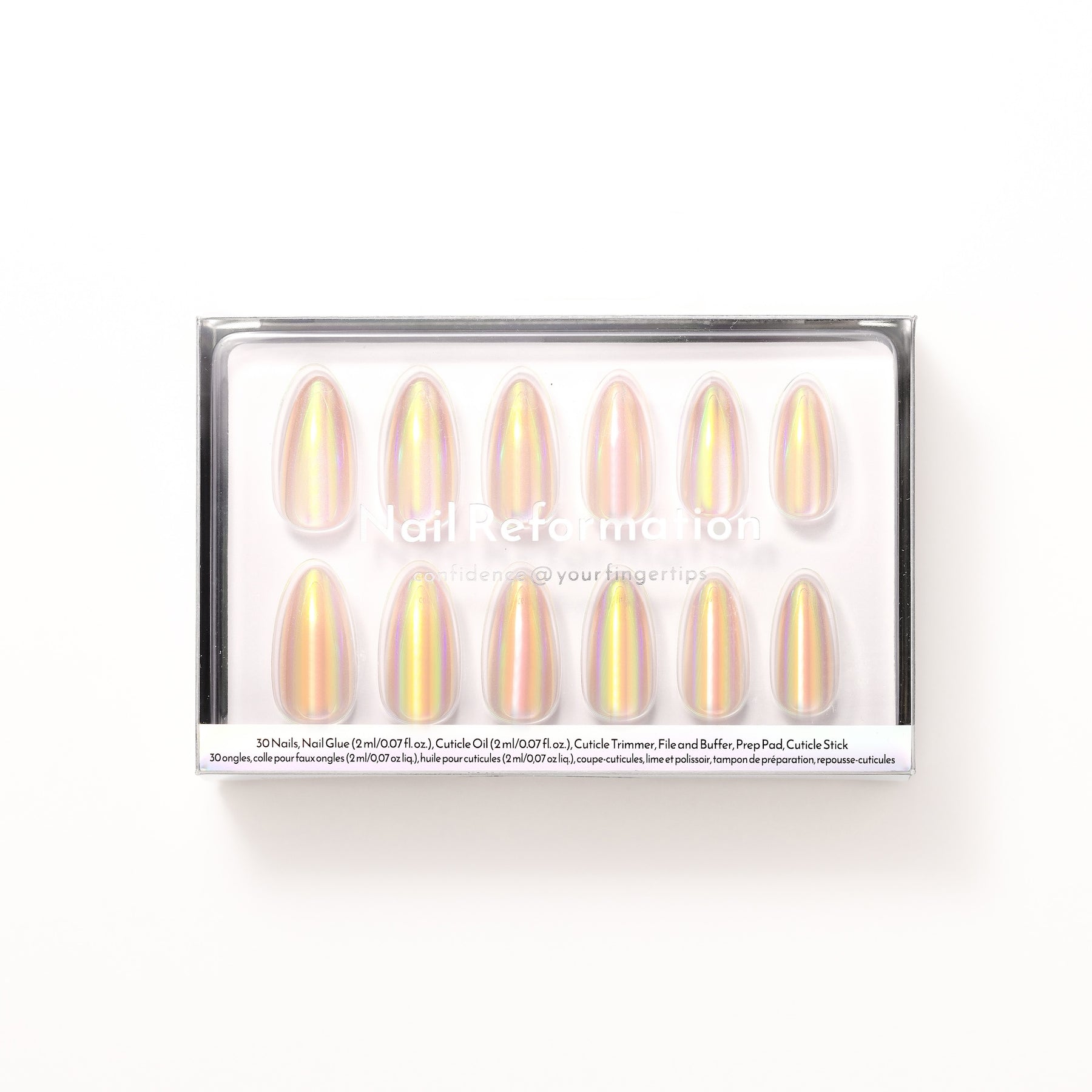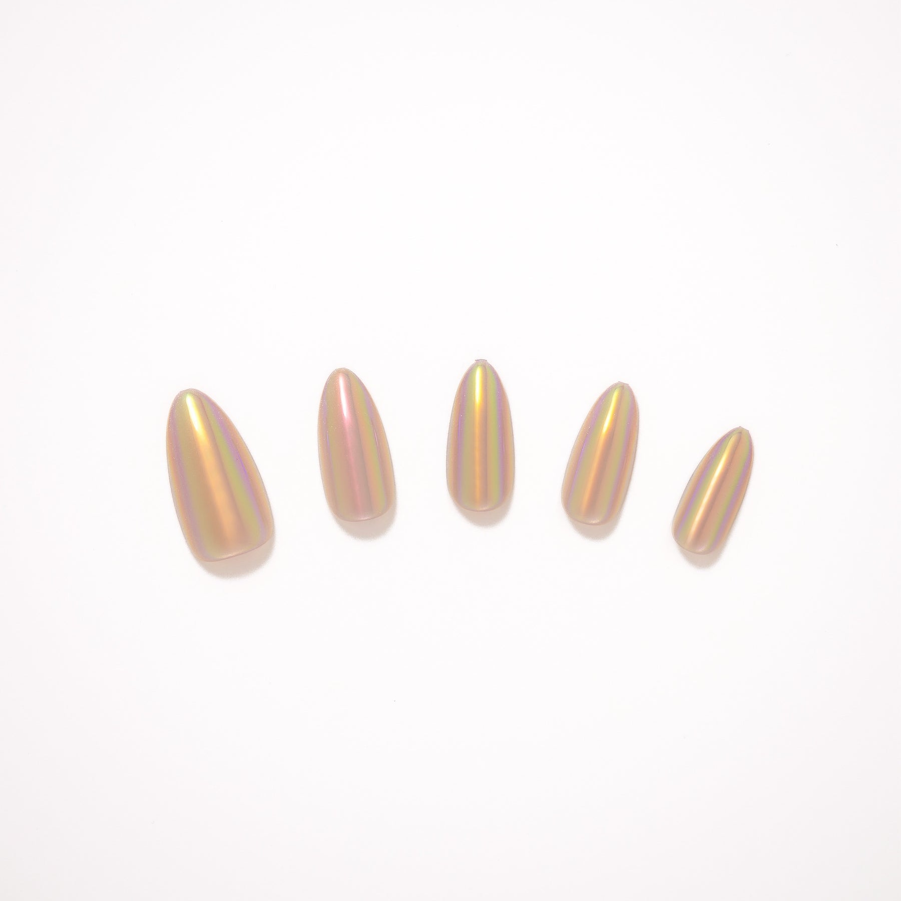 Keep your glass full. The Party Glass press-ons channel the glow of a champagne toast through a golden-pink metallic glaze that mirrors every light. With a high-shine chrome finish and medium almond shape, they strike the perfect balance between polished and playful. Radiant, reflective, and ready for any celebration, they’re the life of the party in nail form.