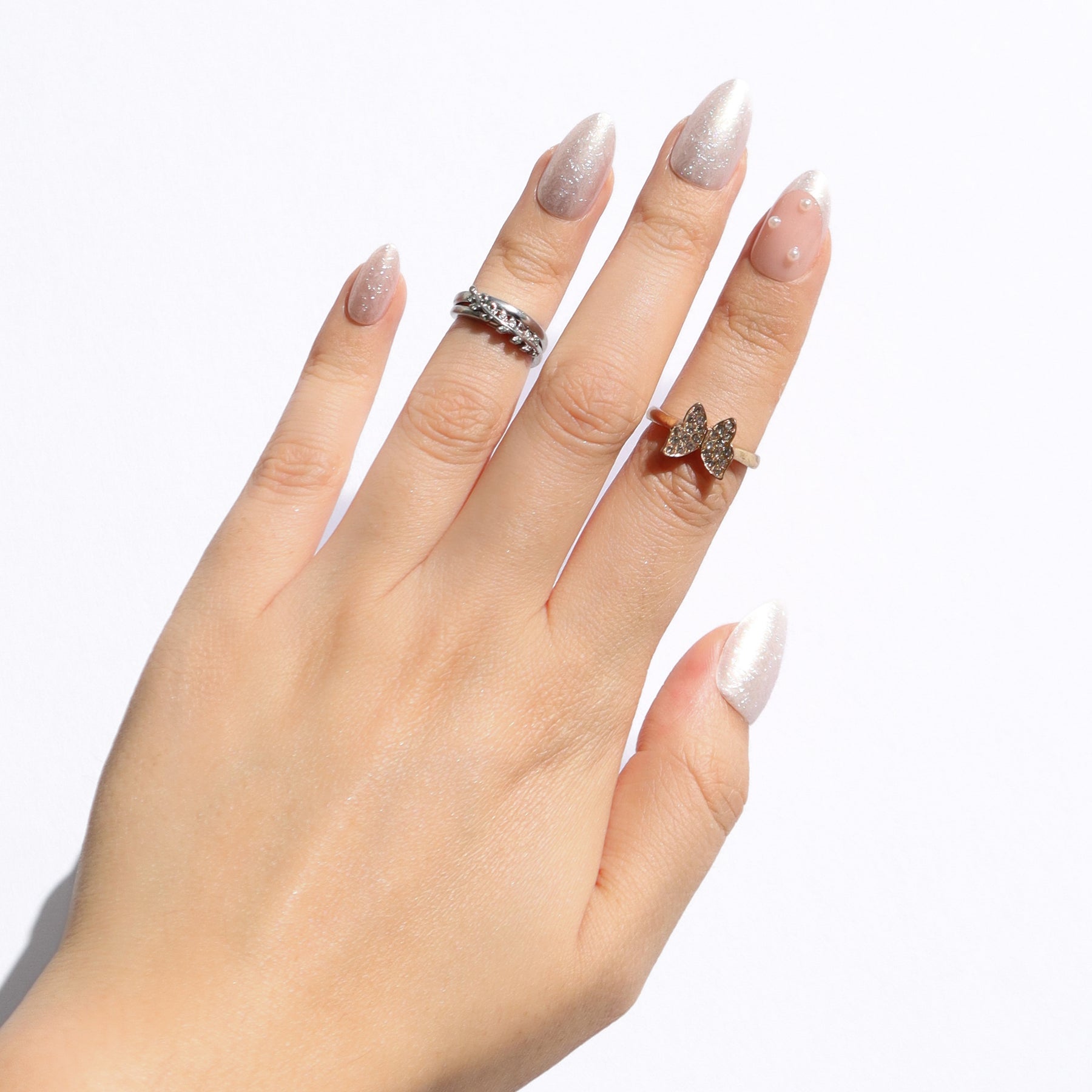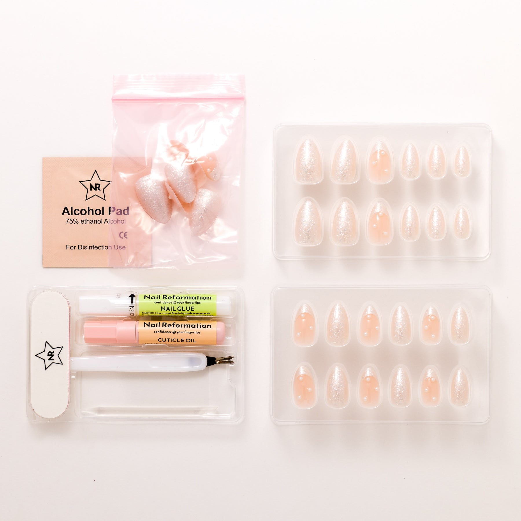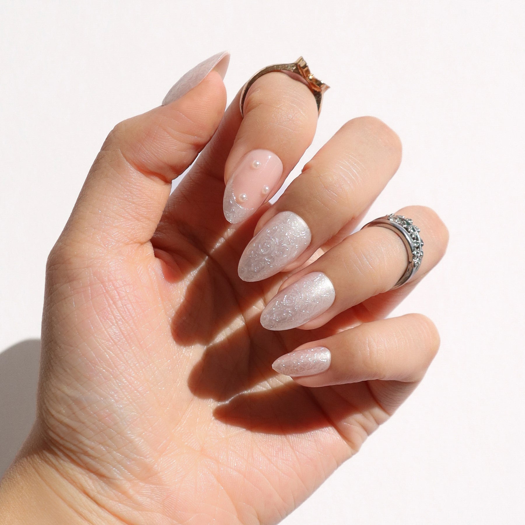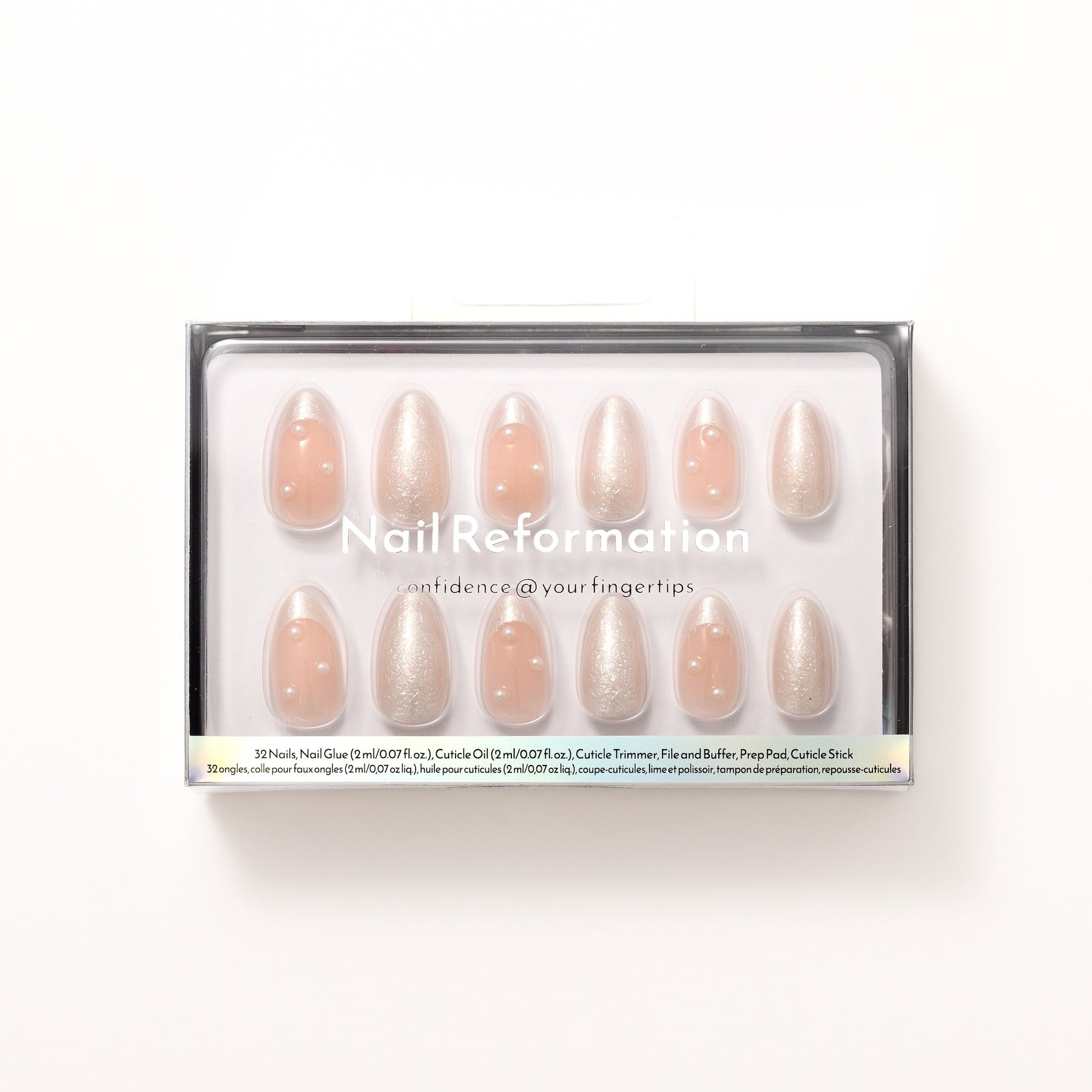 After-hours shine. The Pearl Drop press-ons bring elegance to every gesture, glowing with a nude pearlescent finish that catches the light like champagne bubbles at midnight. Tiny bead accents trace each nail for a subtle yet striking dimension, while the short almond shape elongates and refines every fingertip. Luxurious, luminous, and endlessly versatile, they’re made to shine through every celebration and well beyond the countdown.