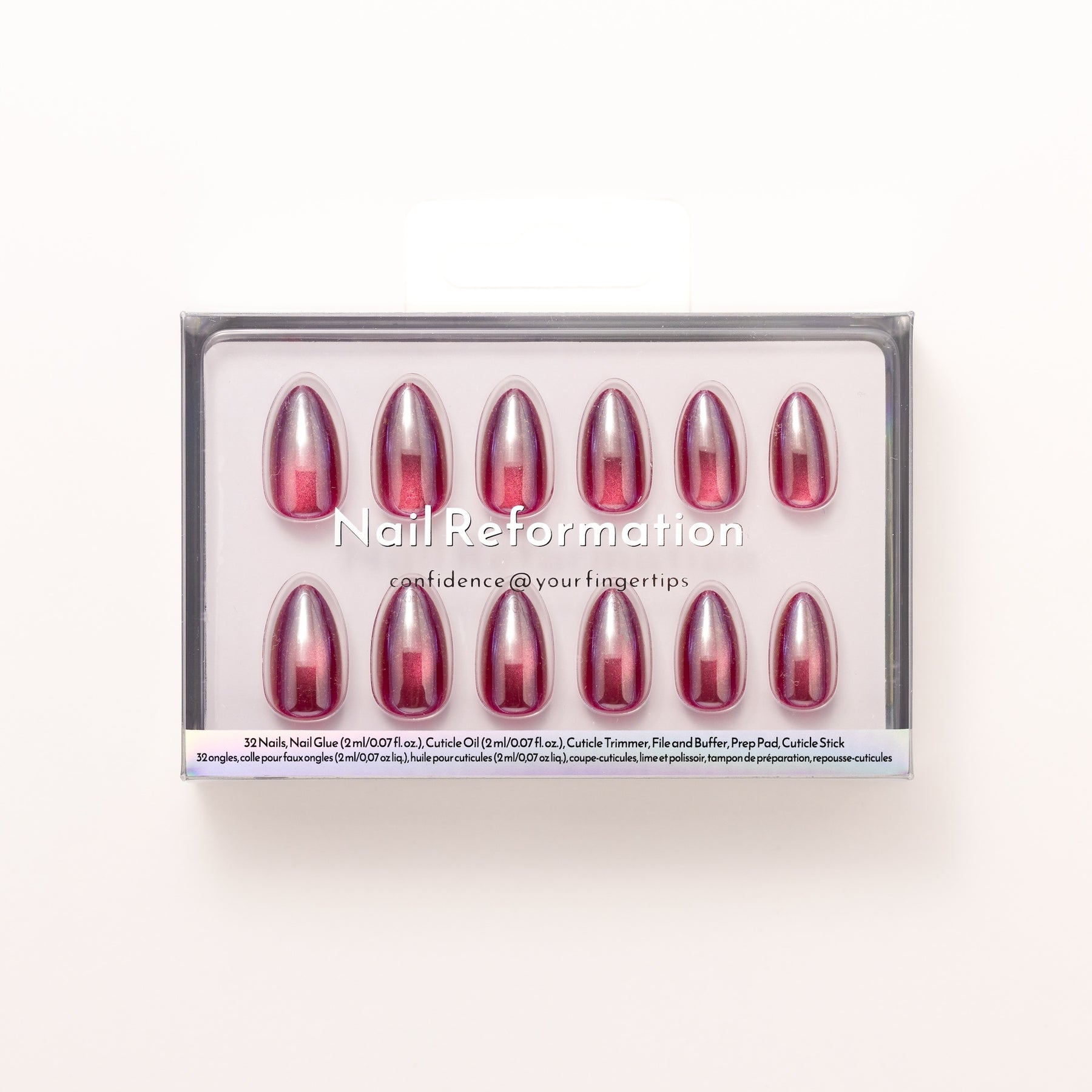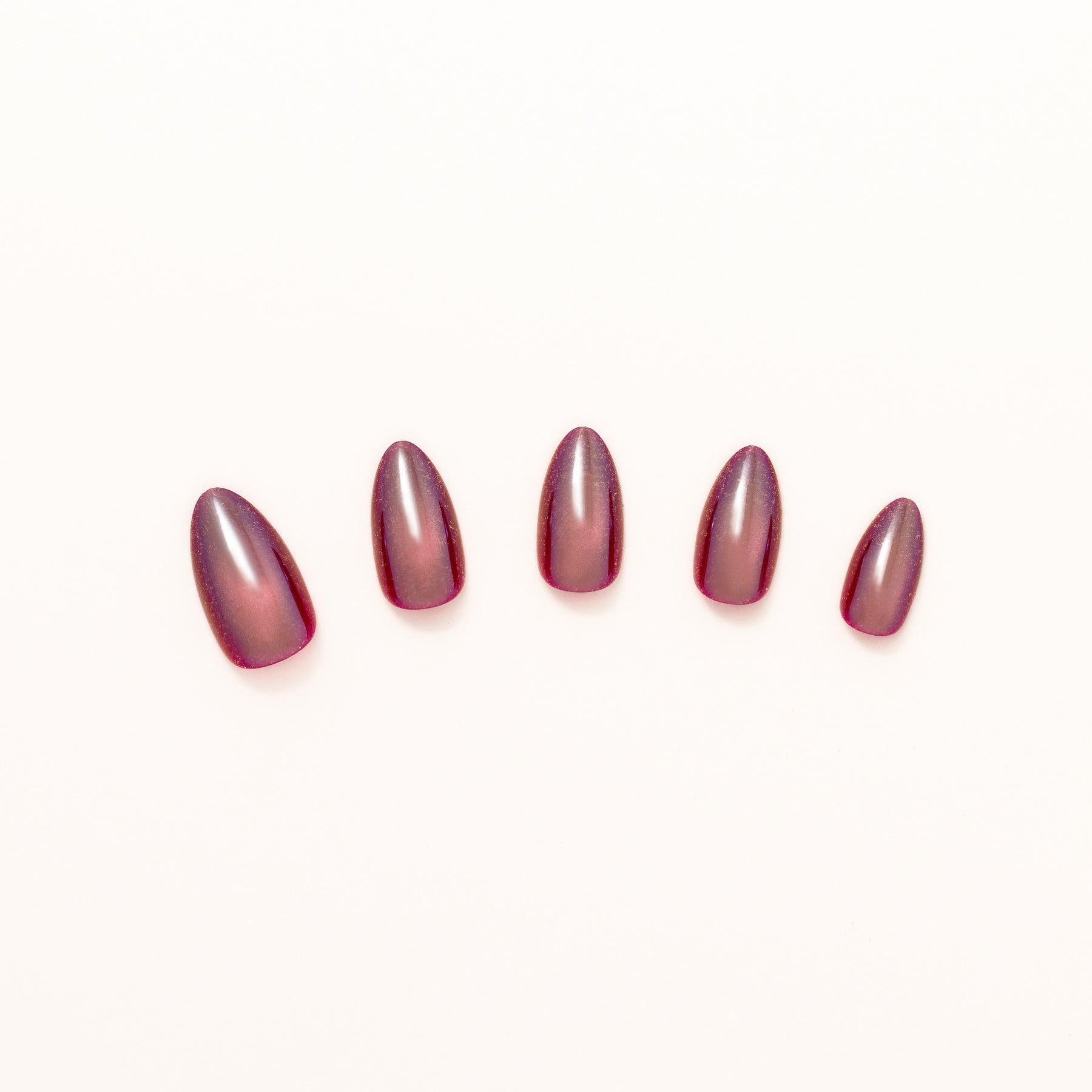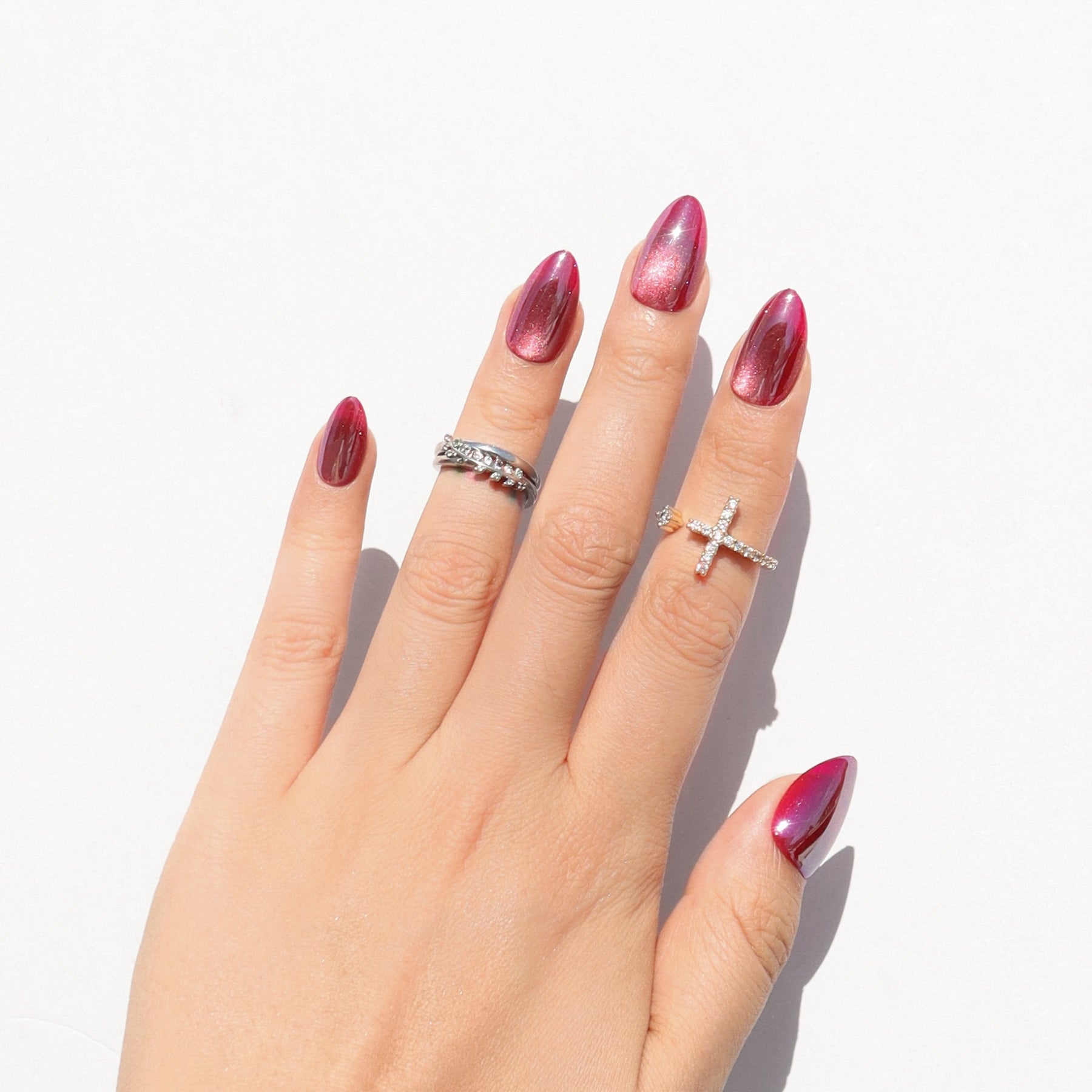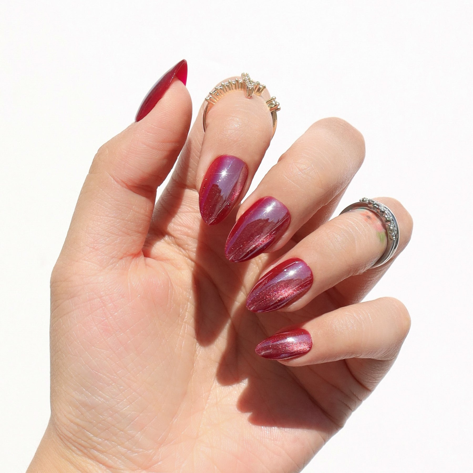 Redshift press-on nails deliver a striking cat eye nail art effect with magnetic depth and bold dimension. Its crimson color shifts under the light, like a Doppler pulse across space, giving the illusion of movement through a sleek, glossy top coat effect. This cosmic look is created with a layered nail art overlay, enhancing the finish while keeping the edges clean and salon-fresh. It’s bold. It's radiant. And it’s light years ahead.