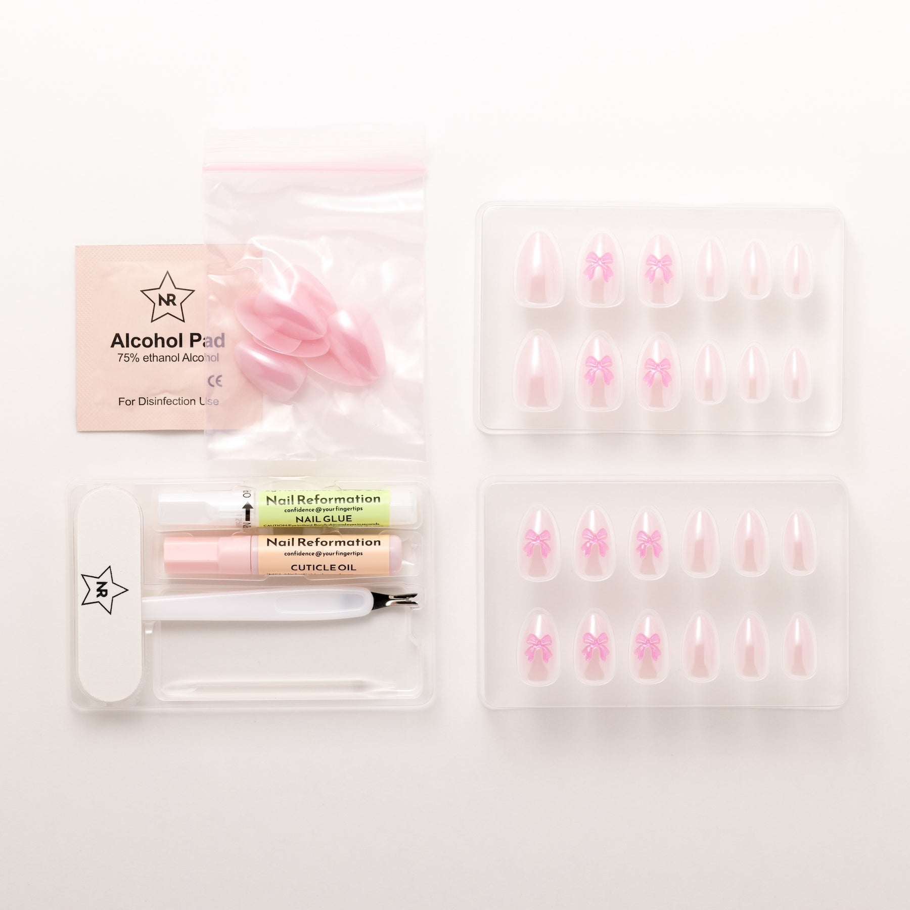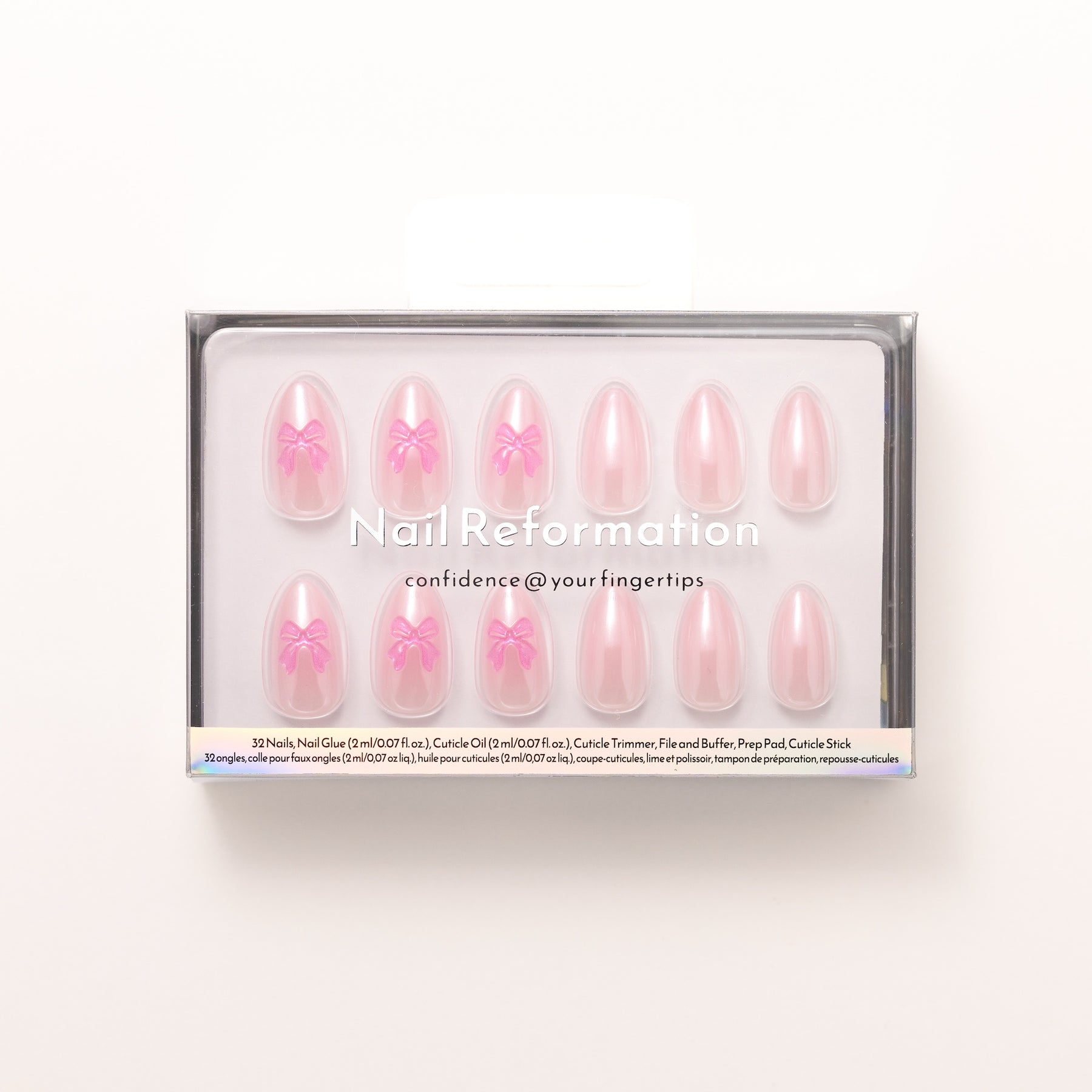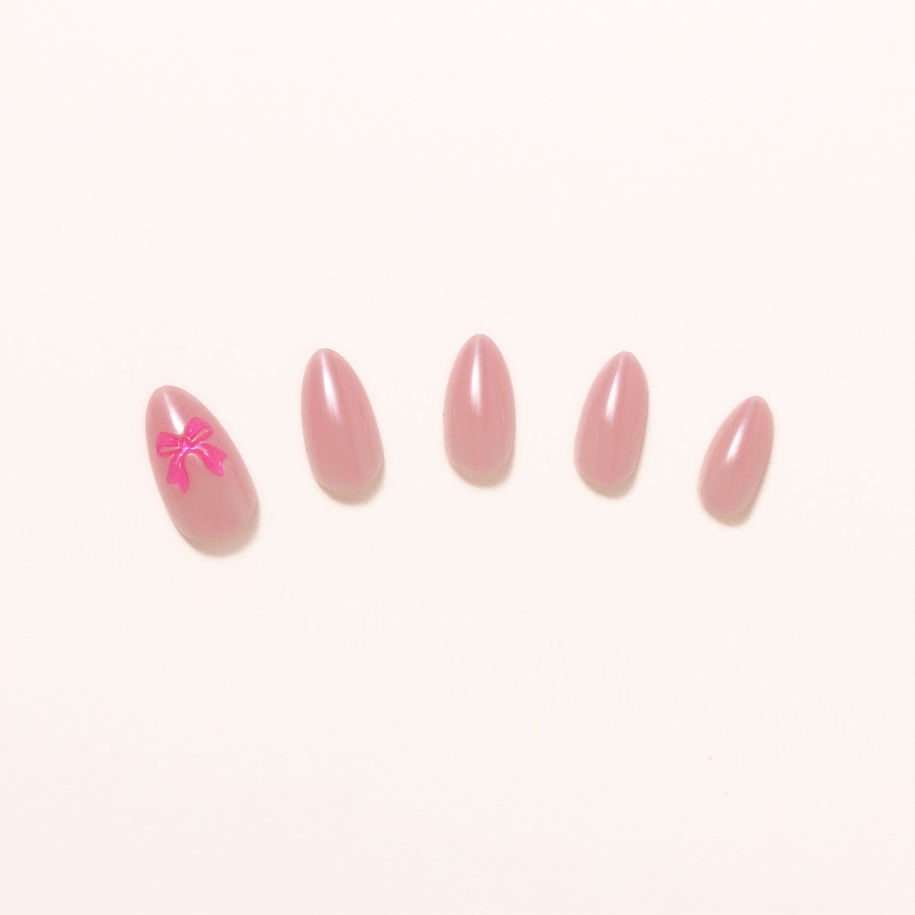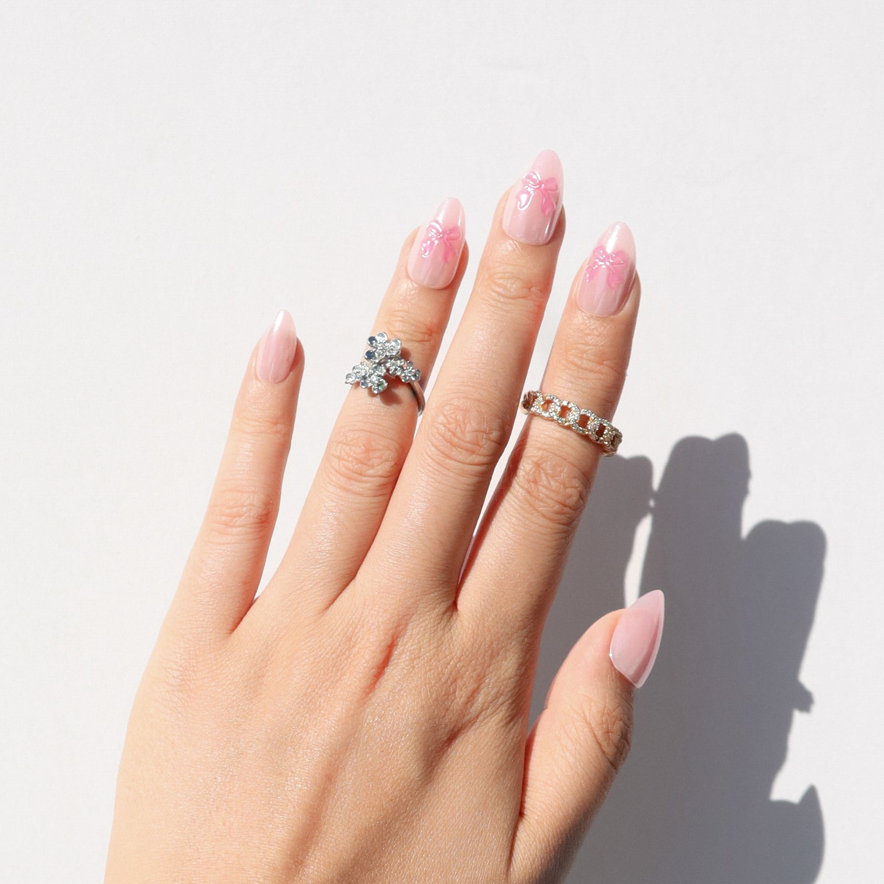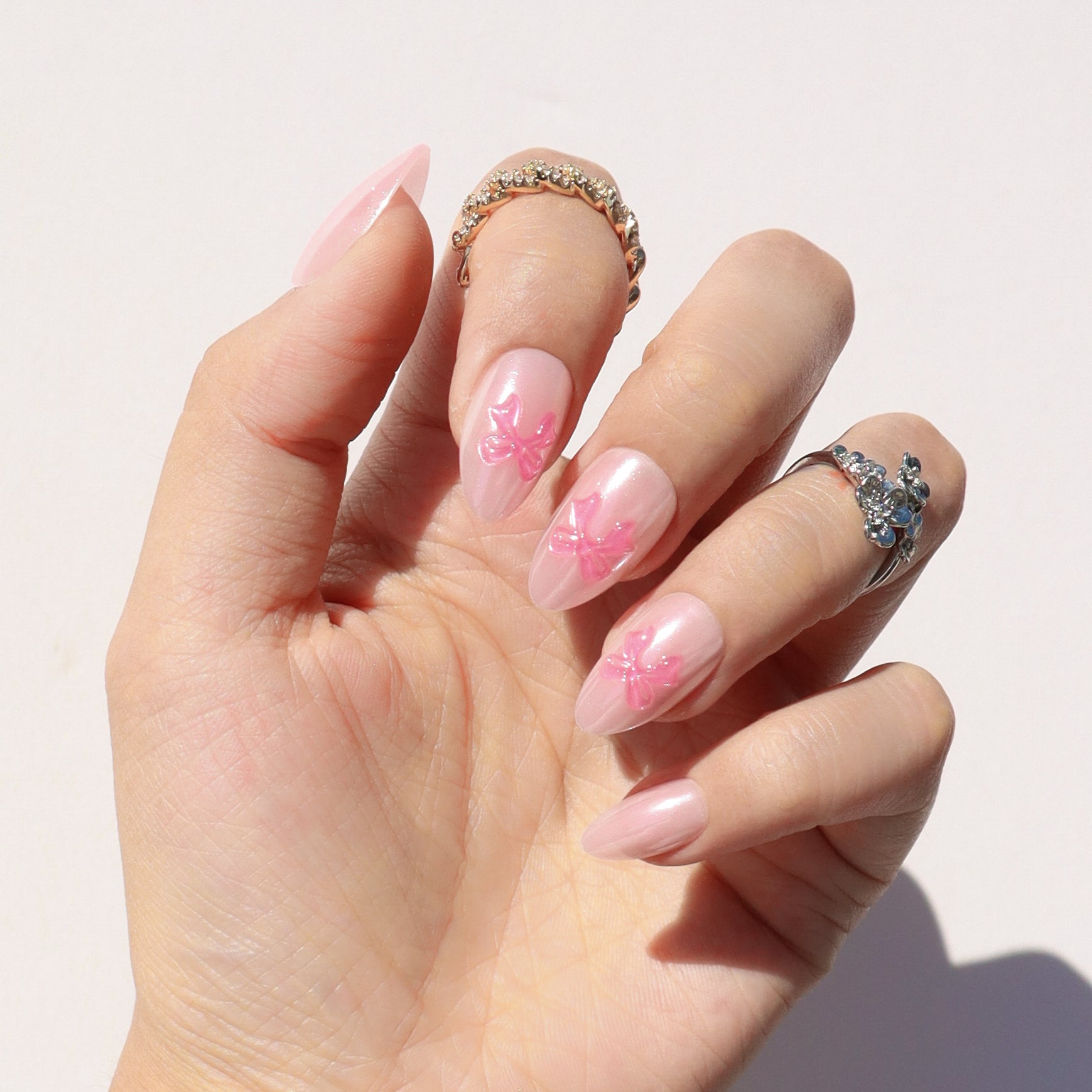 The Sheer Silk short almond press-ons coat nails in a translucent pink glaze that glows with effortless softness. The silky finish catches light with a subtle sheen, while delicate 3D bow embellishments rest on select nails like ribbons tied with care. A seamless glaze amplifies the depth and shine, balancing sweet detail with modern refinement. Sculpted in a short almond silhouette, this design feels graceful, polished, and perfectly tied together.
