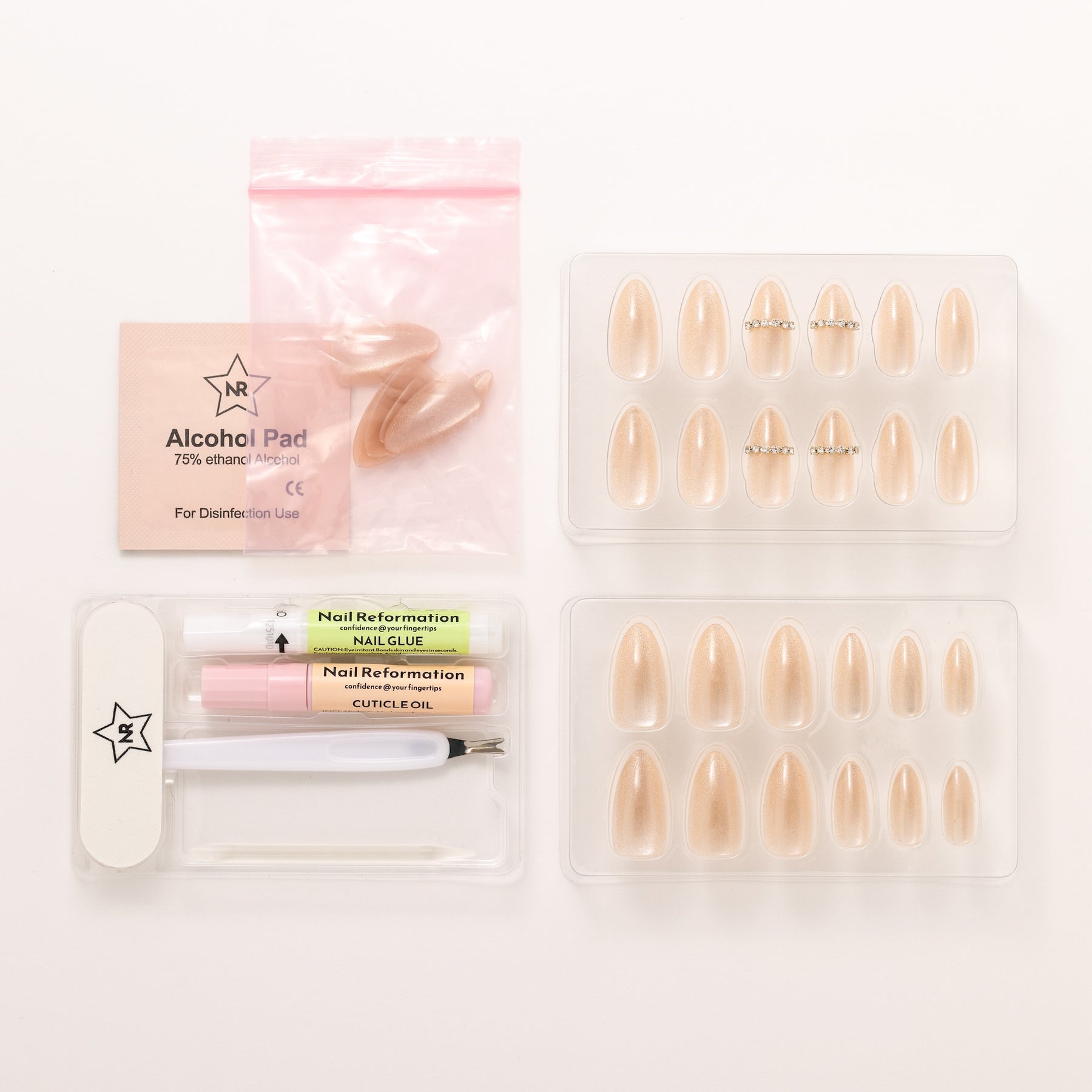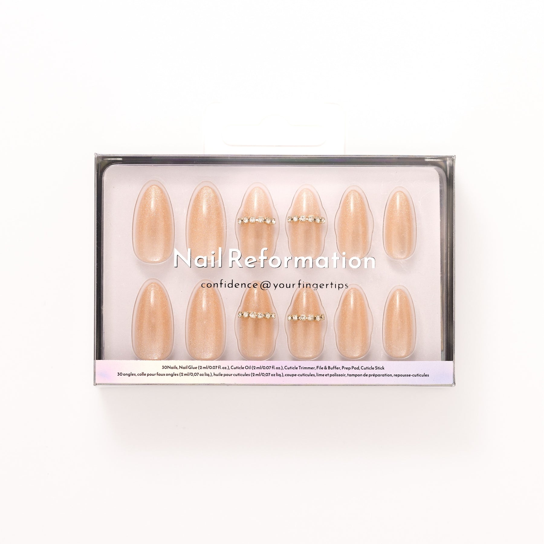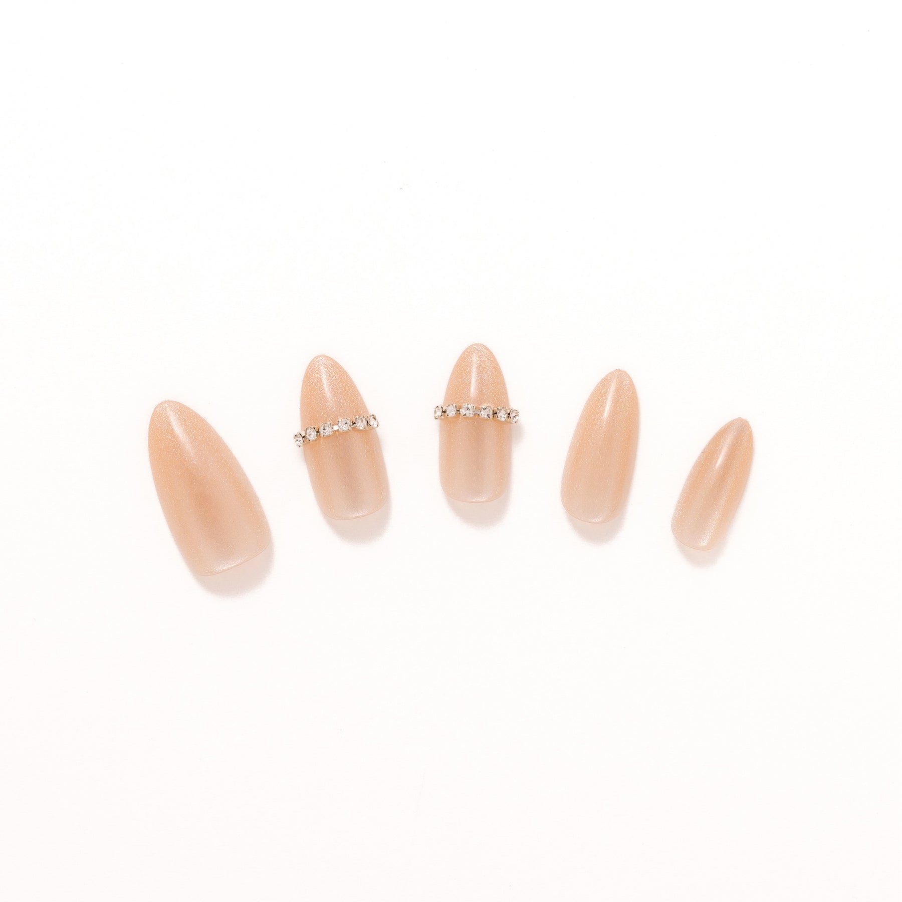 The Silk Jewel press-on nail set brings a refined take on cat-eye design with a soft, silky finish and a hint of sparkle. Designed in a medium almond shape, each nail features a warm nude base with a smooth cat-eye effect that shifts gently with the light, creating a fluid, elongated look. Select nails are finished with a delicate jewel accent, placed just enough to catch the eye without breaking the elegance of the design. The balance of subtle movement and restrained shine keeps the look polished and composed. Finished with a smooth, glossy coating, this set delivers understated glamour that feels elevated, modern, and effortlessly put together.