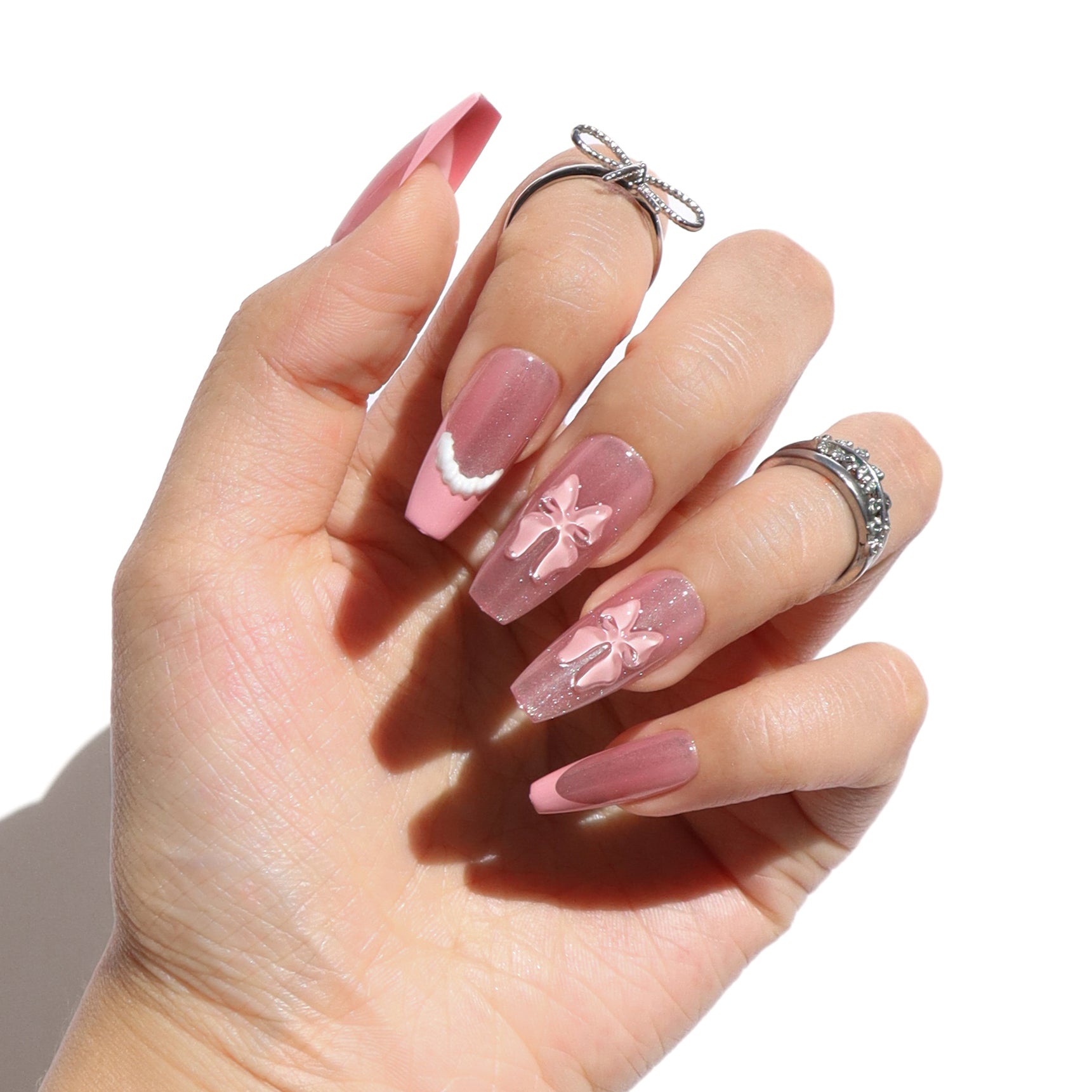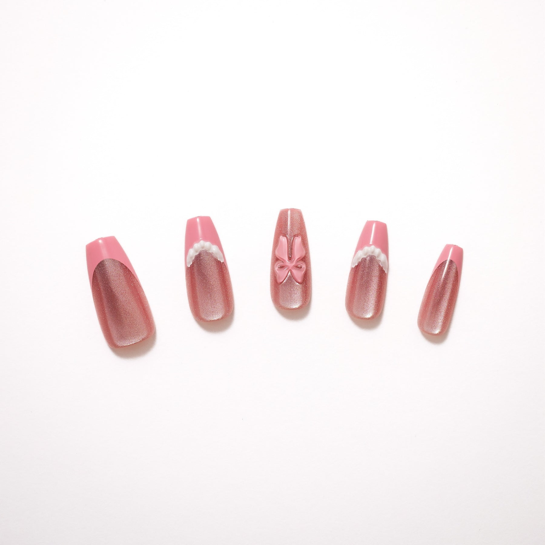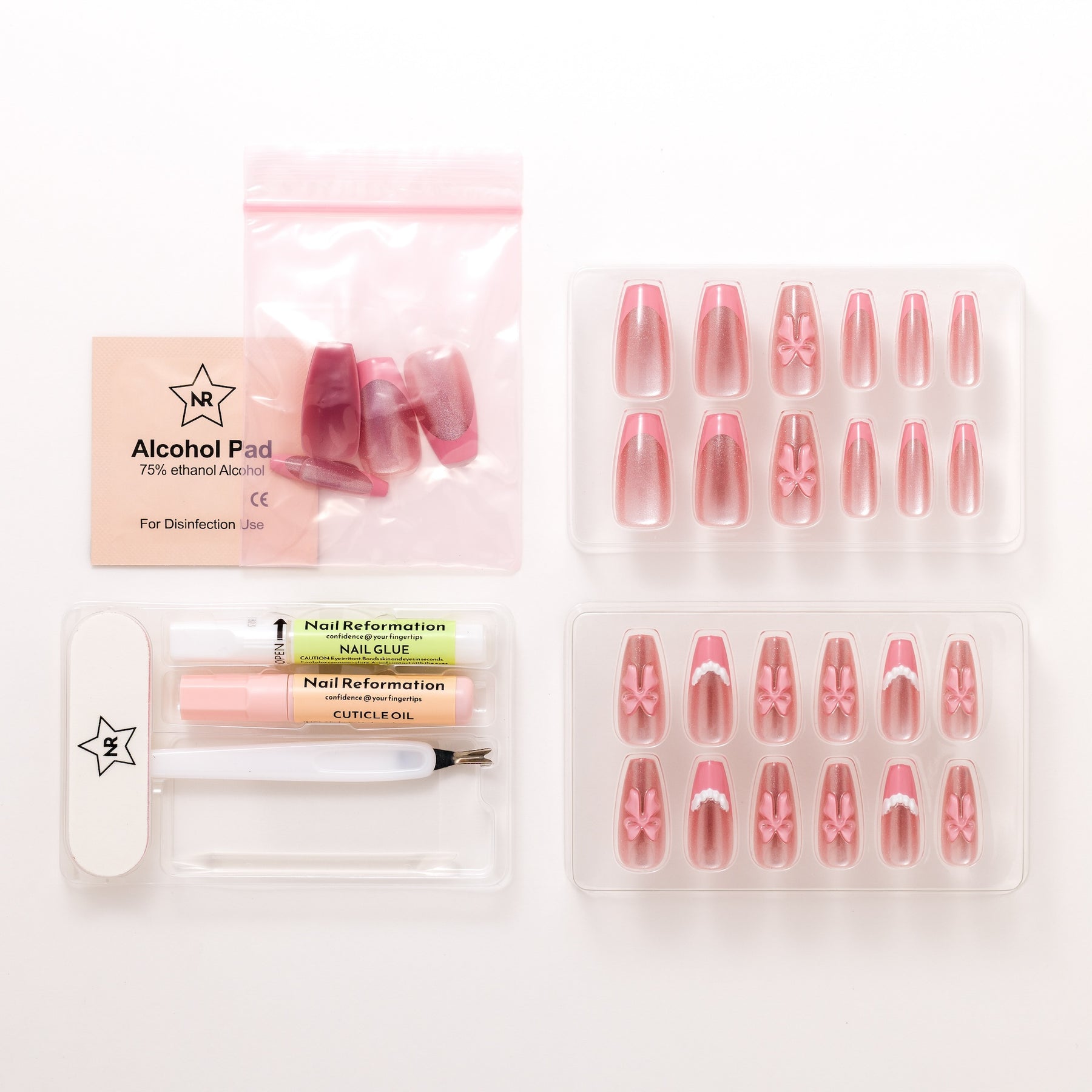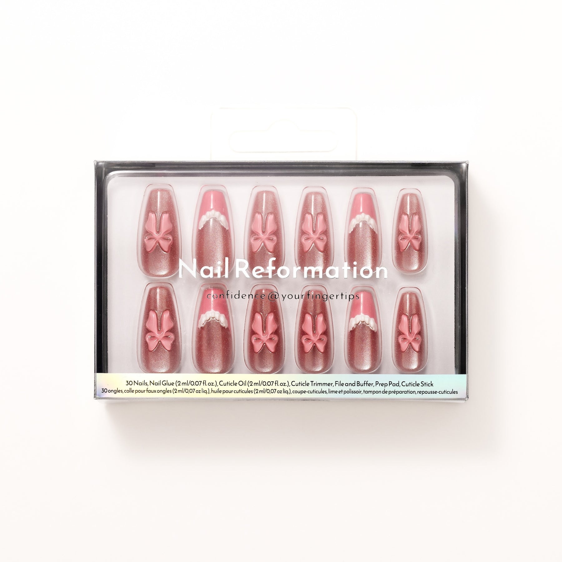 Wrapped in luxury. The Silk Robe press-ons bring the indulgence of satin and the comfort of calm to your fingertips. A soft rose hue glows with cat eye shimmer, while embossed bow and lace details add a hint of playful sophistication. Like slipping into your favorite robe, this design blends allure and ease: graceful, glossy, and made to be admired.