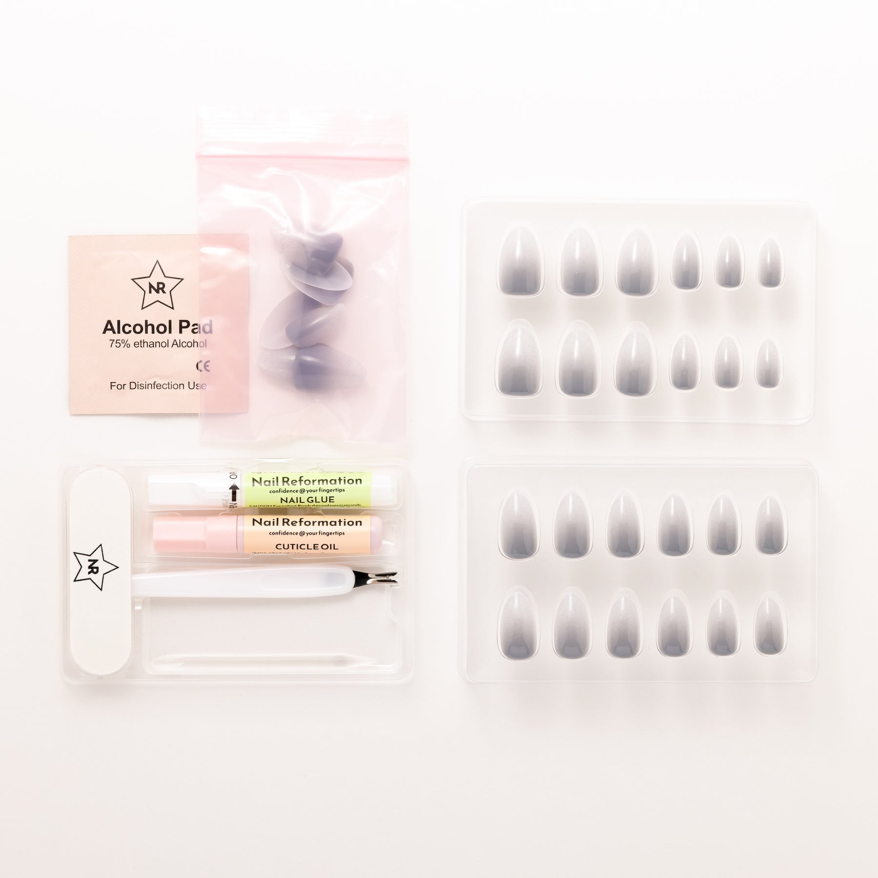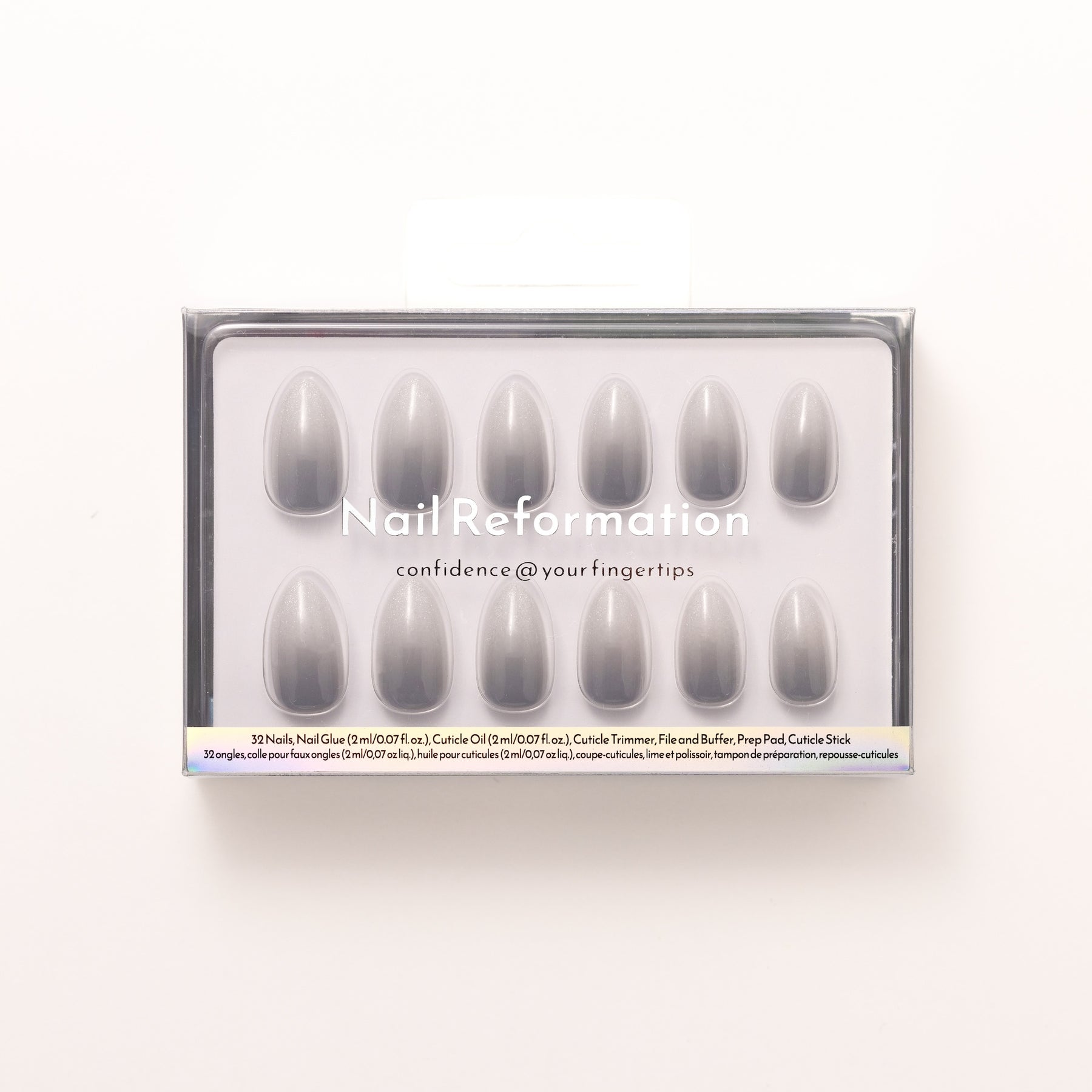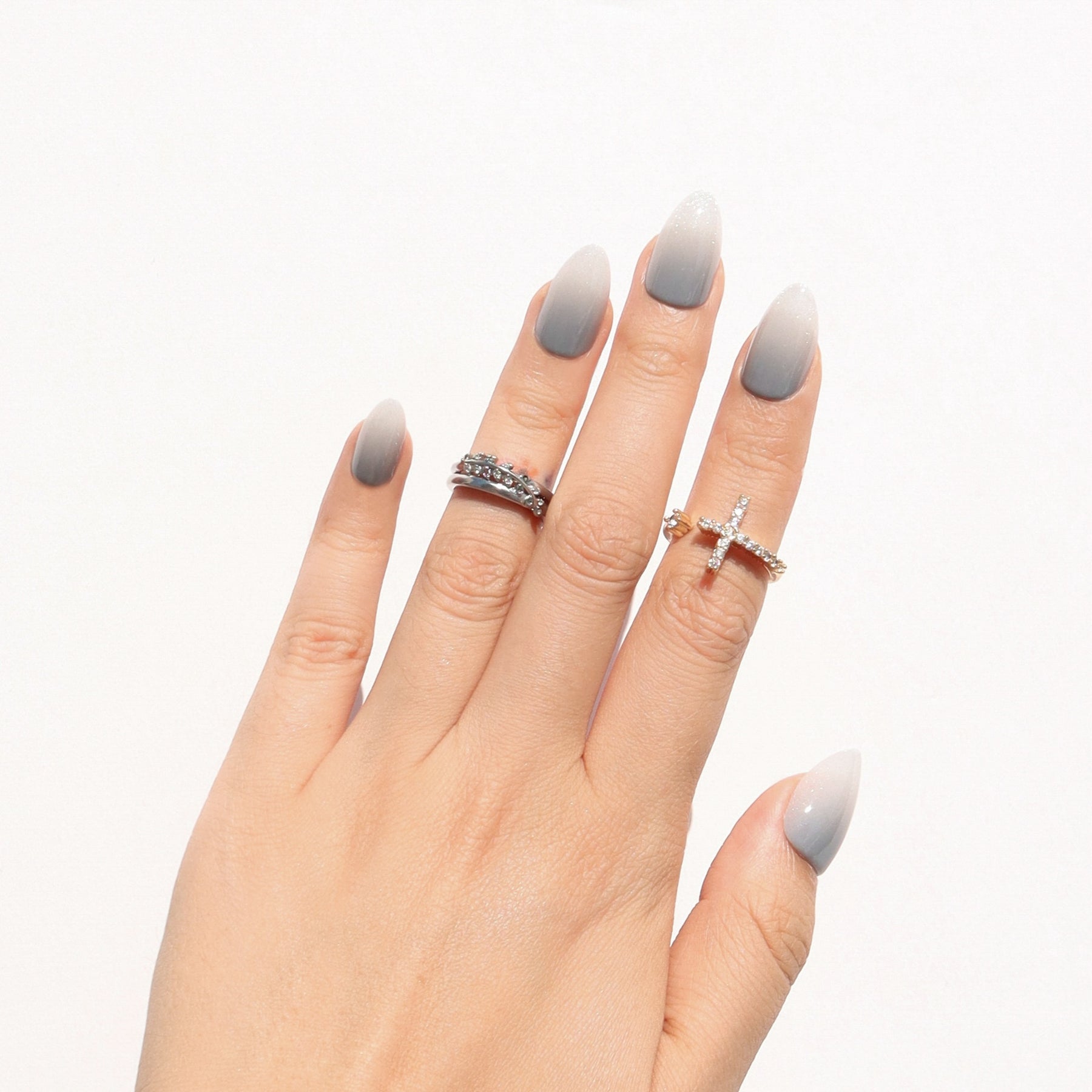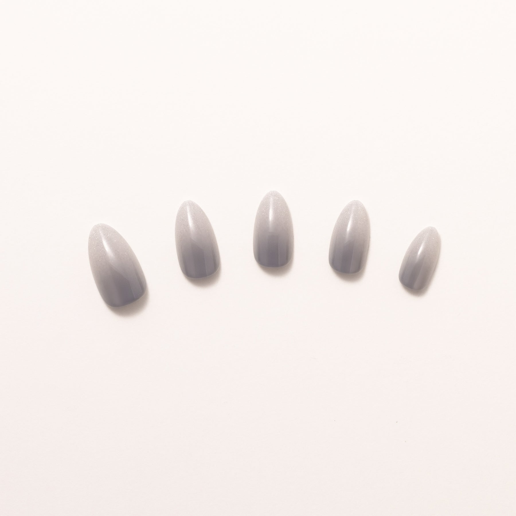 Silver Ash press-on nails blend smoky grey into soft silver with a velvet shimmer finish that catches light in all the right ways. The gradient is smooth and subtle, giving cool-toned polish without the effort. Finished in a short almond shape, these grey ombré nails deliver soft-glam shine with an understated edge.