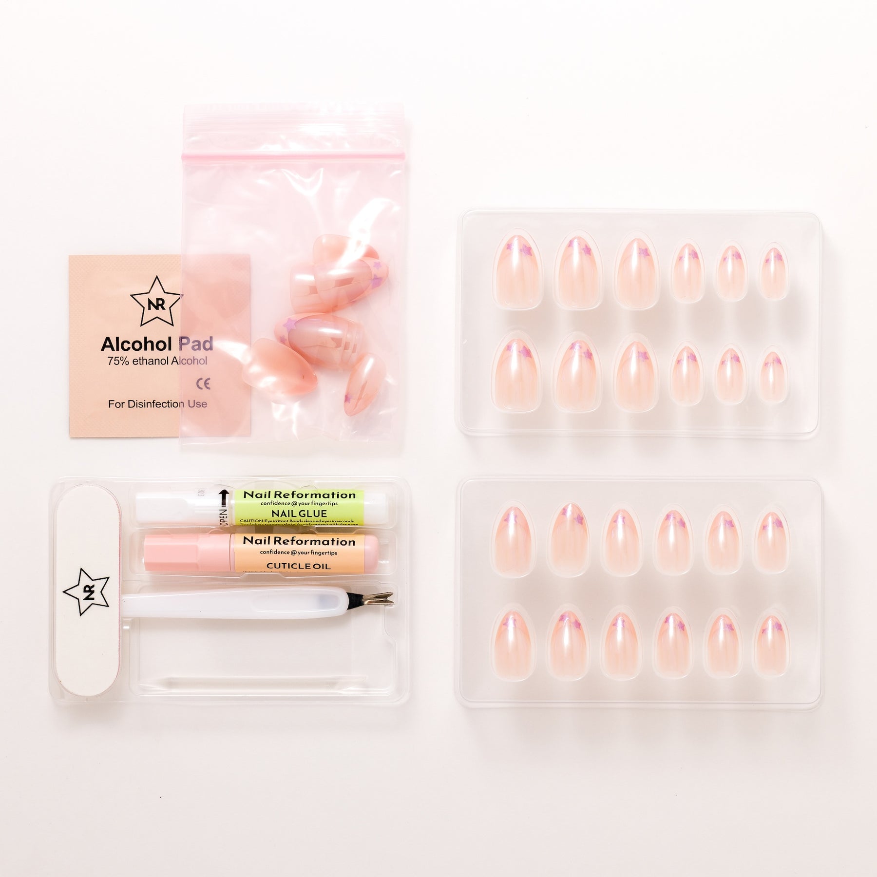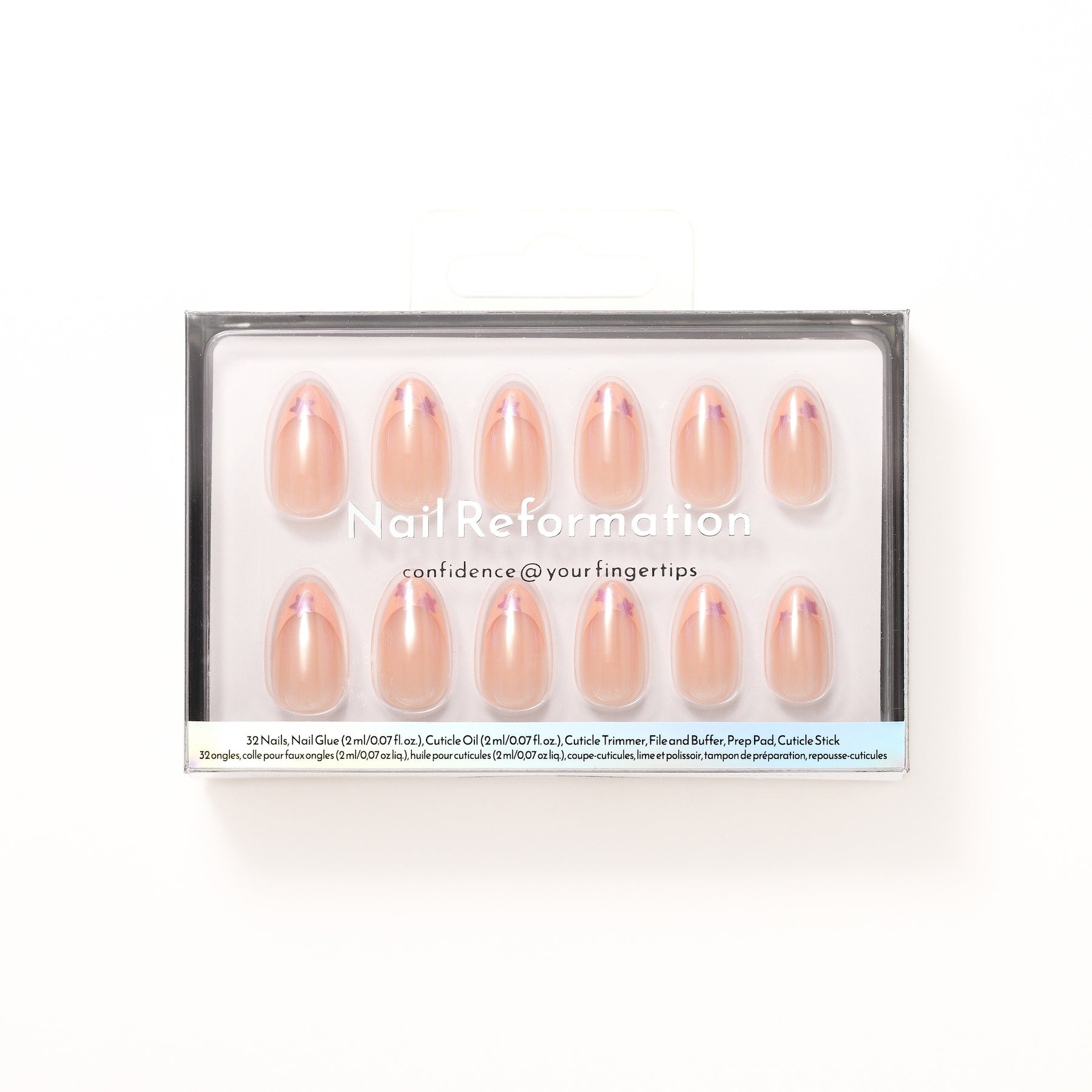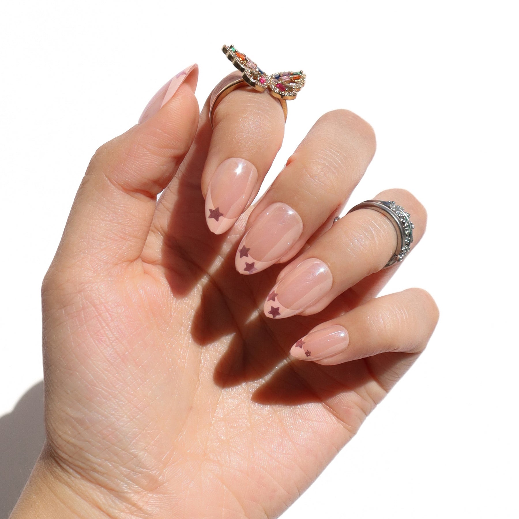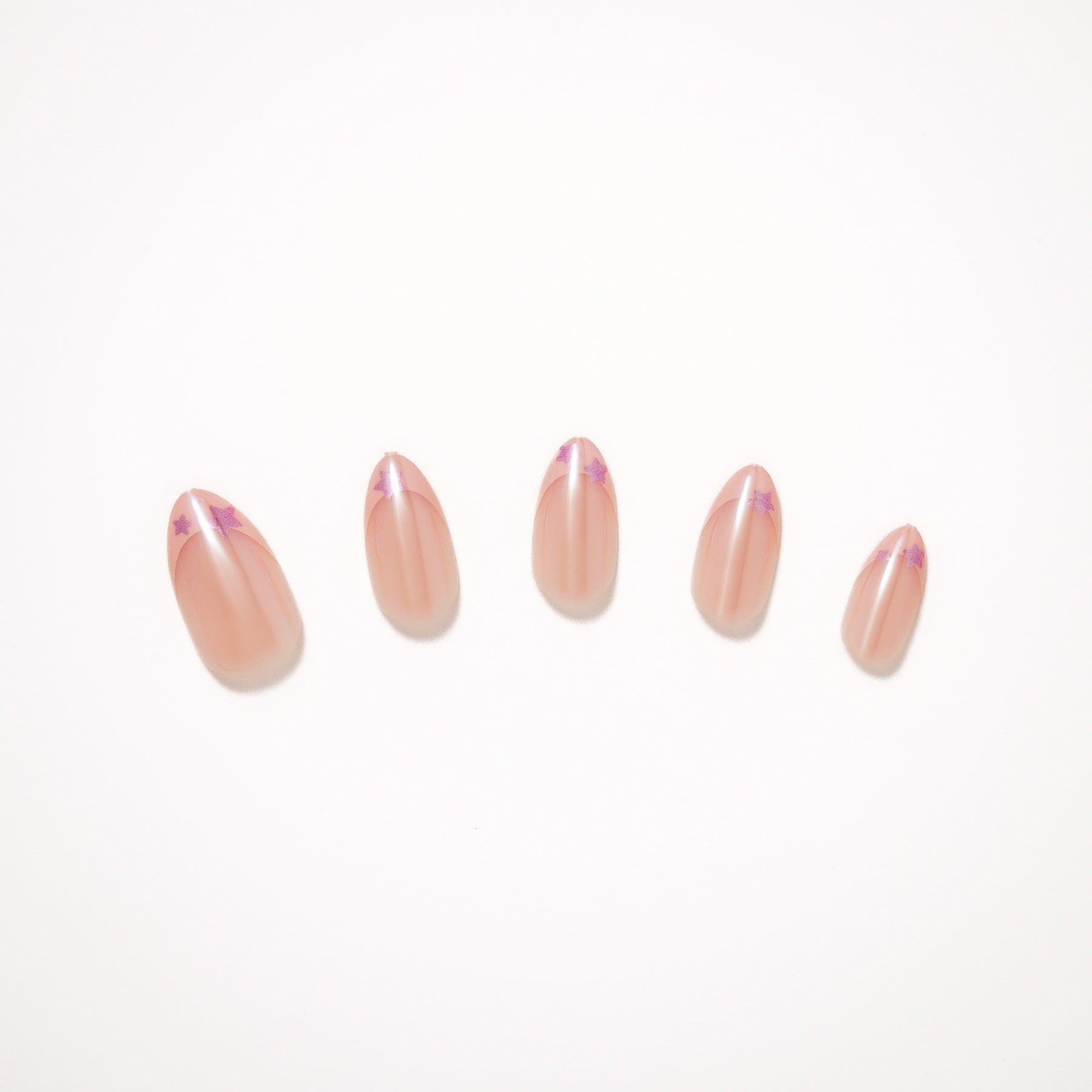 Among the stars. The Starlet press-ons put a cosmic spin on the classic French tip, blending a soft blush glaze with lilac stars that twinkle at the edges. The short almond shape keeps the look chic and wearable, while the subtle diagonal tips add a hint of modern flair. Effortlessly elegant with a touch of whimsy, Starlet turns every night into a starlit moment.