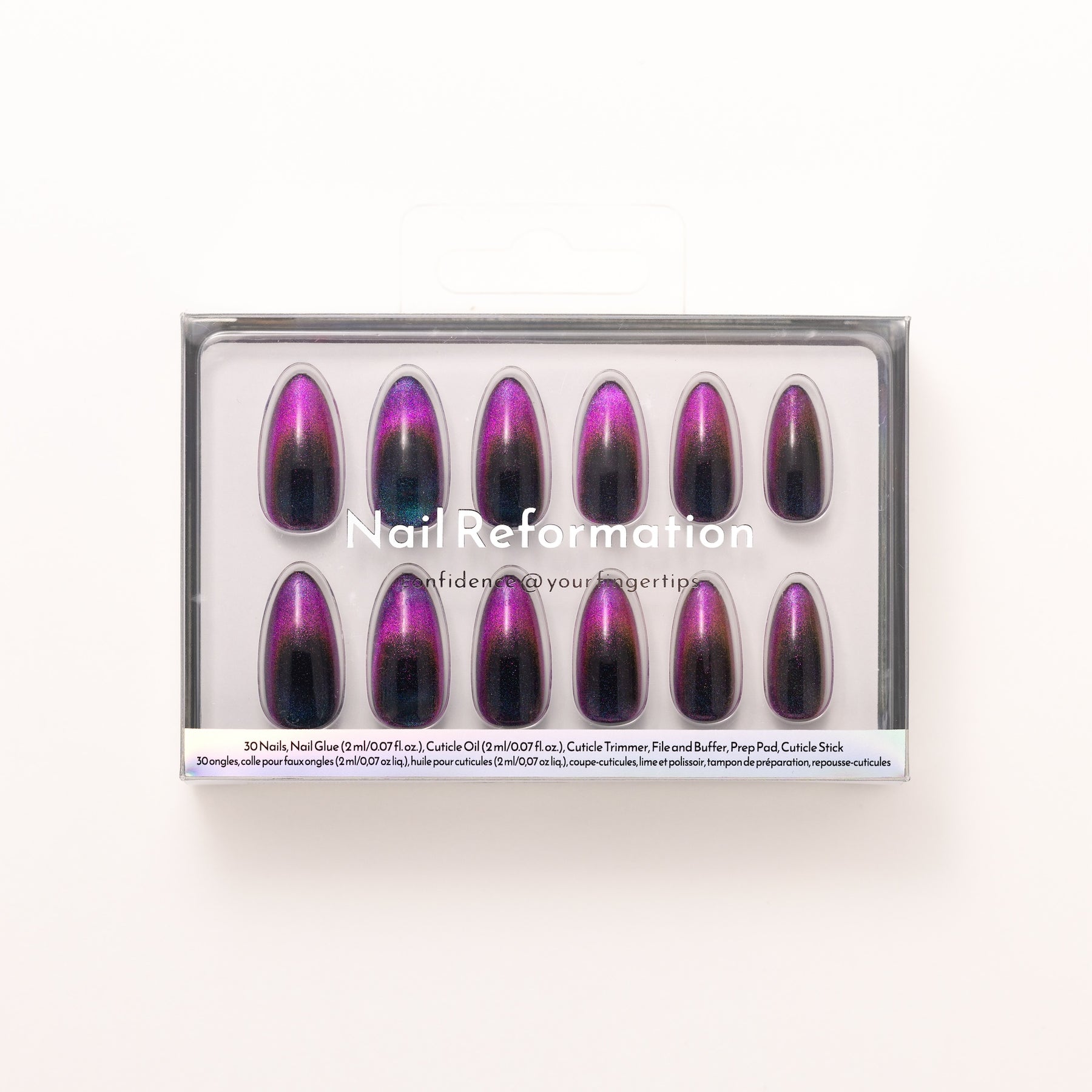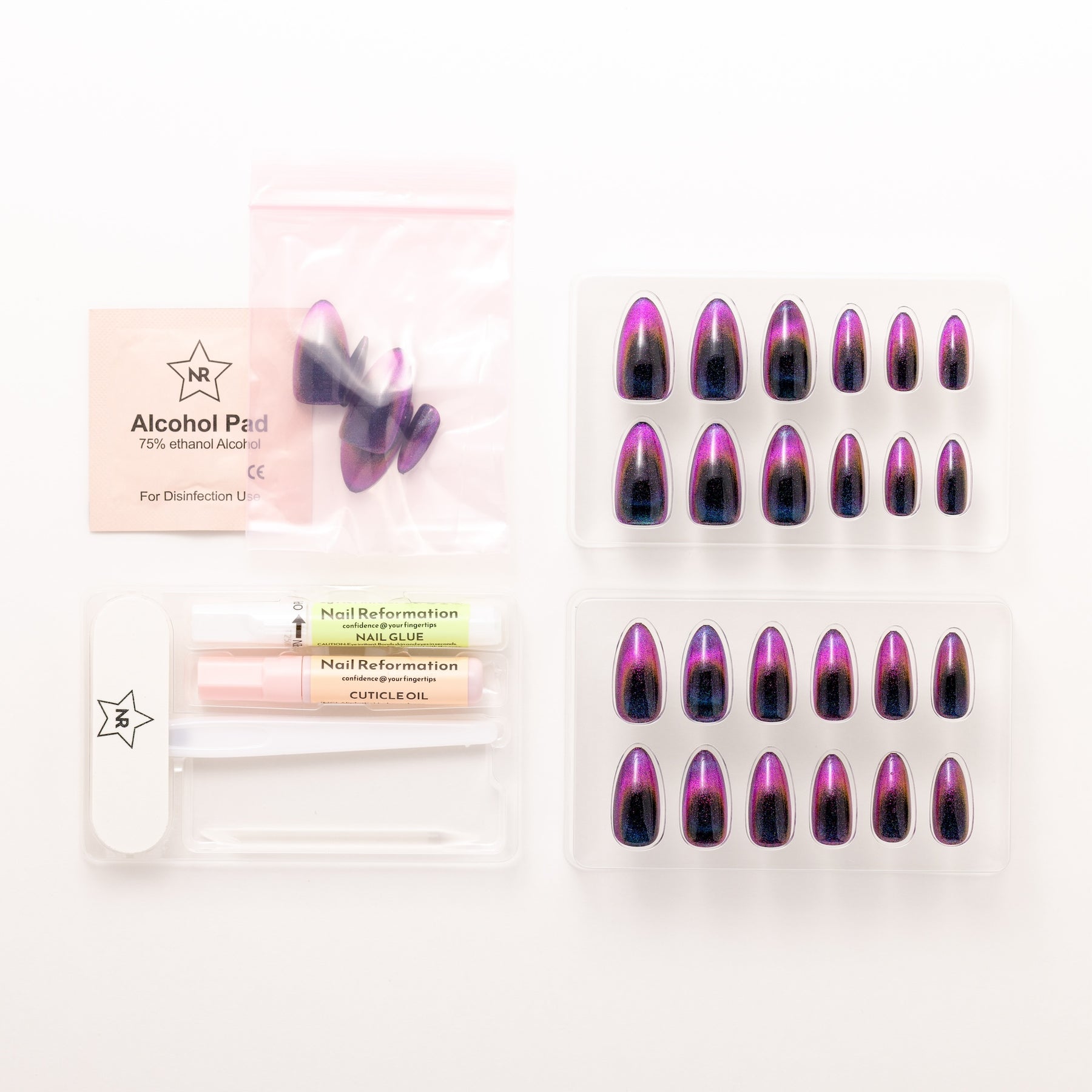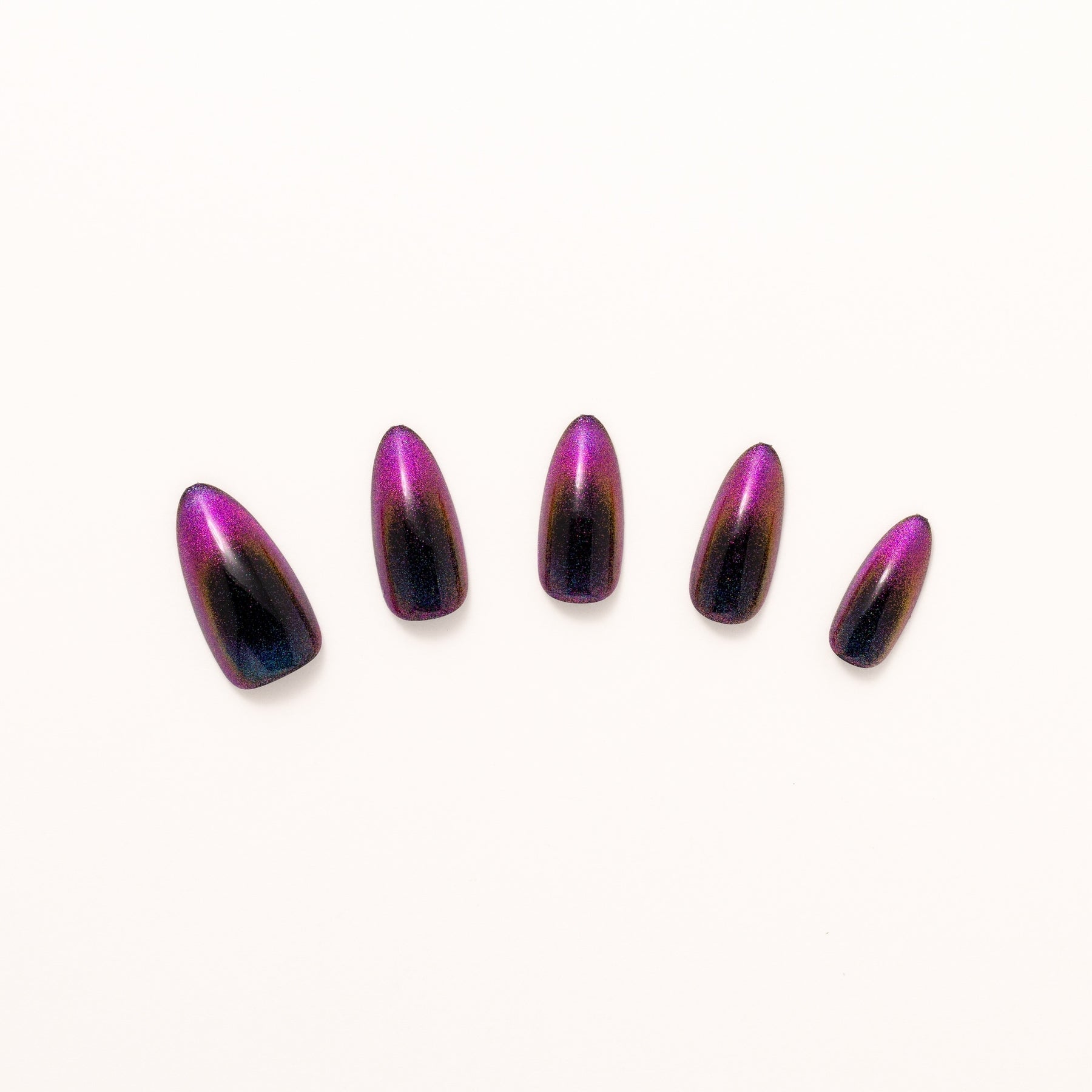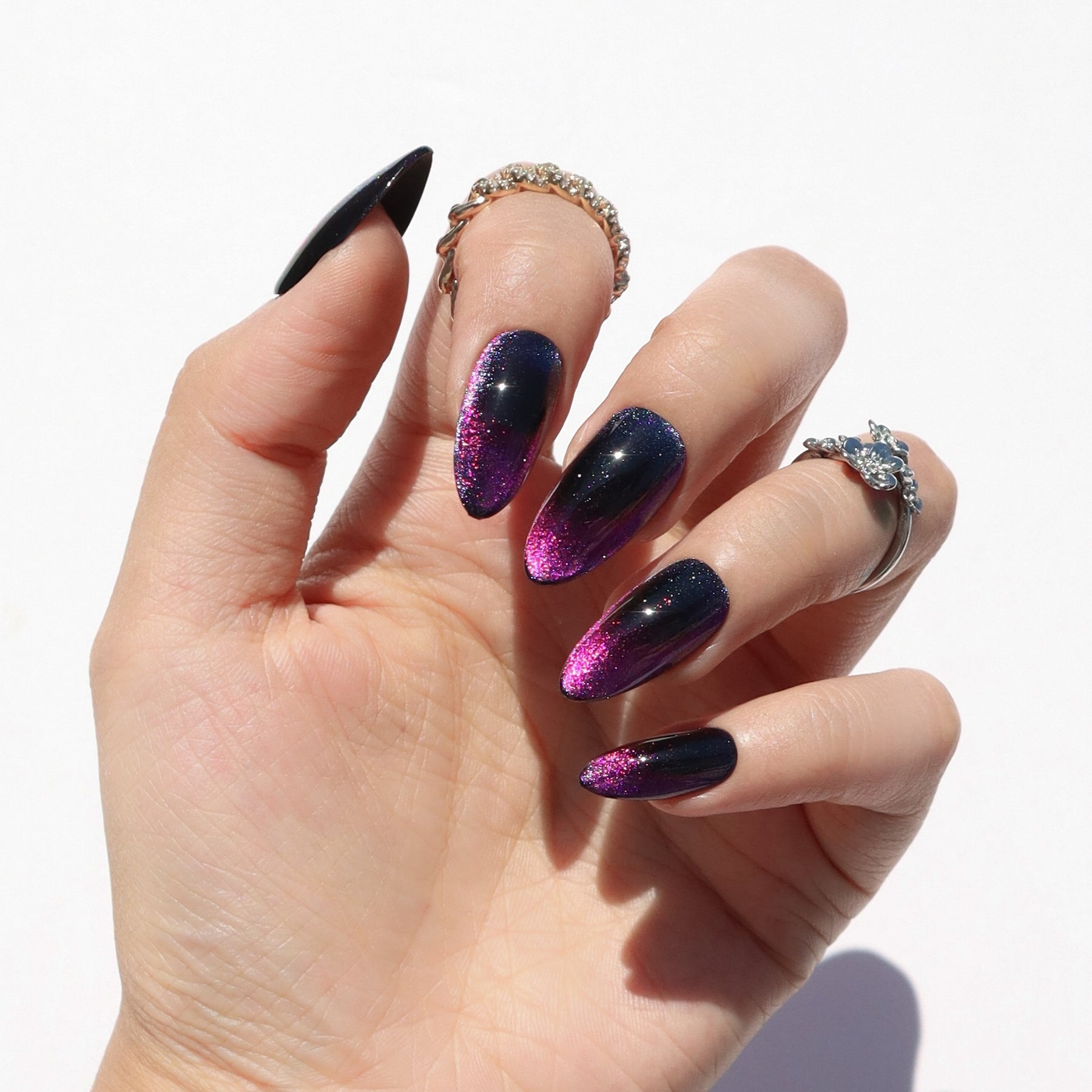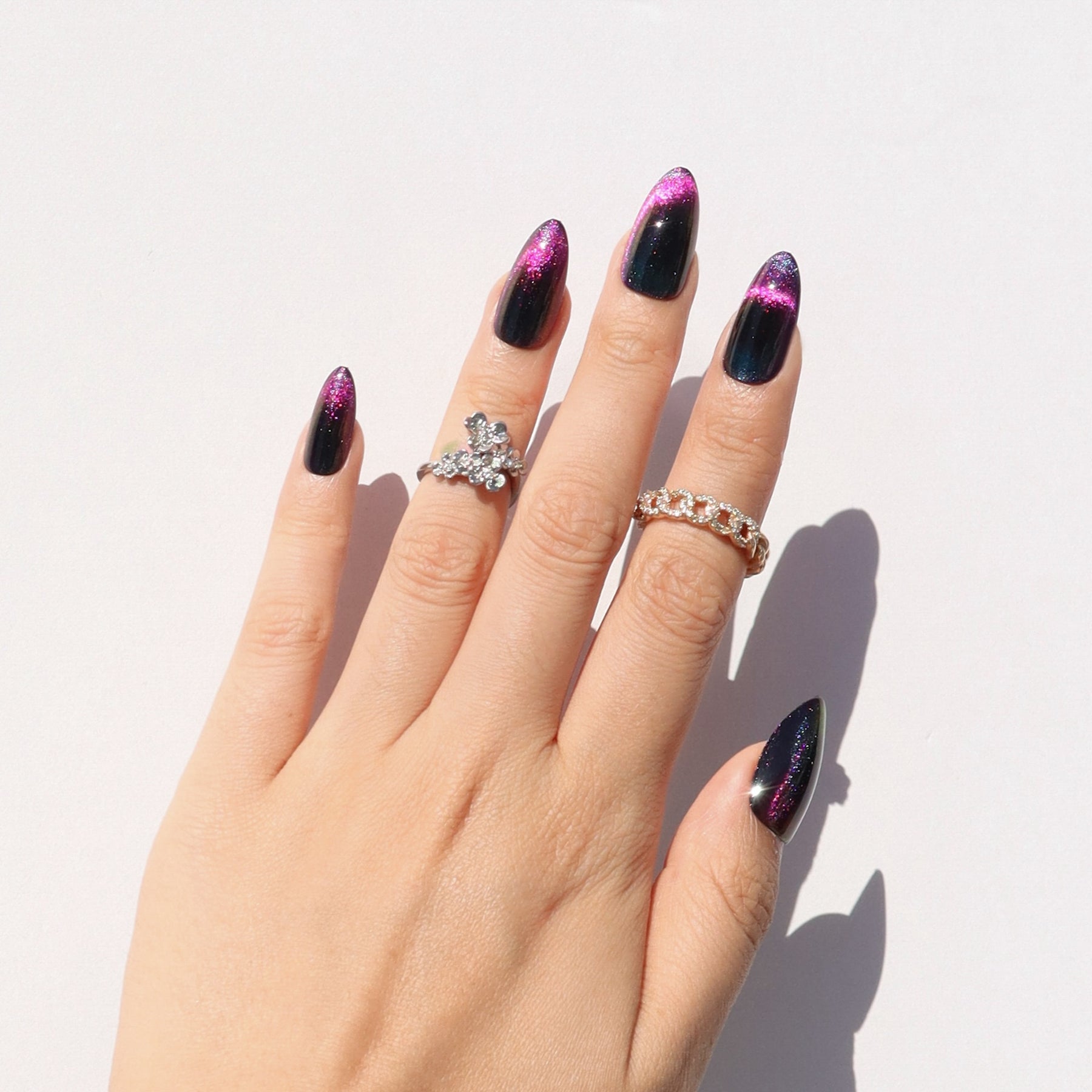 The Supernova medium almond press-ons glow with the brilliance of the galaxy’s brightest light, brought to life in a shifting cat eye nail art effect. A seamless gradient of violet and green shimmers under every angle, creating the illusion of cosmic energy caught mid-burst. Finished with a glossy top coat effect and sculpted in a sleek almond shape, this design radiates power, polish, and otherworldly beauty.