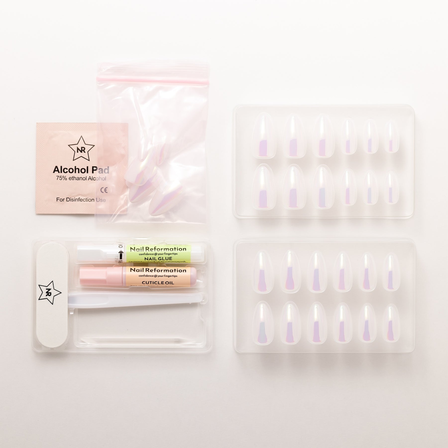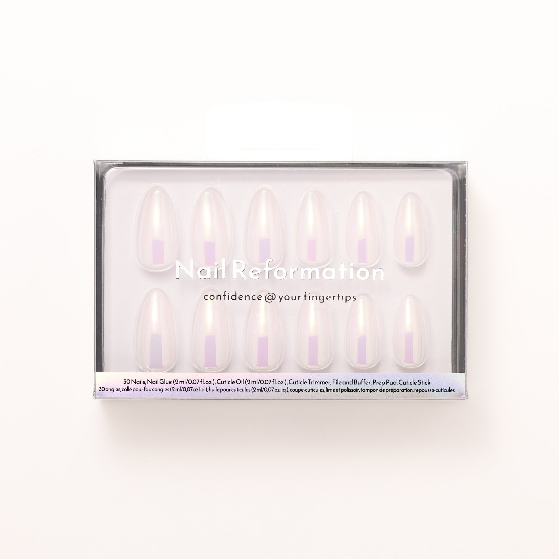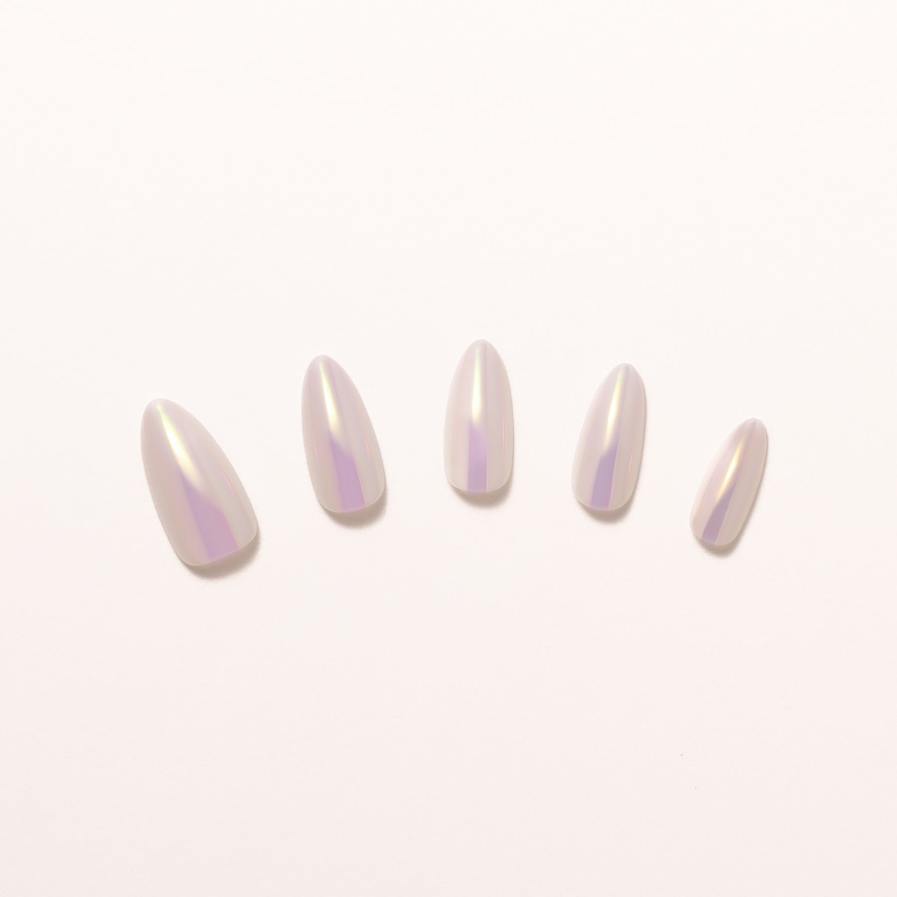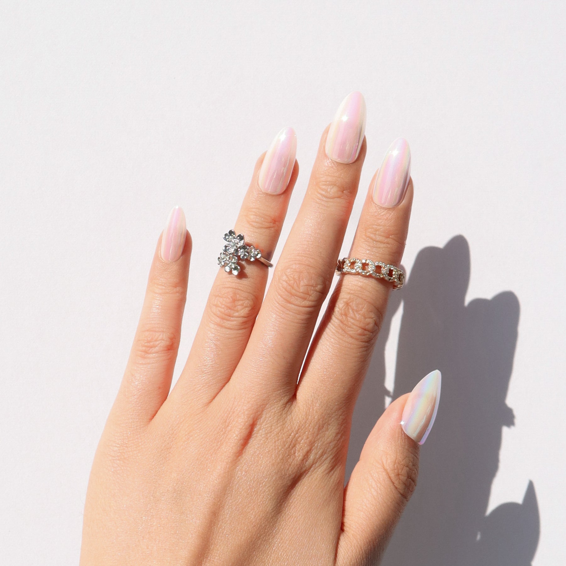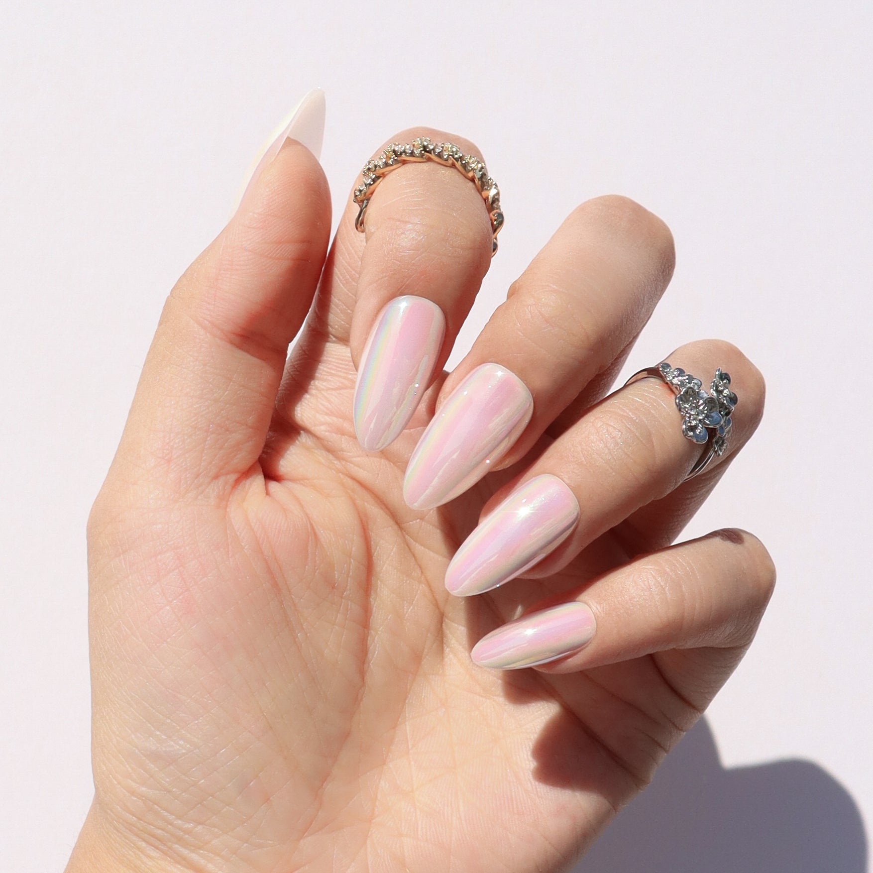 The Vapor Wave medium almond press-ons channel the retro-futuristic aesthetic of vaporwave, blending dreamy pastels with an iridescent glow. A glazed nail art effect shifts between lavender and pink, evoking the surreal colors of neon lights and hazy sunsets. The seamless glaze finish heightens the shine, while the almond silhouette adds modern polish. This design feels like digital art come to life; soft, nostalgic, and unapologetically futuristic.