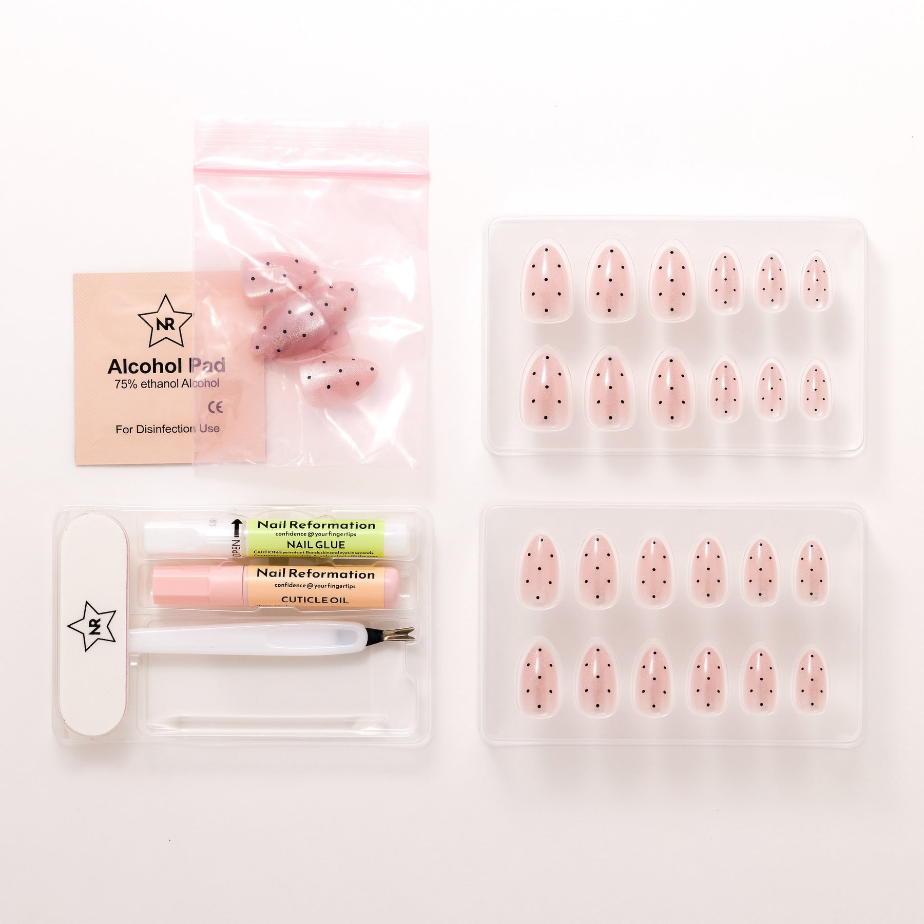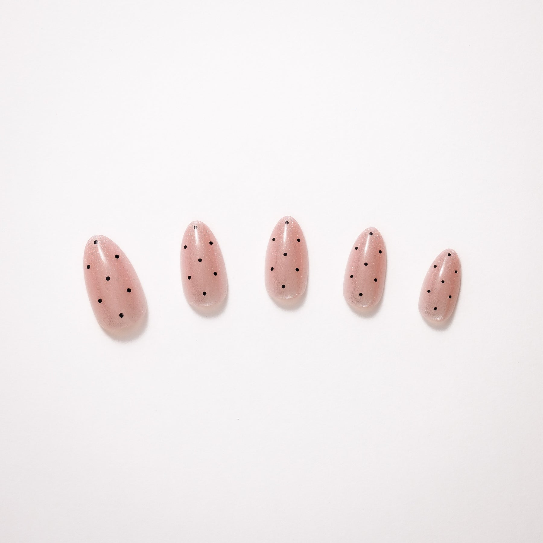 One in a melon. The Watermelon Seeds press-on nail set takes a fresh, playful approach to polka dots with a subtle fruit-inspired twist. Each short almond nail layers rosy pink with tiny black dotted accents that mimic watermelon seeds. A smooth, glossy finish ties the look together, creating a design that feels bright, balanced, and effortlessly fun. Perfect for those who love a little whimsy in their manicure routine.