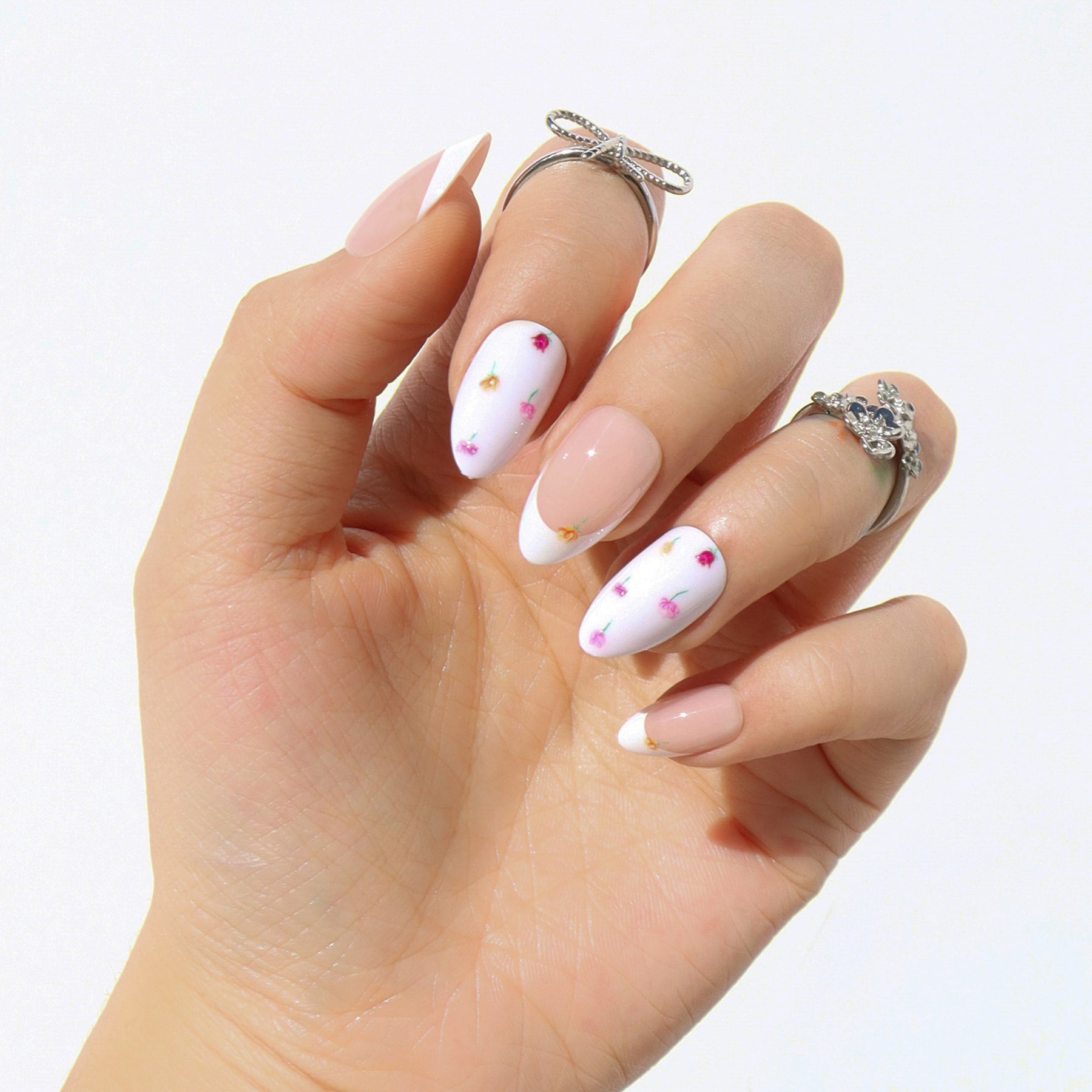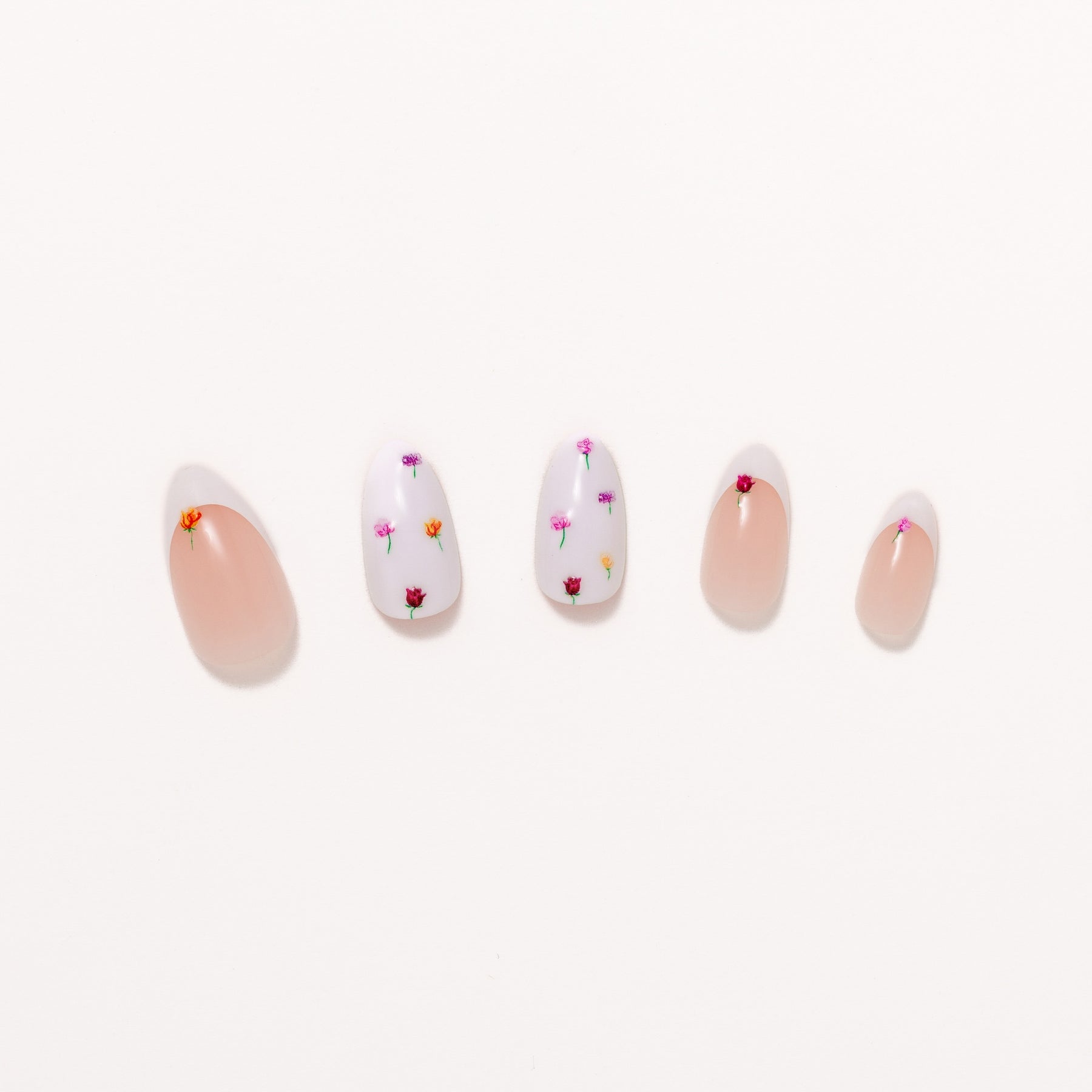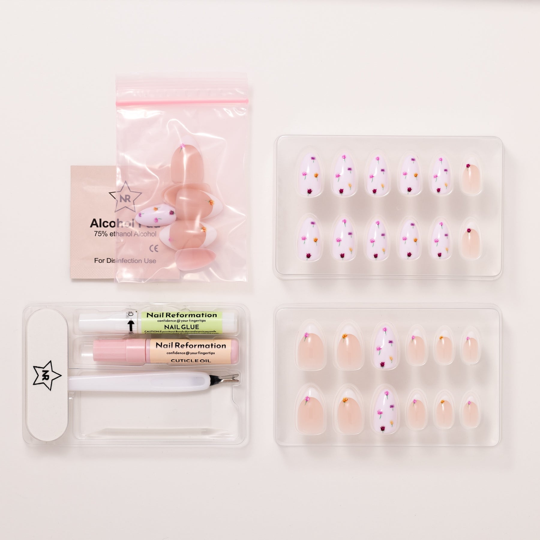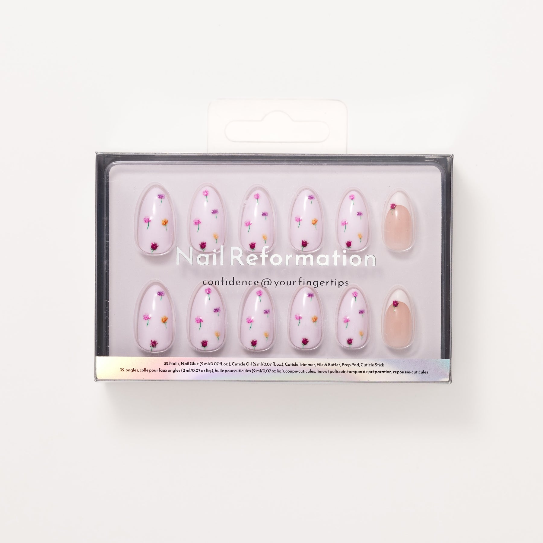 The Flower Bed press-on nail set by Nail Reformation brings a delicate, garden-inspired look to life with subtle dimension and thoughtful detail. Designed in a short almond shape, each nail features a sheer, milky base that keeps the look light, airy, and wearable. Embossed 3D floral accents are gently placed across the nail, creating the effect of tiny blossoms resting on the surface rather than printed flat. The soft pops of color add visual interest while maintaining an understated, balanced feel. Finished with a smooth, high-shine glossy coating, this set offers a fresh, tactile take on florals that feels modern, refined, and quietly playful.
