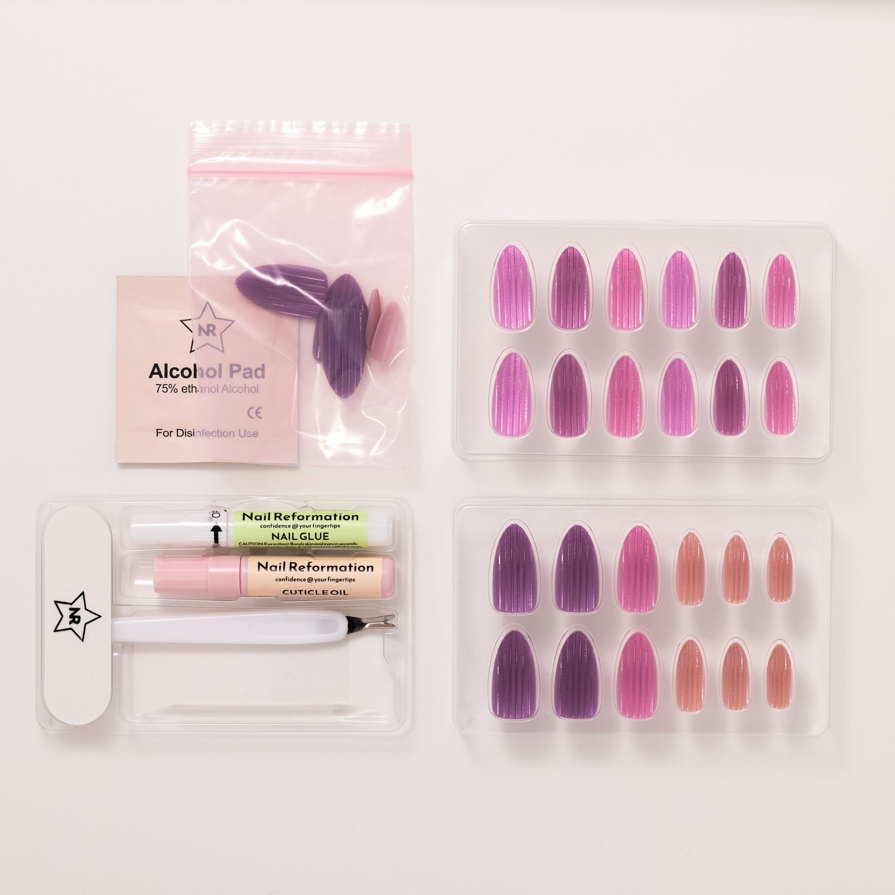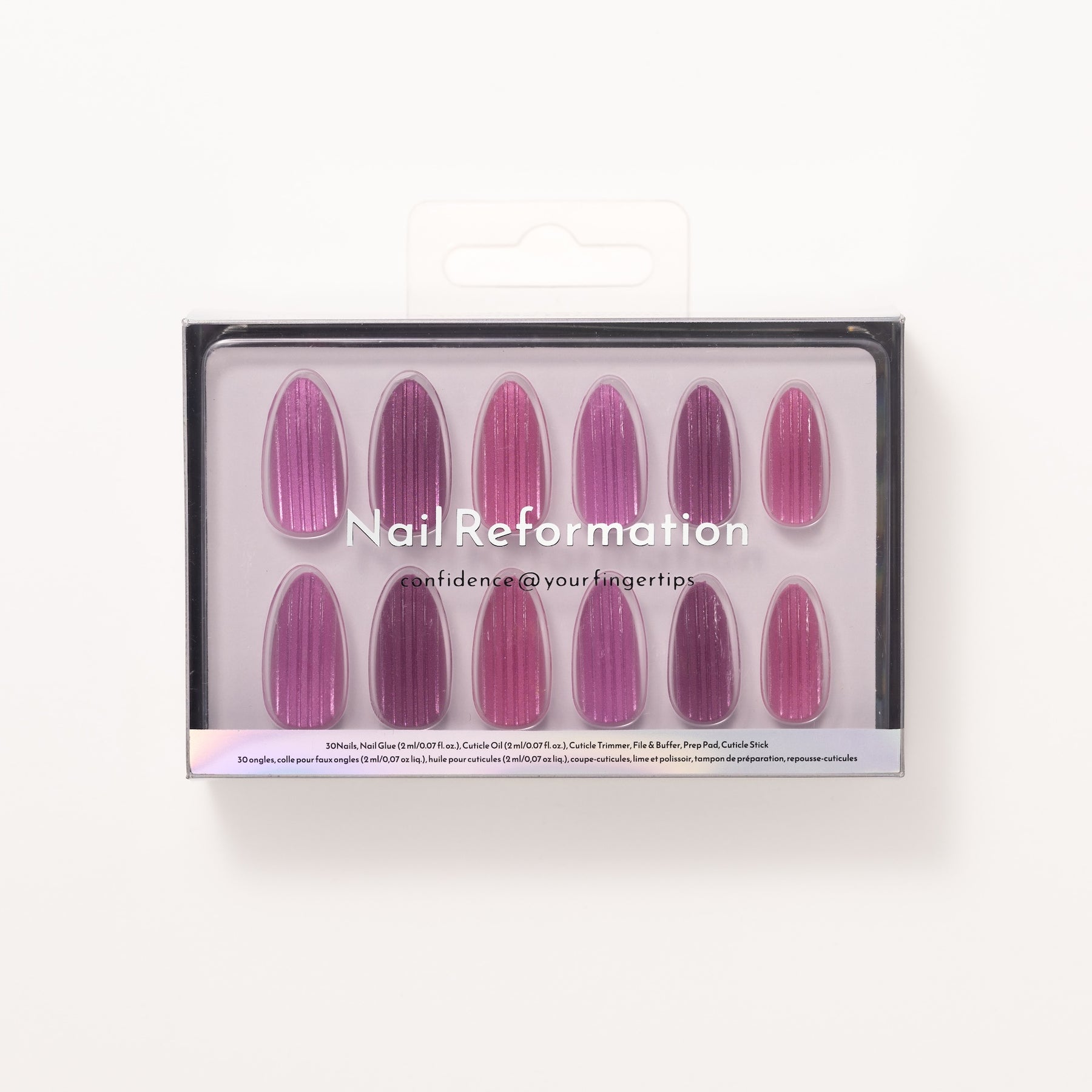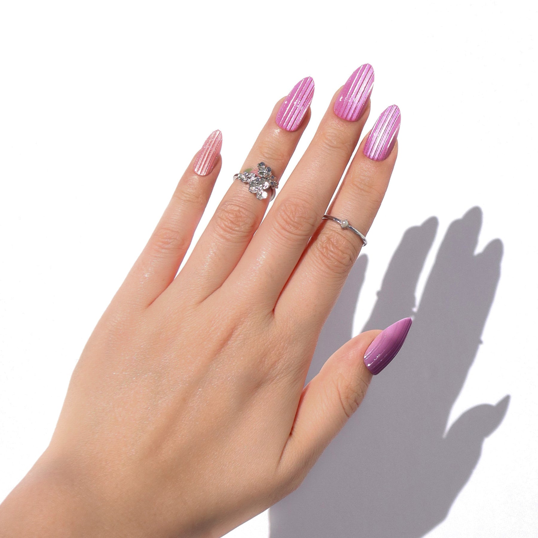 The Lavender Luster delivers a softly polished look with a refined, velvety finish. Designed in a medium almond shape, each nail features a muted lavender base with a smooth matte texture that feels calm and composed. A subtle, light-catching line runs through the center of each nail, adding just enough luster to create a high shine look without breaking the softness of the finish.