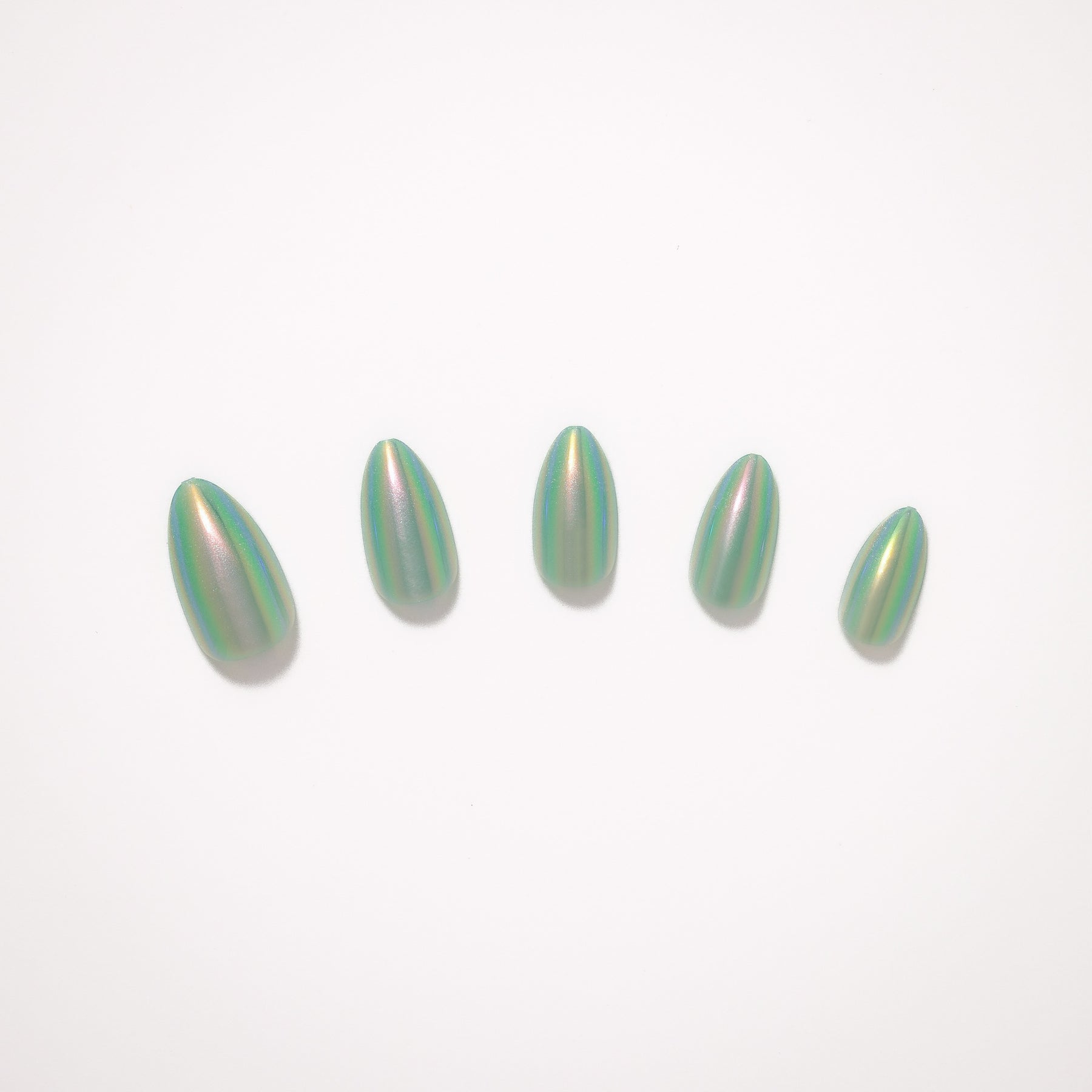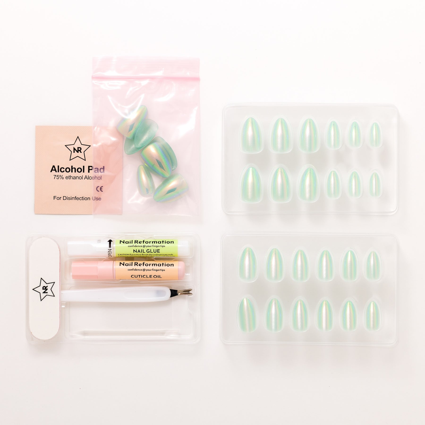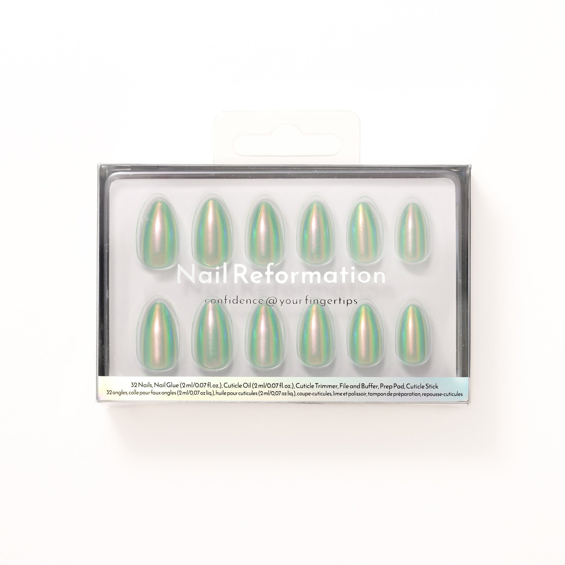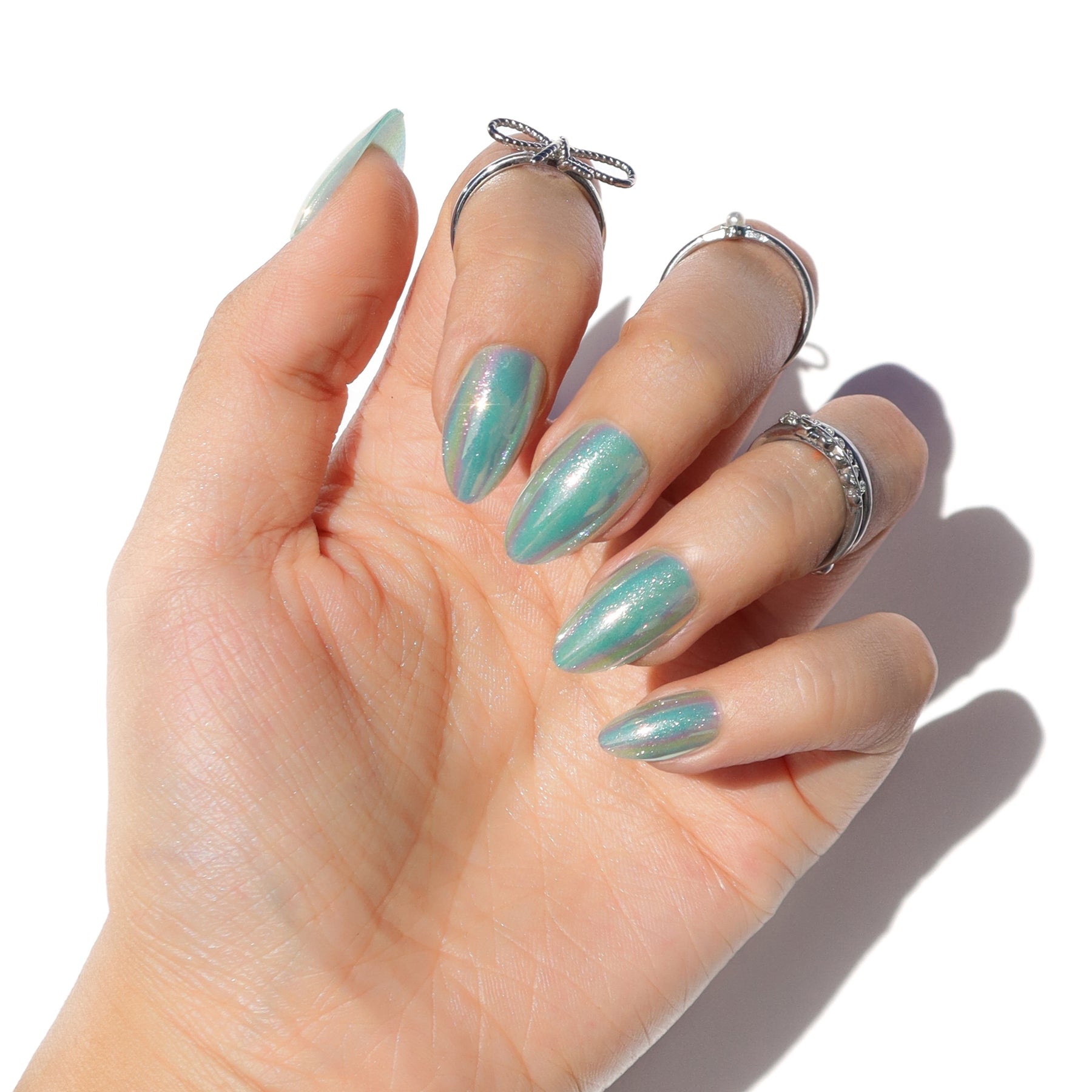 Made to be adorned. The Crystal Ornament press-on nail set captures the elegance of holiday ornaments with a mirror-like metallic glaze and cool iridescent sheen. Each nail reflects light like a hand-blown glass ornament, creating a frosted, luminous finish that feels festive yet refined. A statement-making look for anyone who loves a touch of winter sparkle with a sophisticated twist.