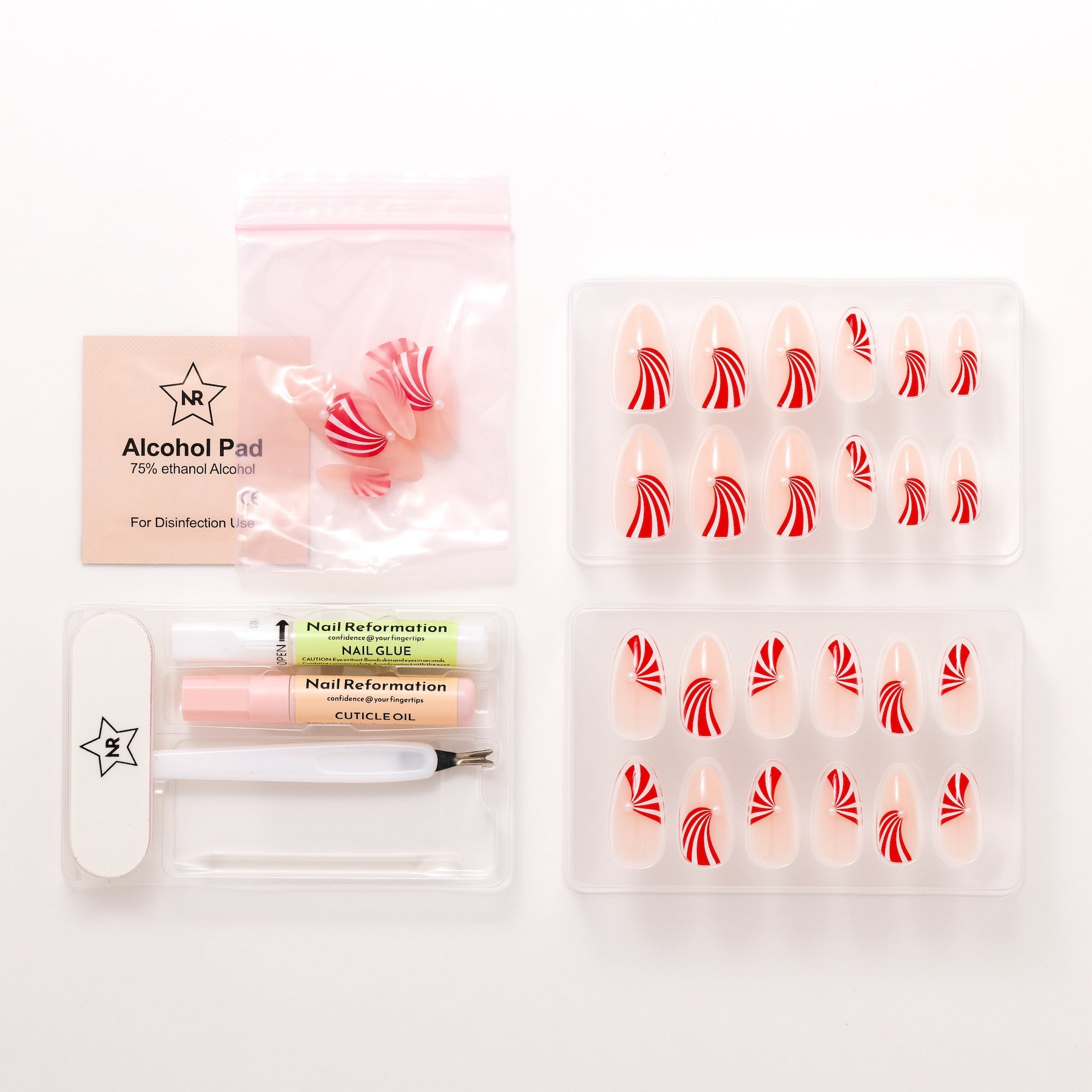 Mint to be merry. The Candy Cane press-on nail set reimagines the holiday classic with glossy red-and-white stripes and pearlescent accents that twirl like fresh peppermint. Designed in a medium almond shape, each nail feels festive yet fashion-forward—balancing playful nostalgia with modern polish. Sleek, sweet, and perfectly striped, this is the manicure equivalent of holiday cheer wrapped in shine.