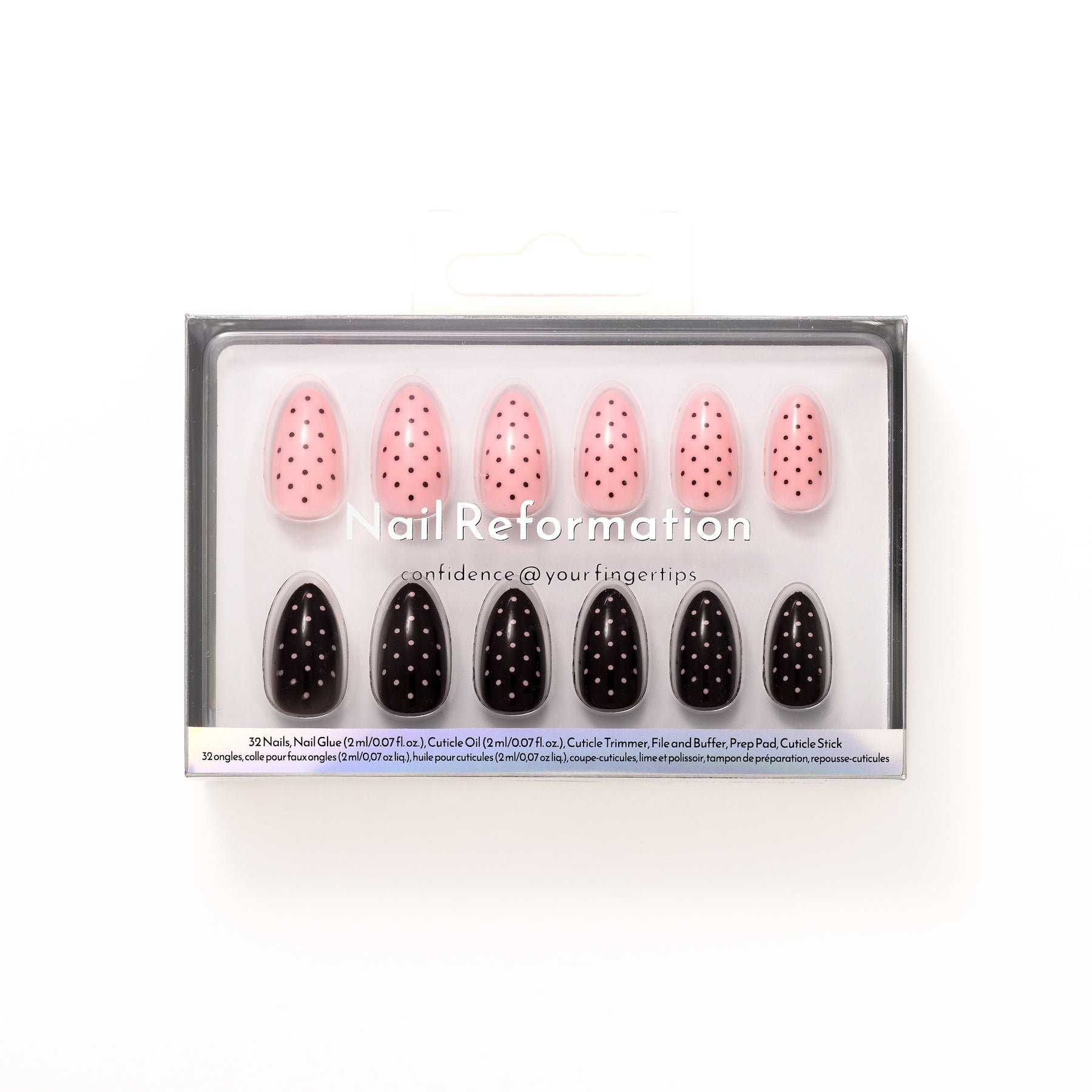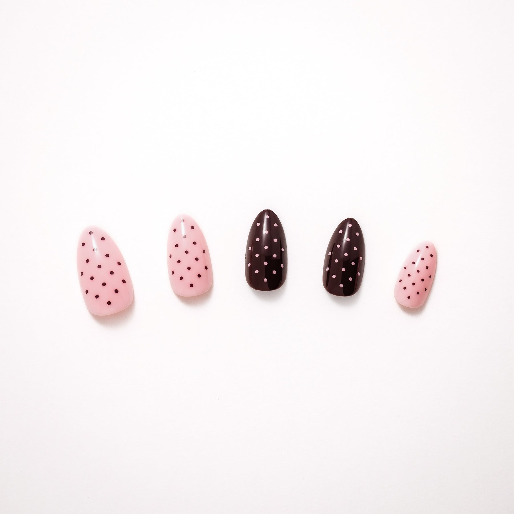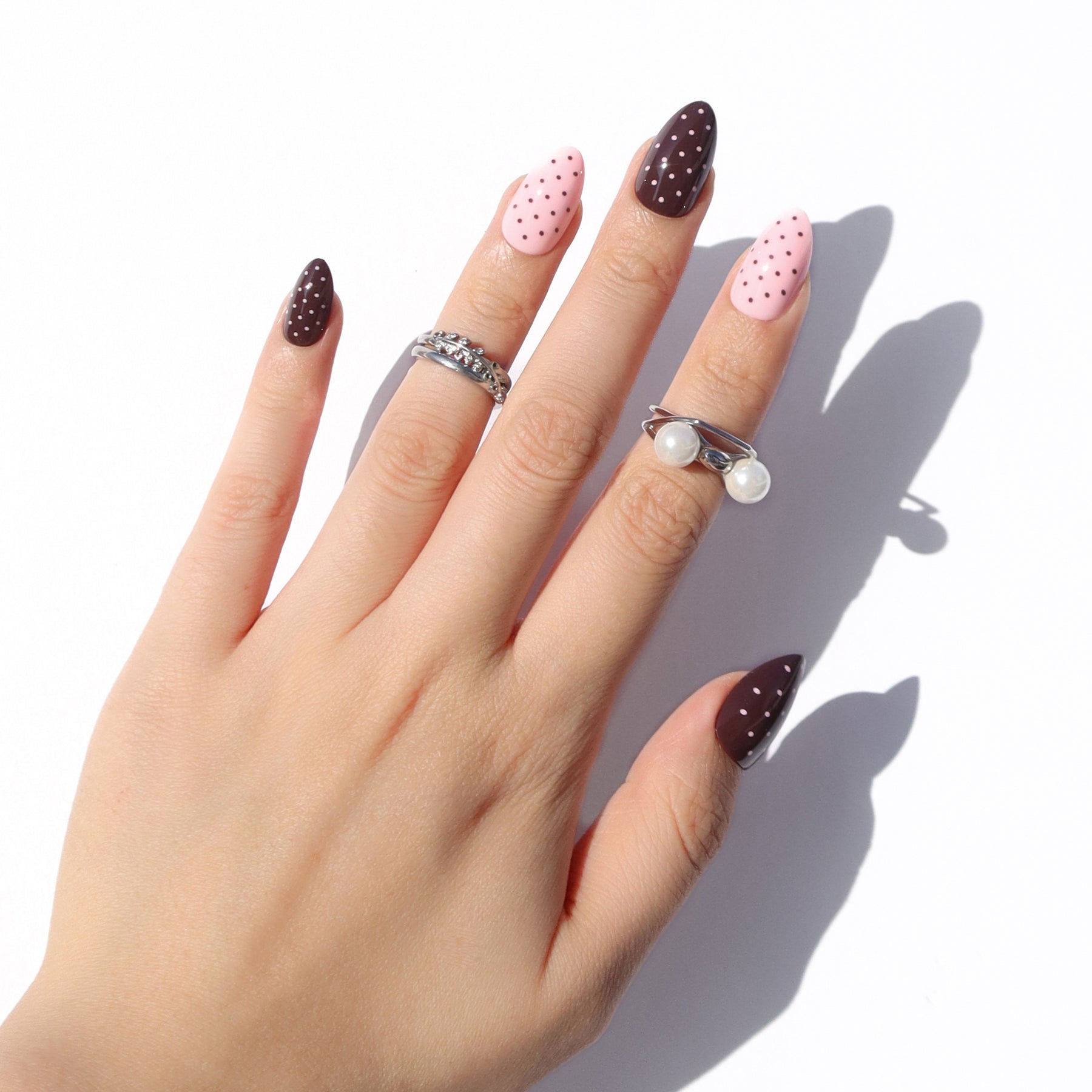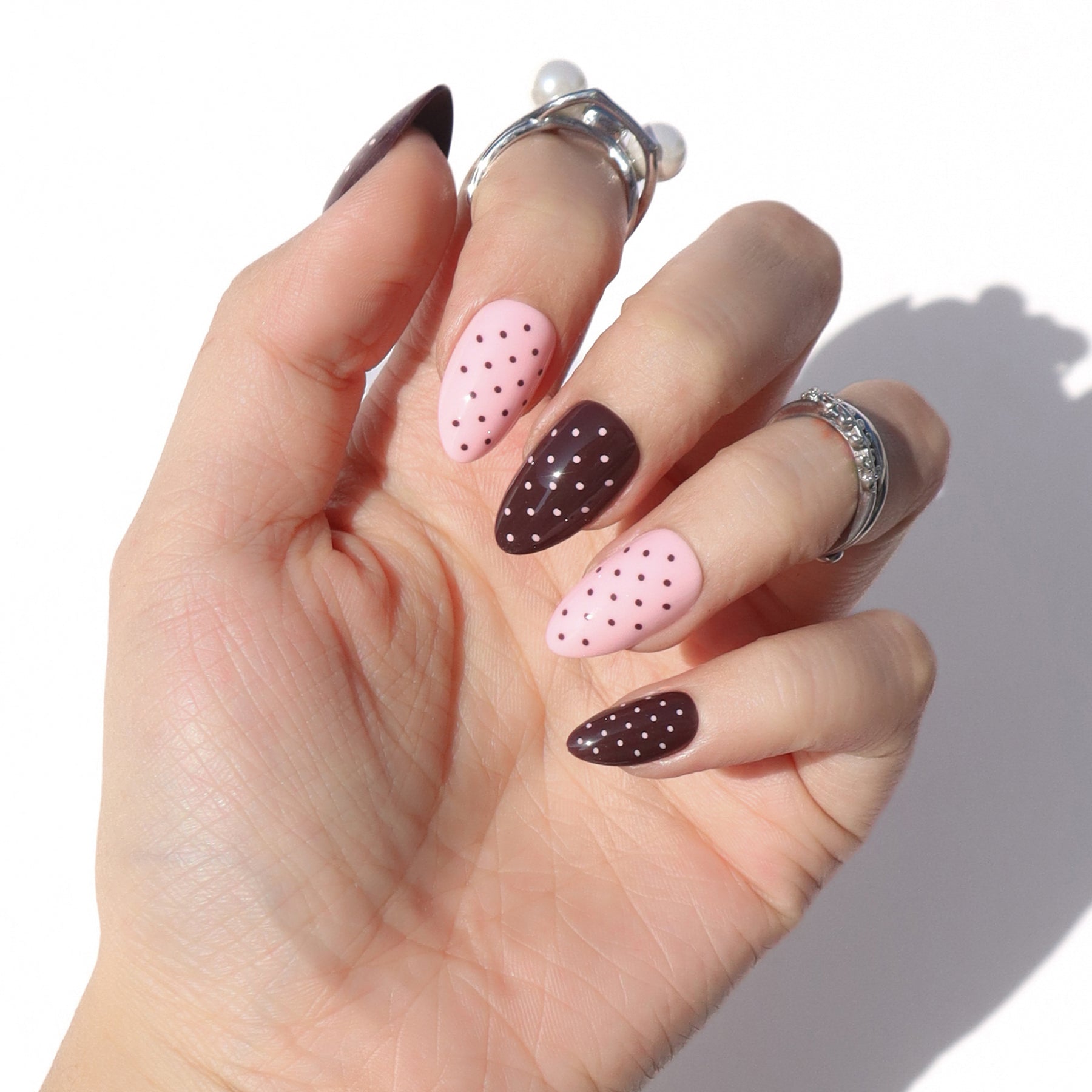 Twice as sweet. The Double Dip press-on nail set reimagines the classic polka dot with a glossy, dipped-in-delight finish. Inspired by strawberry-and-chocolate treats, each short almond nail features rich brown and creamy pink overlays topped with a smooth, high-shine polish. The contrast of color and texture gives every dot a decadent pop, making this look equal parts fun and fashionable. Perfect for anyone who loves a glossy statement with a touch of sweetness.