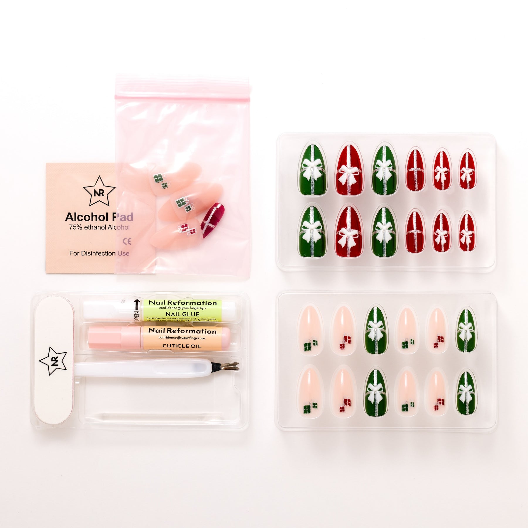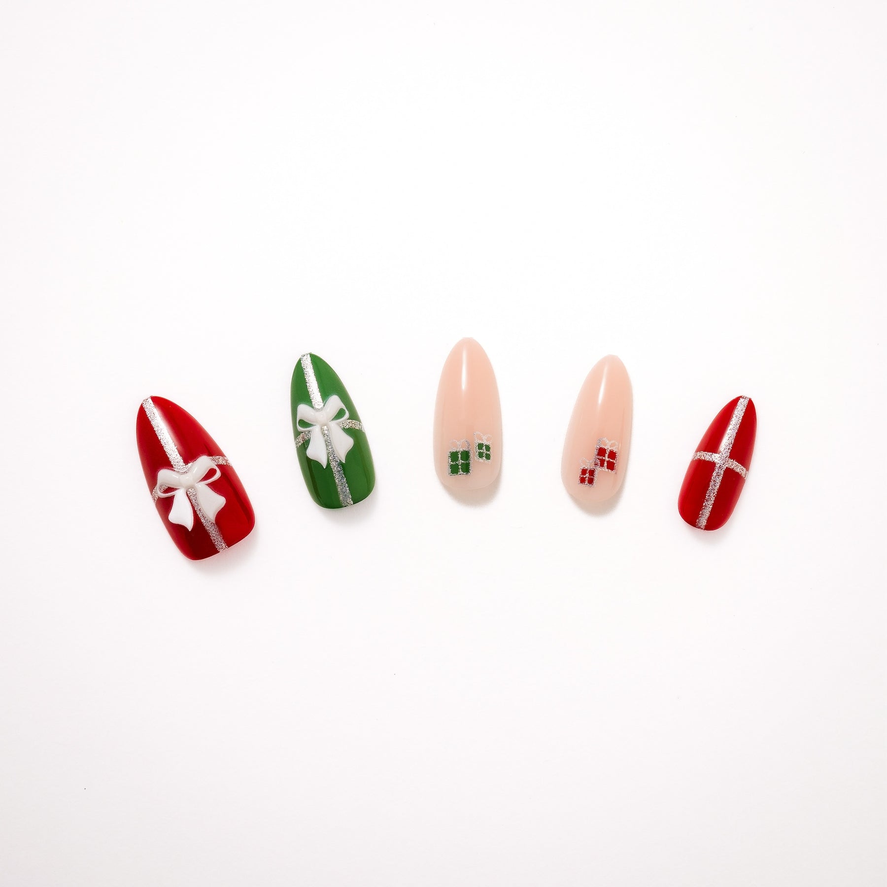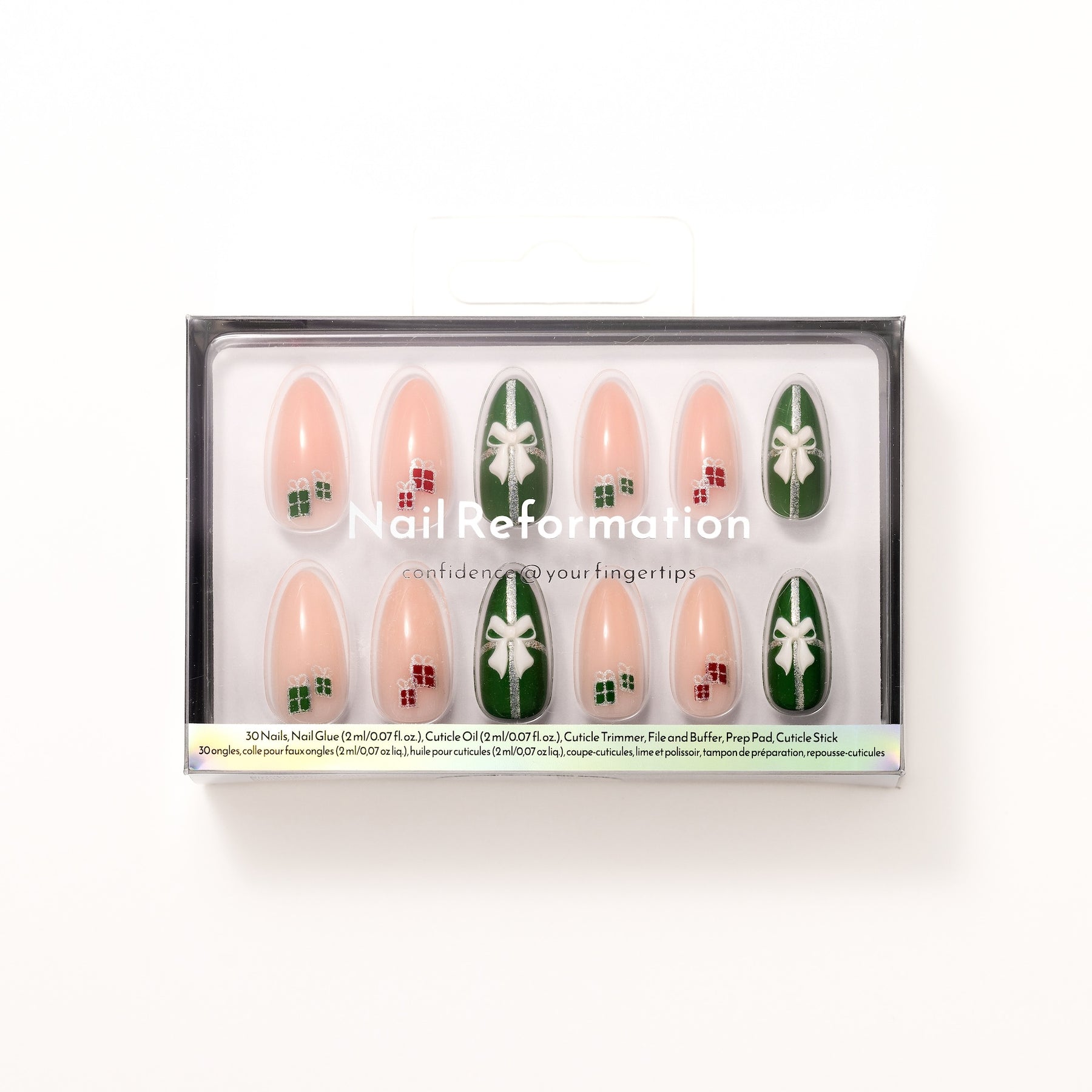 Be the present. The Gift Wrapped press-on nail set turns holiday glam into wearable art with glossy red and evergreen tones accented by silver ribbons and sculpted bows. The medium almond shape flatters every hand while the high-shine finish catches the light like a perfectly wrapped present. Elegant nude bases balance the design for a sophisticated contrast, creating a look that feels luxe, festive, and timeless. Whether you’re giving, receiving, or simply celebrating, this set proves that you are the gift.
