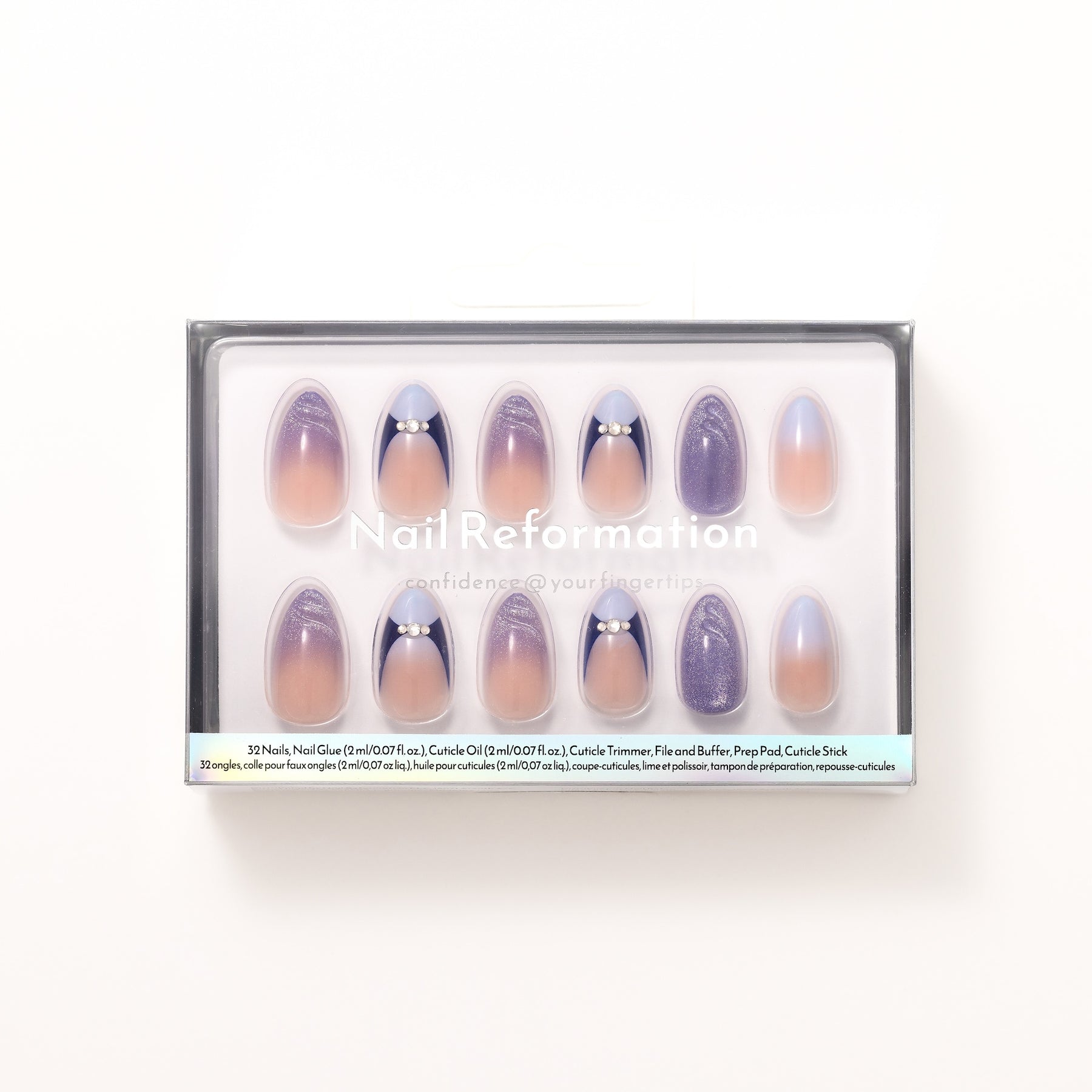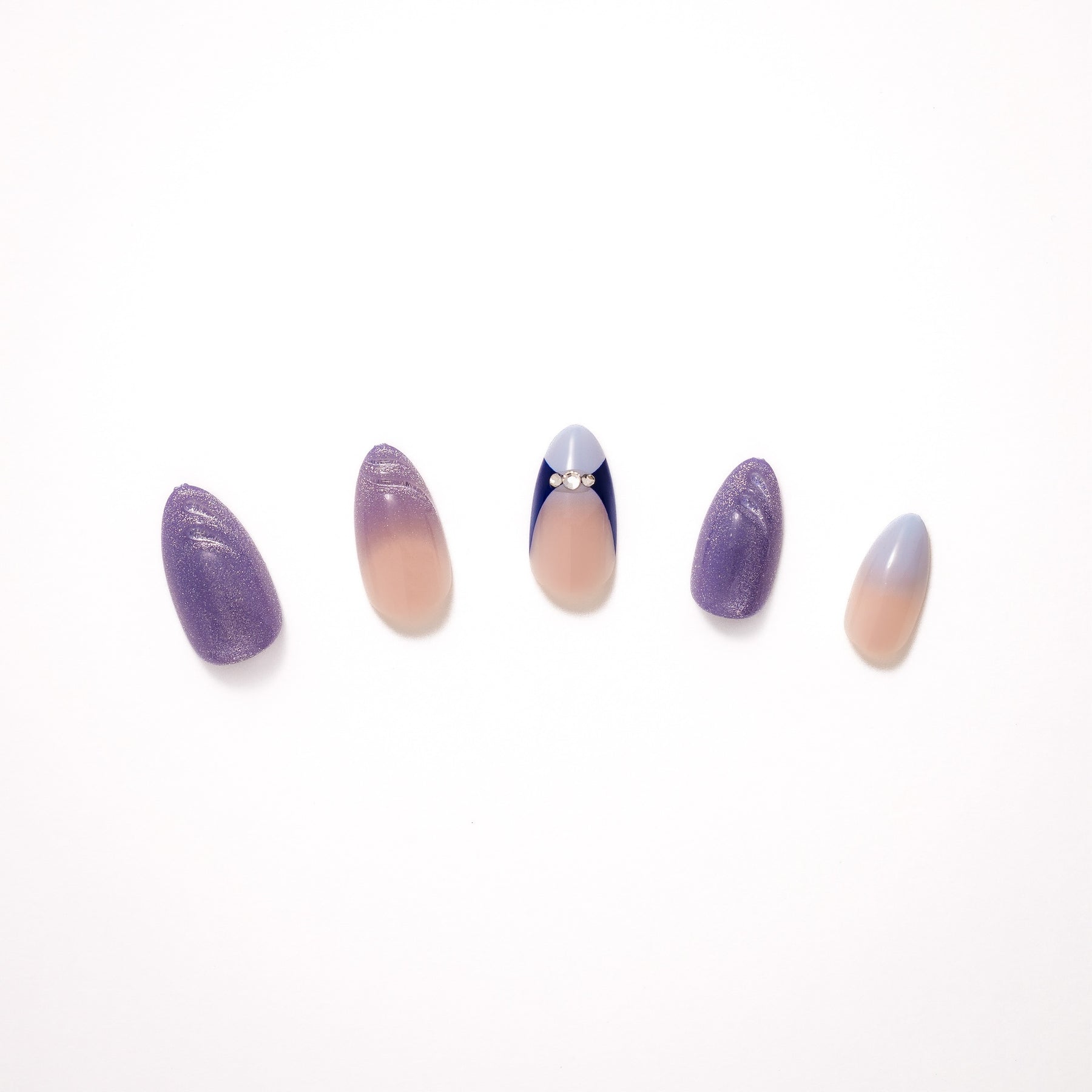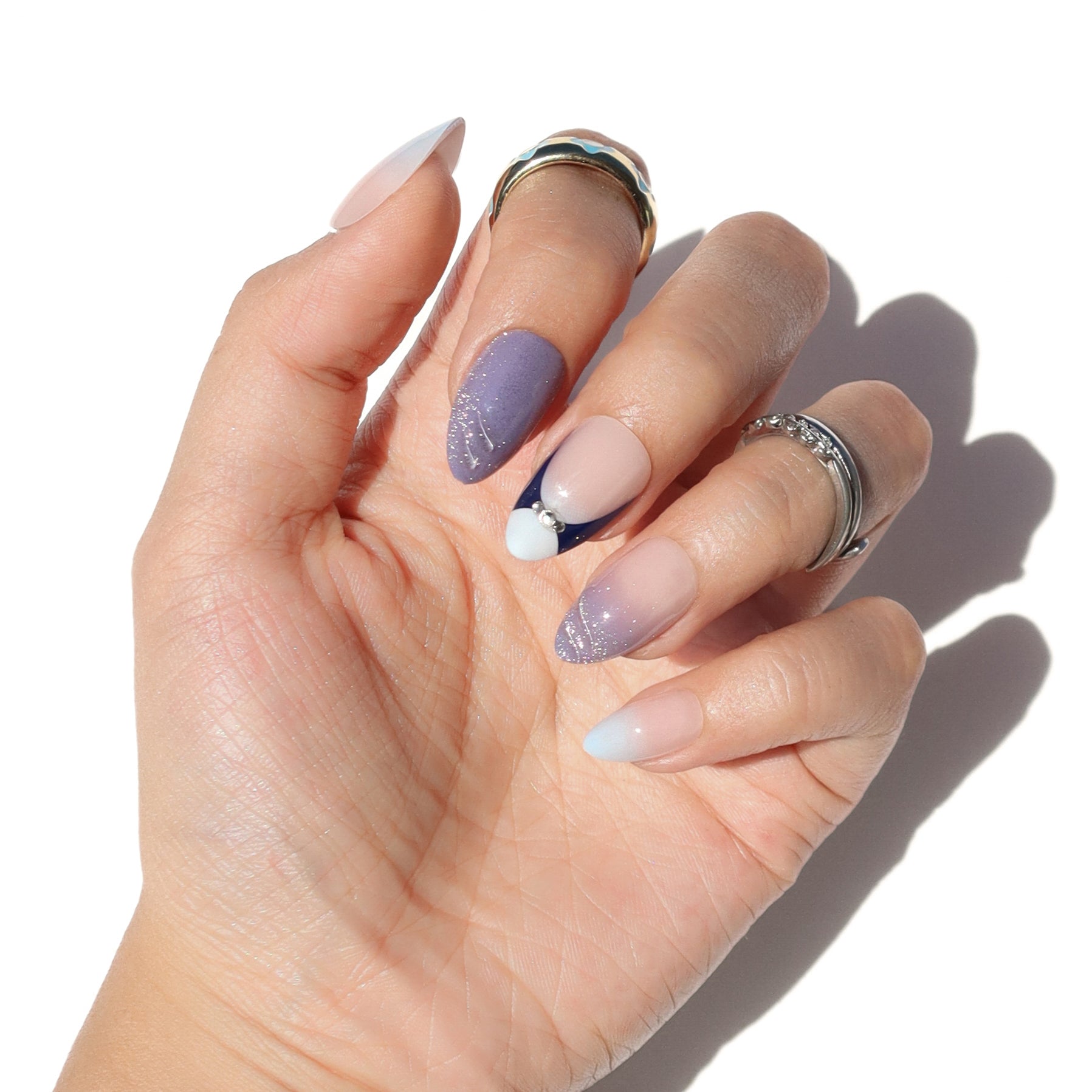 Light work from above. The Heavenly Glow press-ons deliver effortless radiance with soft lavender tones and a jelly cat eye finish that catches light like glass. Silver details glint delicately across each nail, giving a look that feels luminous yet weightless. With a glow that seems heaven-sent, this design captures that rare balance between soft grace and high shine. Proof that divine light really does good work.