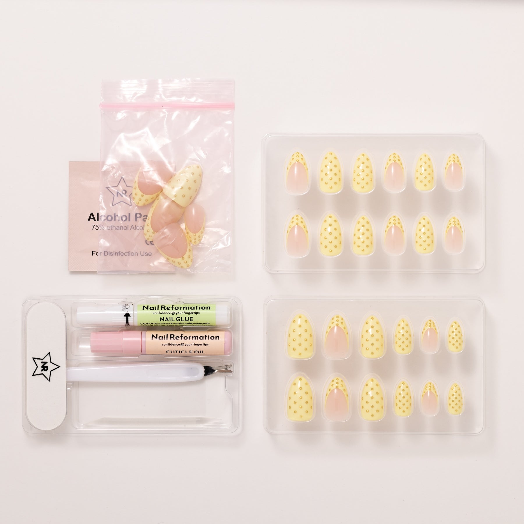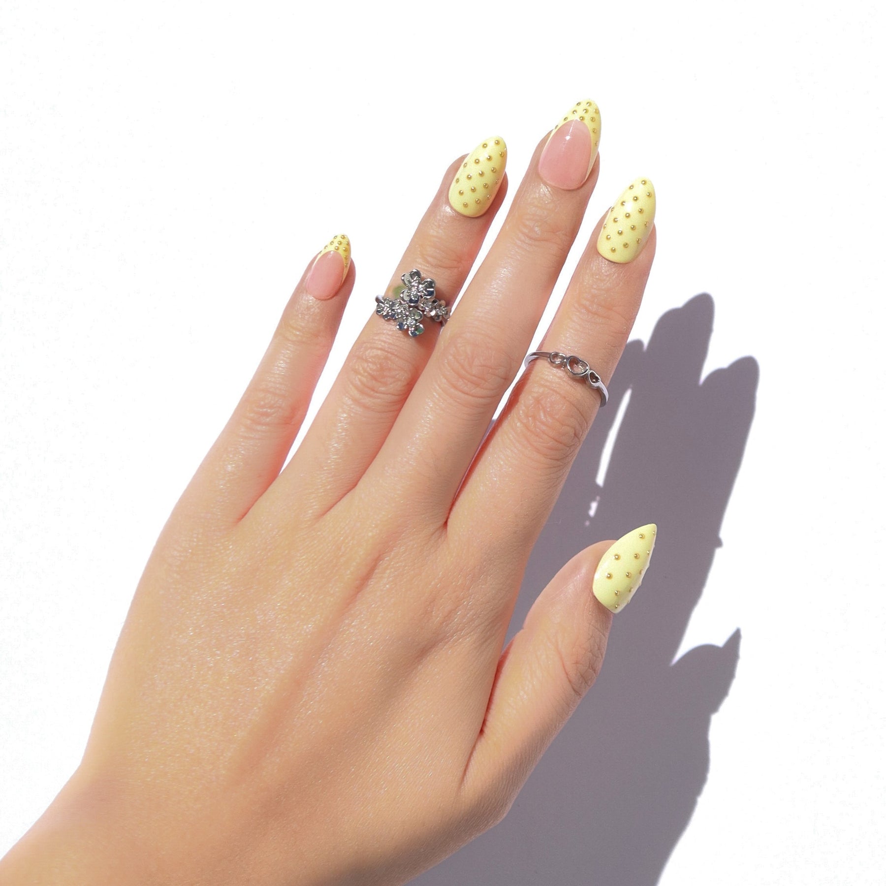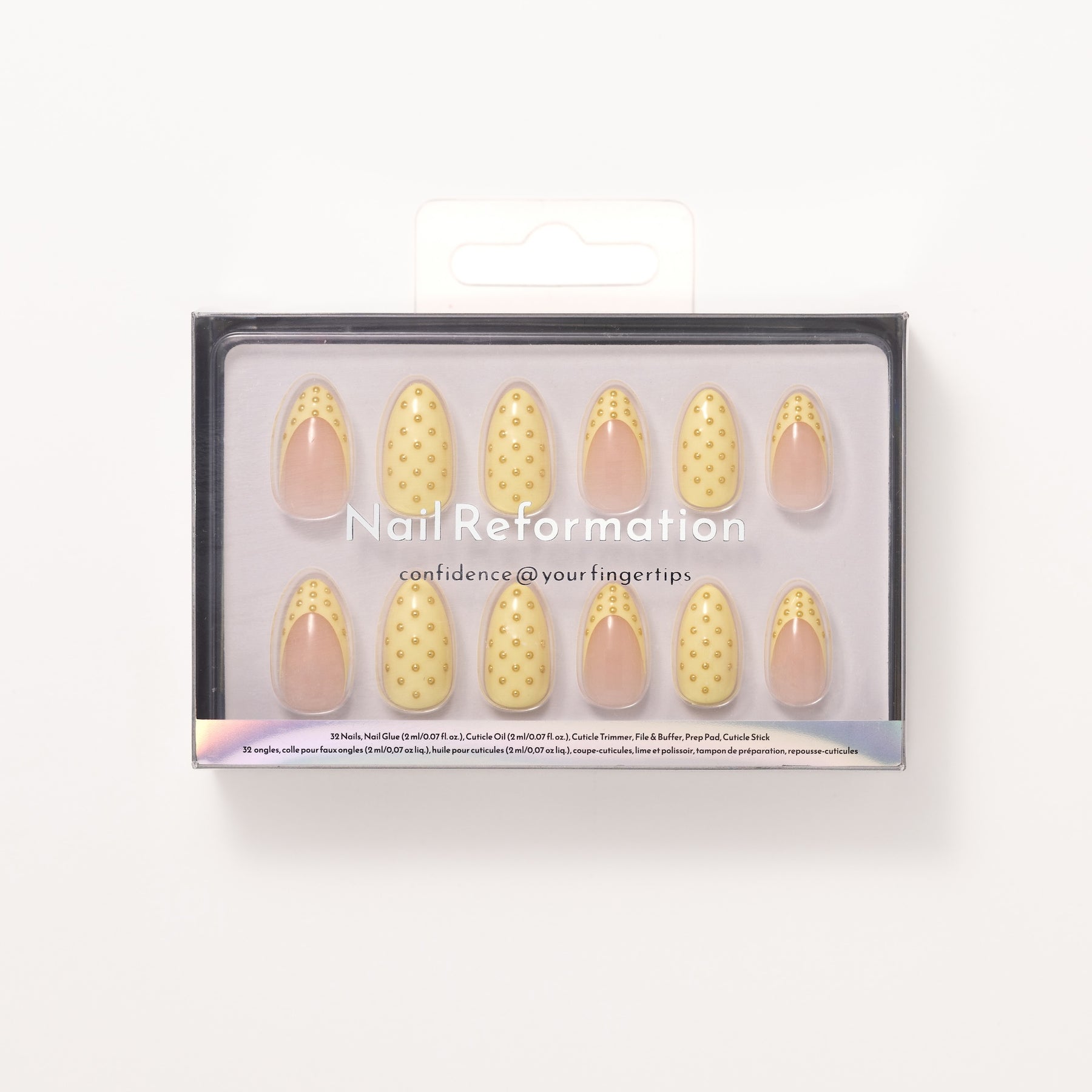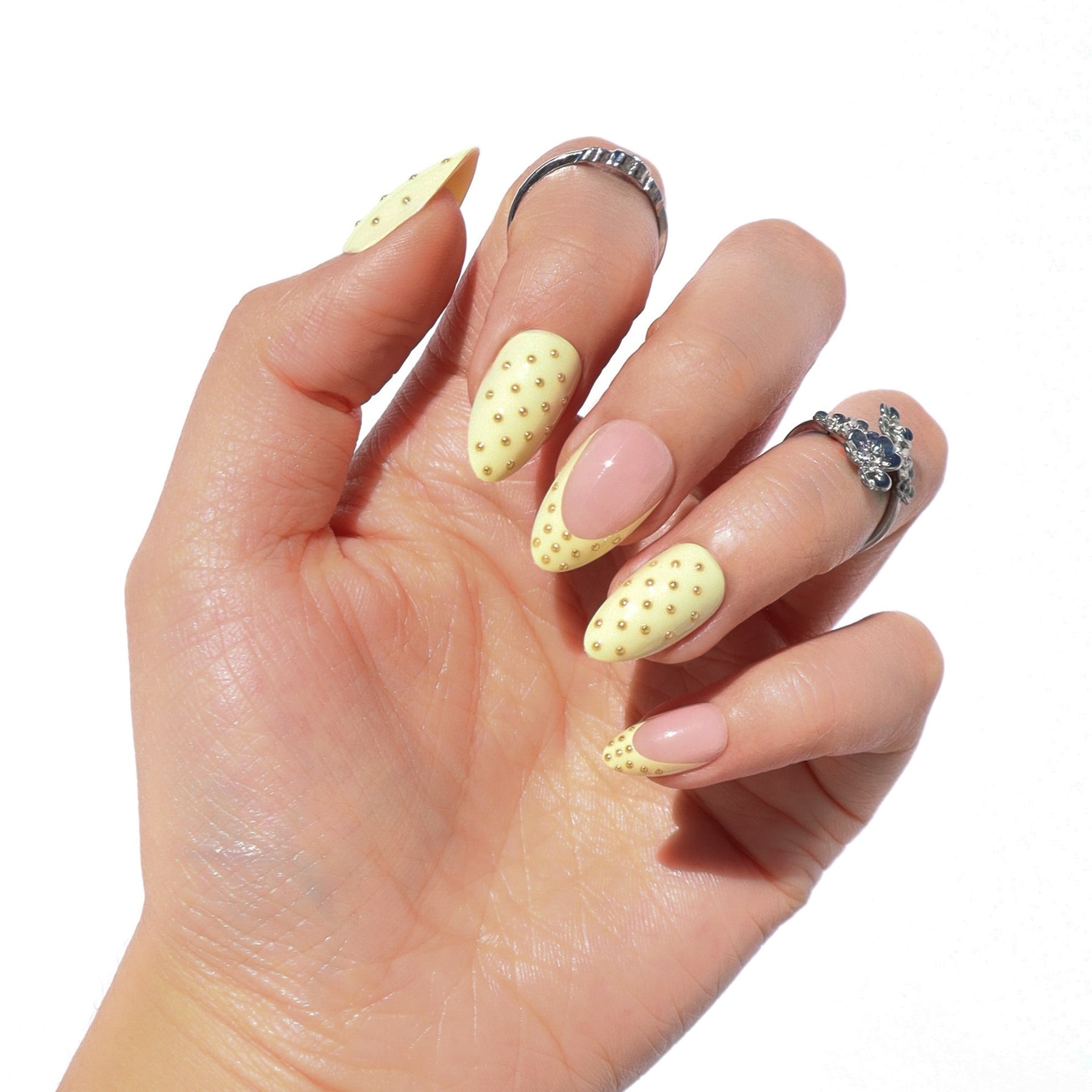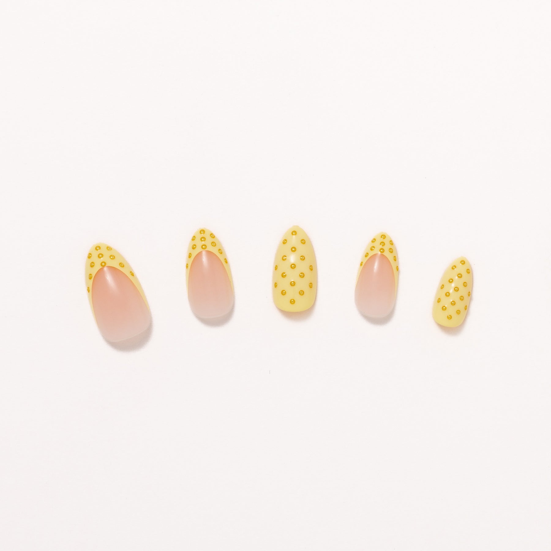 The Lemon Poppyseed press-on nail set offers a playful yet clinical approach to the classic French tip. Designed in a short almond shape, each nail features a sheer and milky base that keeps the look light and wearable. The design is defined by its butter yellow French tips which are detailed with 3D black dots to create the effect of tiny seeds resting on the surface. This intentional use of dot art provides a tactile dimension that is subtle enough for everyday elegance. The balance of a cheerful pop of color and restrained detailing keeps the look polished and composed. Finished with a high-shine glossy coating, this set offers a fresh and modern take on micro-artistry that feels refined and quietly playful.