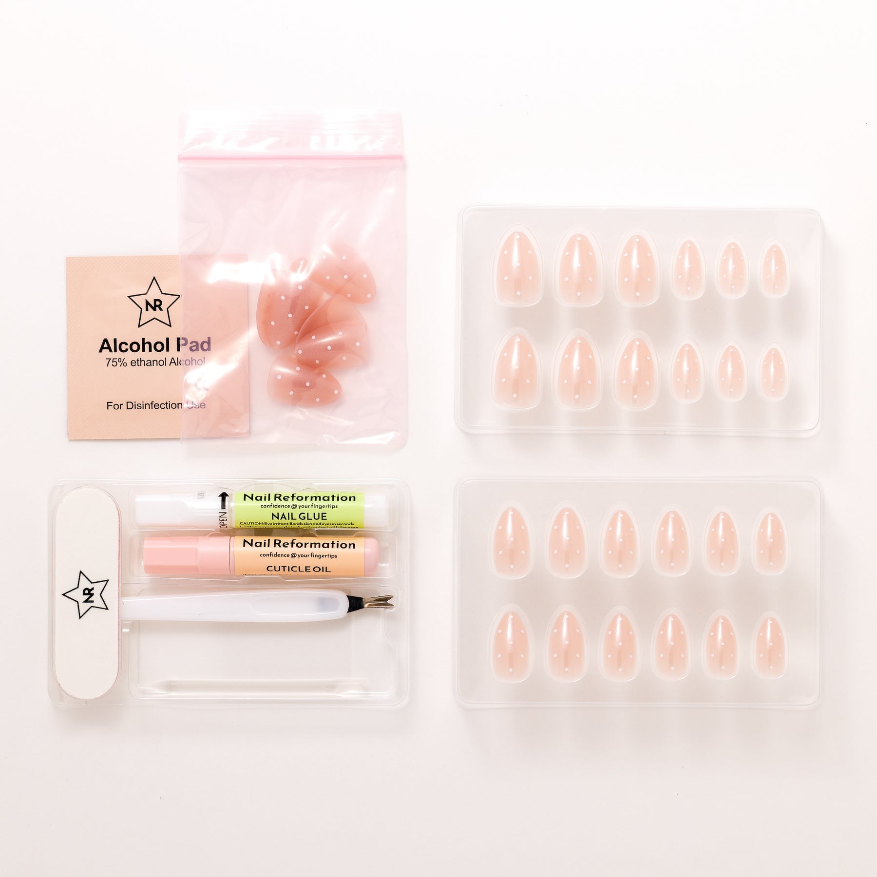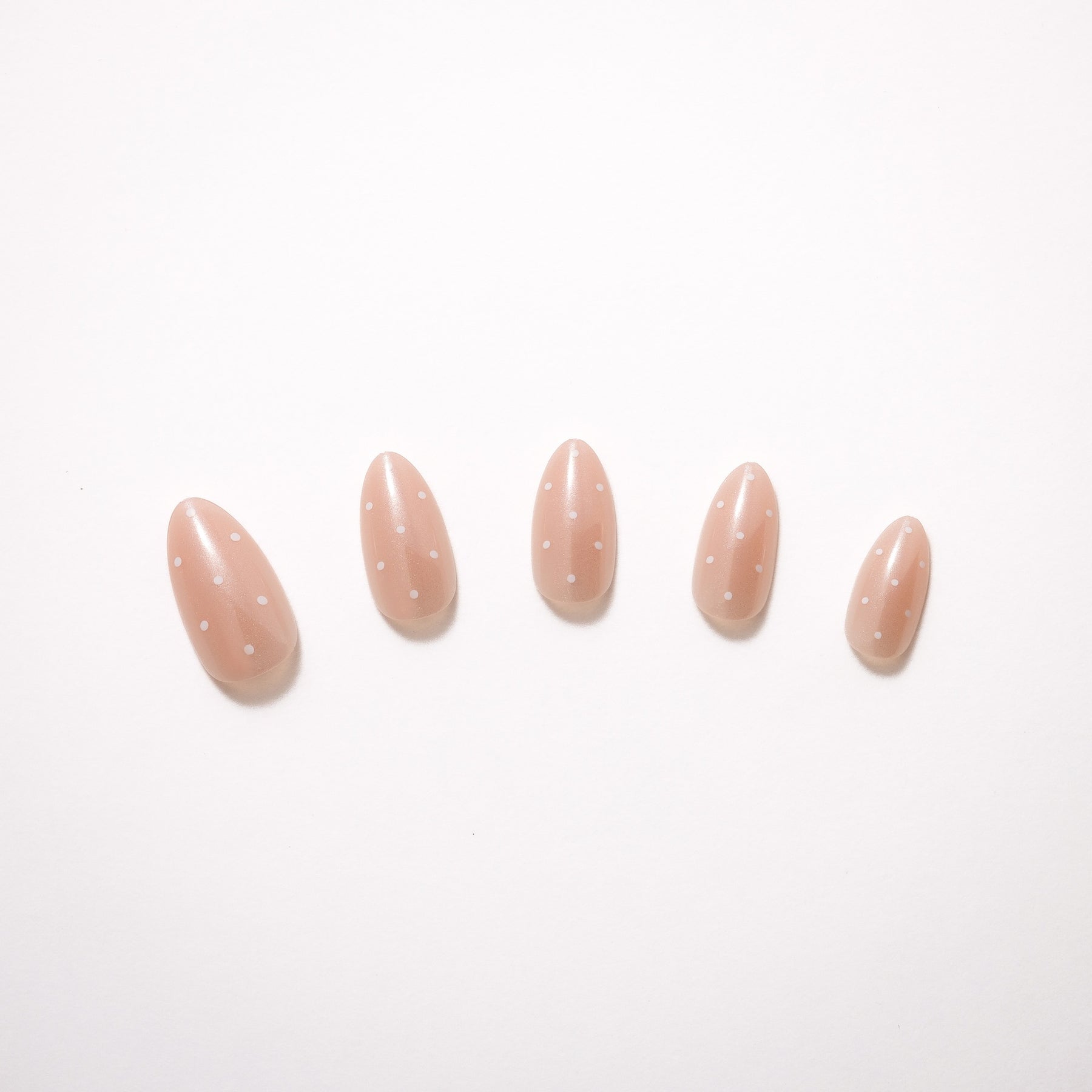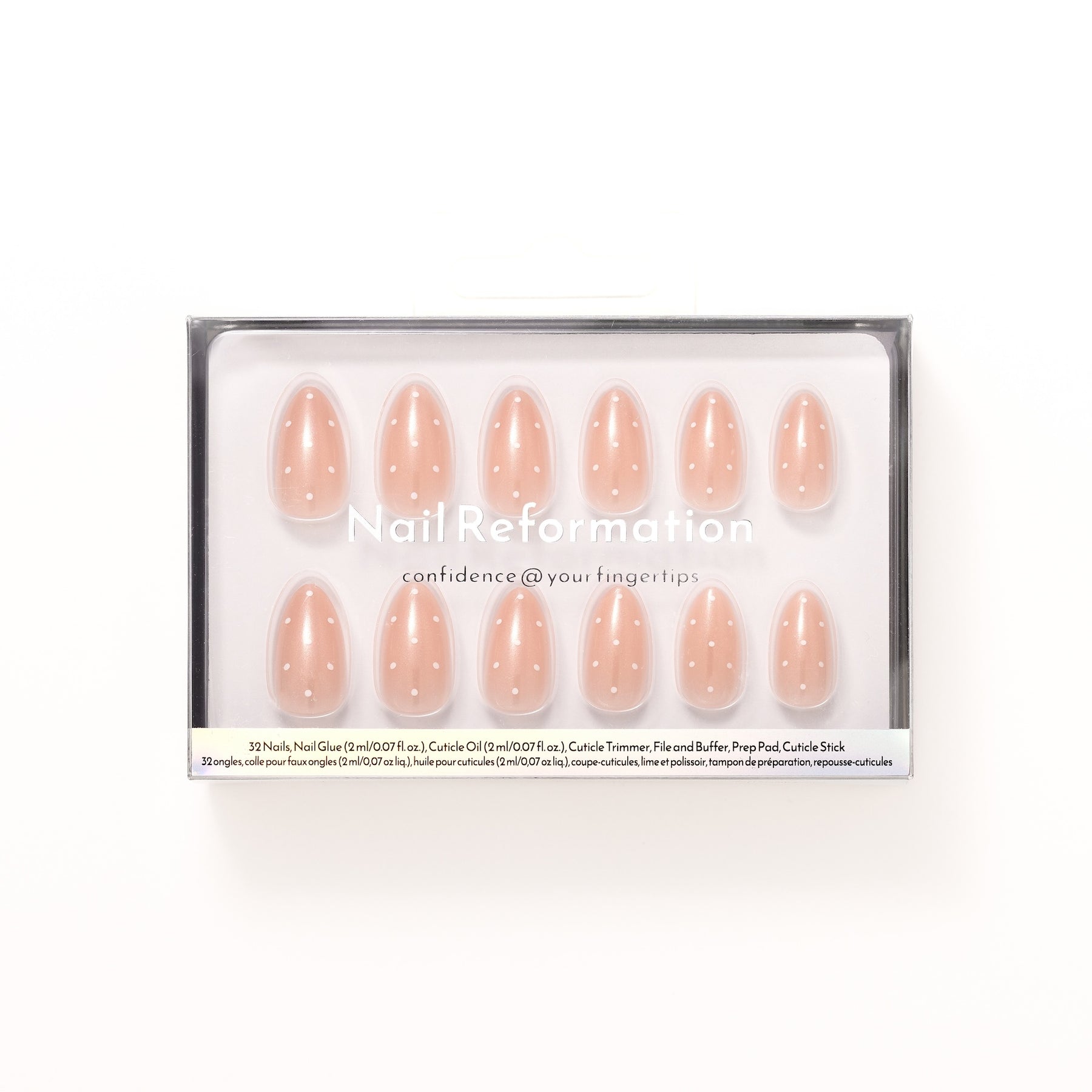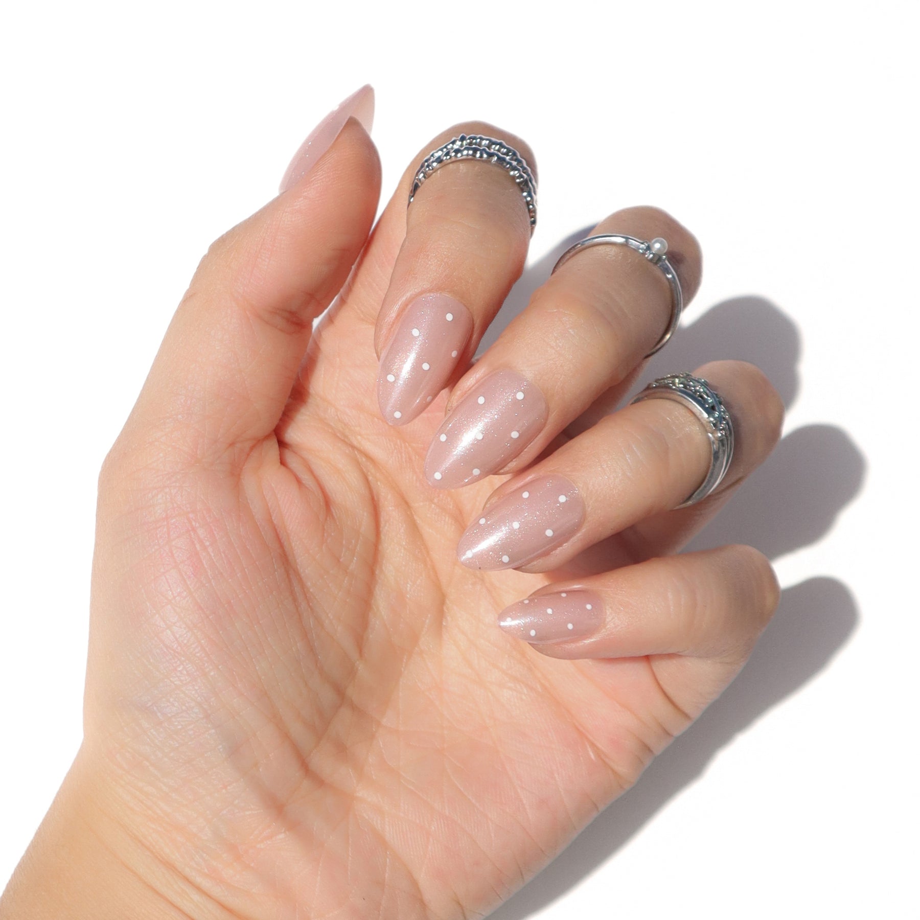 A spot of milk. The Milk Dots press-on nail set draws inspiration from the nostalgic candy favorite, reimagined in glossy, wearable form. The result is a pearlescent finish that feels indulgent yet understated. Playful, creamy, and perfectly polished, it’s the manicure equivalent of something sweet and timeless.
