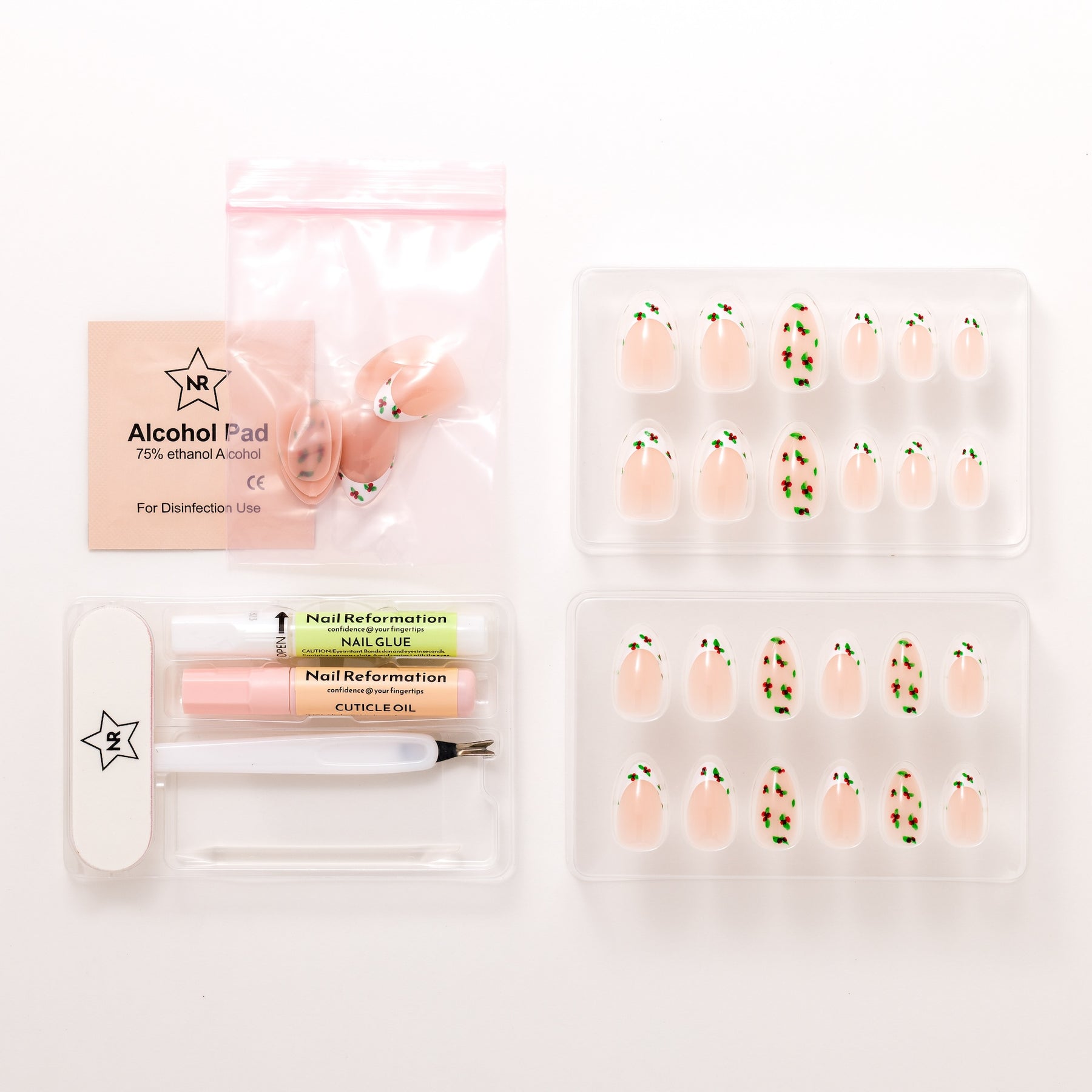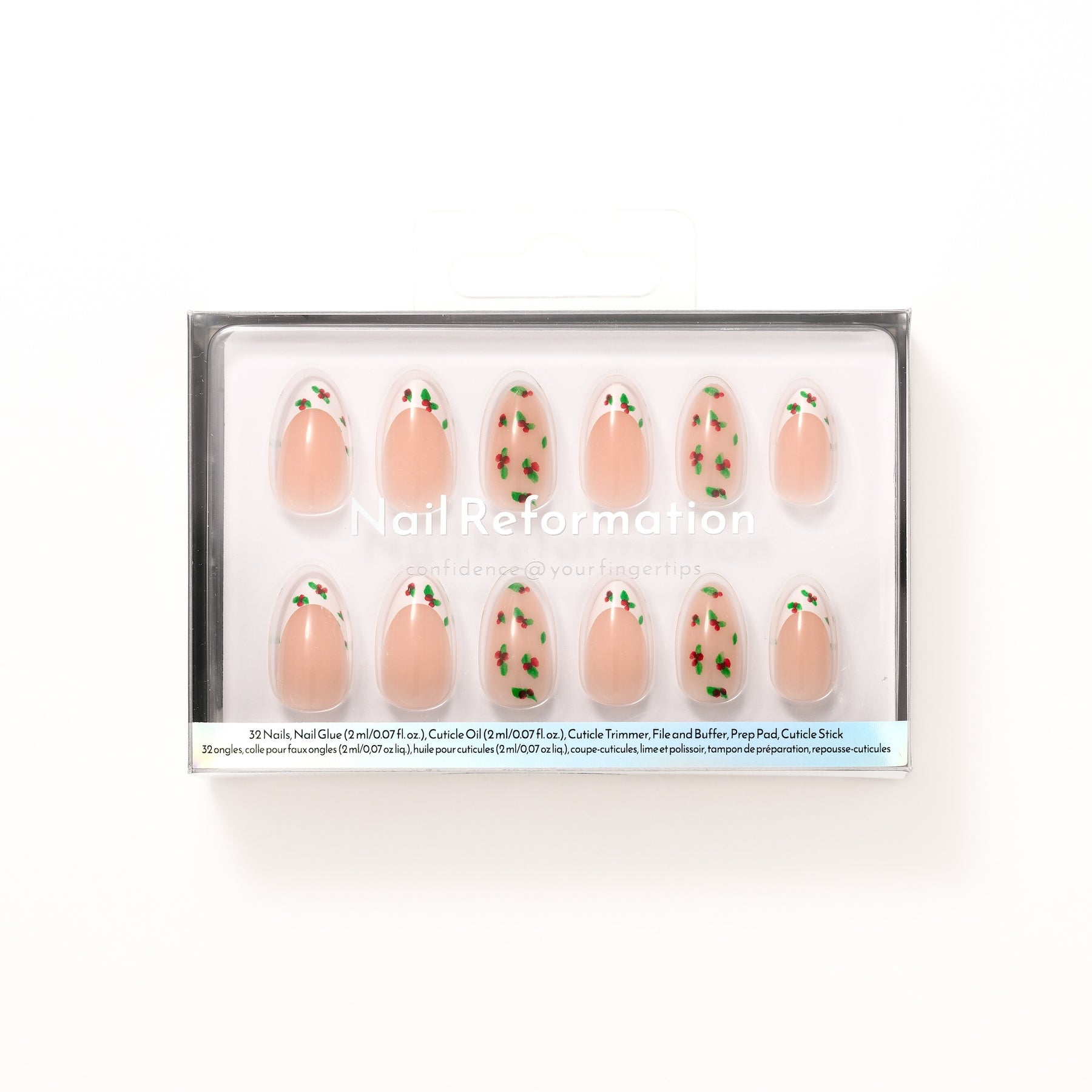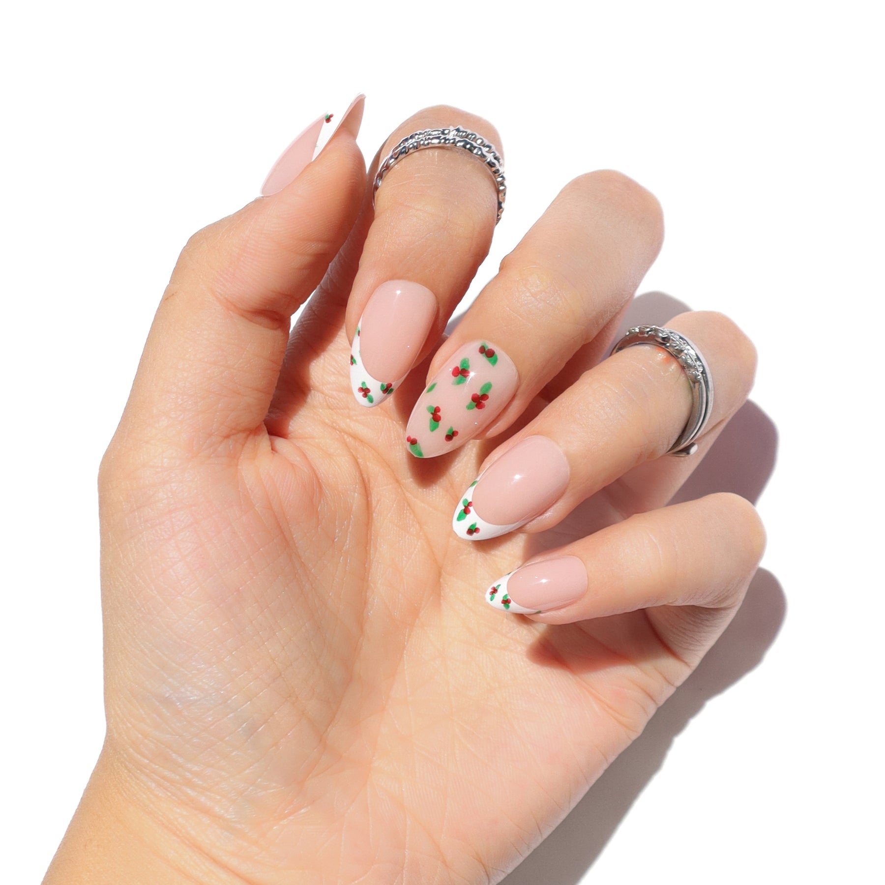 Meet under the lights. The Mistletoe Glow press-on nail set captures the warmth and sparkle of the season’s most romantic moment. With glossy nude bases adorned in delicate green sprigs and ruby red berries, this short almond design brings subtle holiday elegance to every gesture. Softly lit and effortlessly chic, it’s a modern take on tradition—perfect for party season or a moment under the mistletoe.