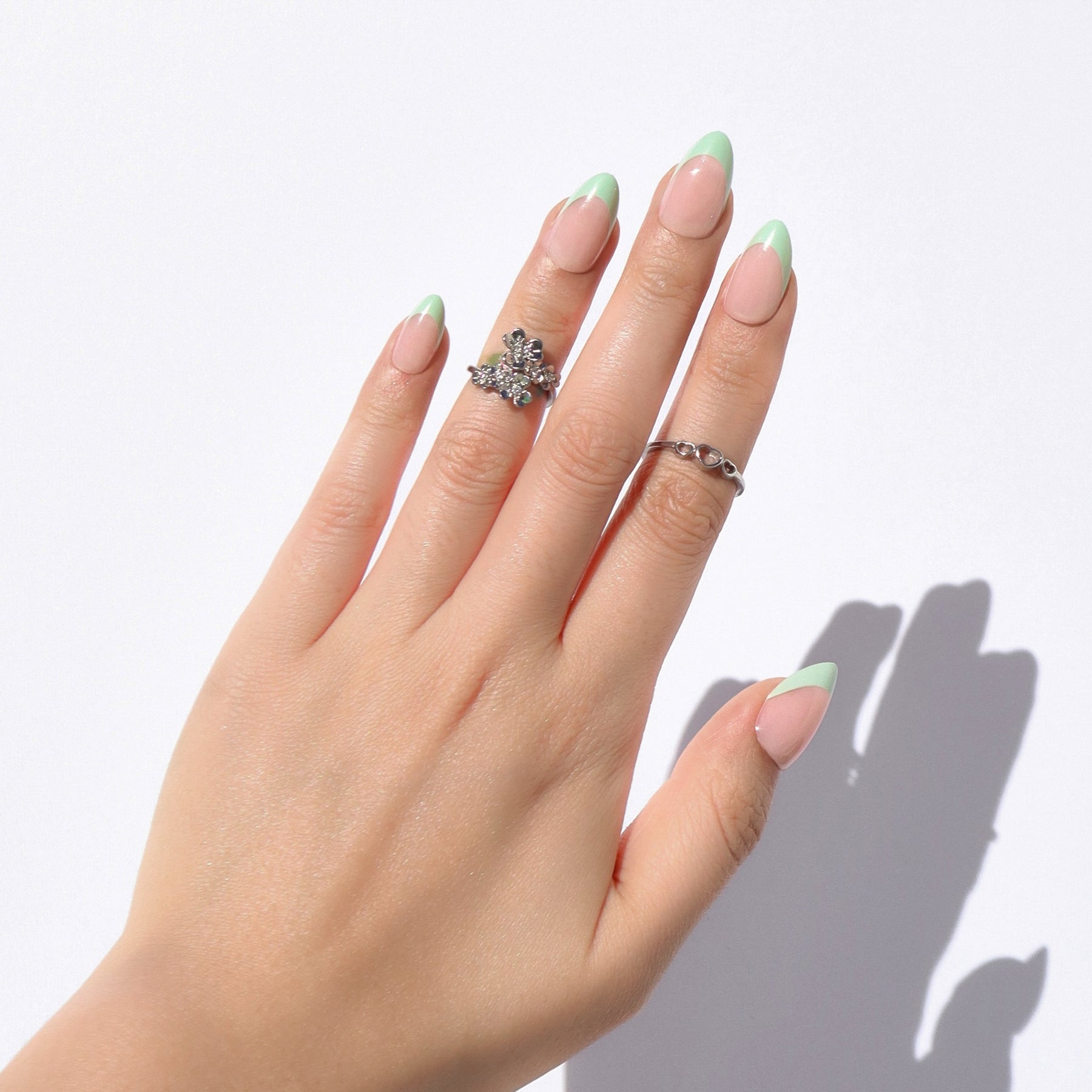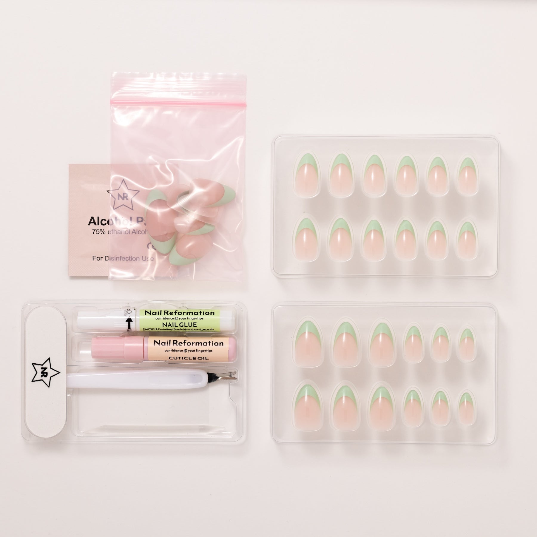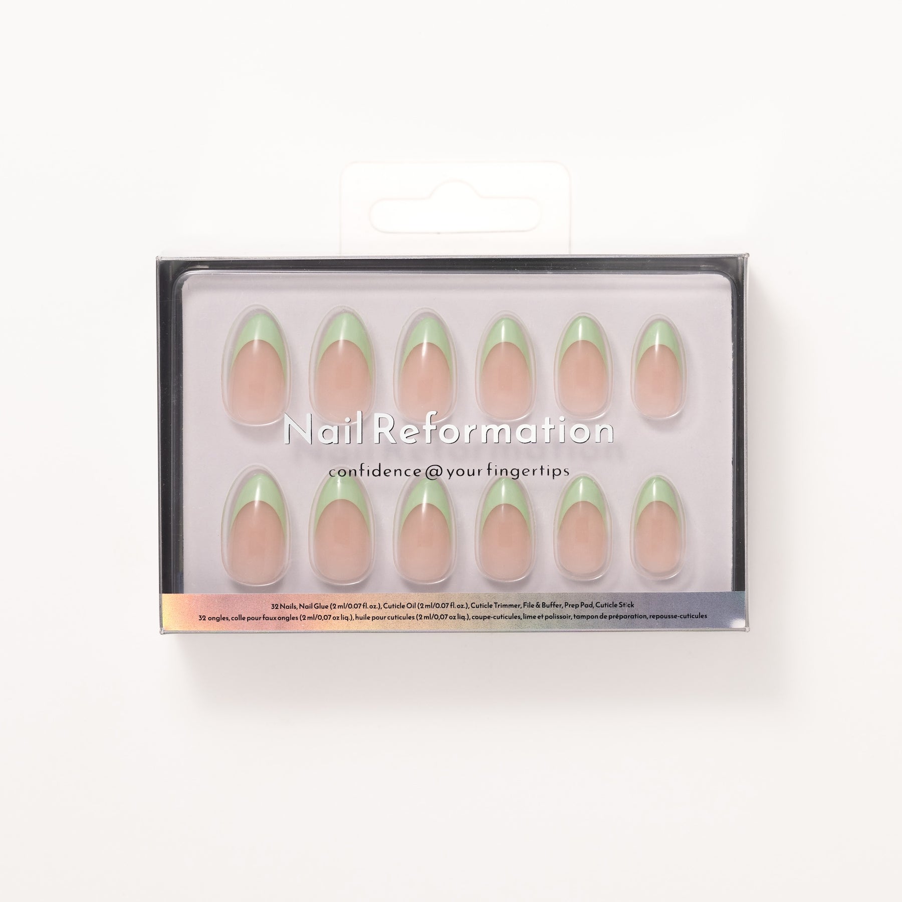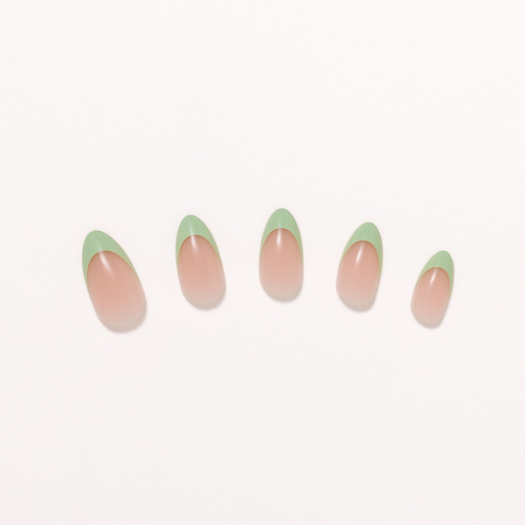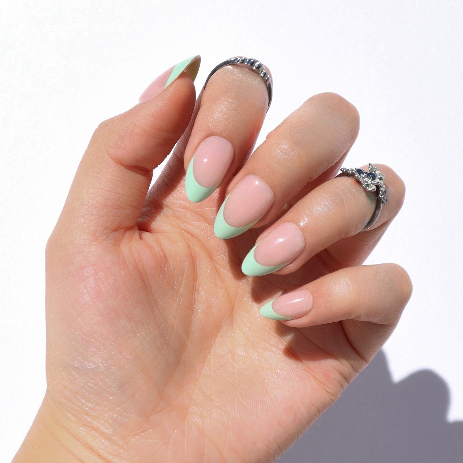 The Pistachios press-on nail set takes its cue from the nut itself, with a soft outer look and a pop of green that feels newly revealed. Designed in a short almond shape, each nail features a pale pink base that reads smooth and clean, finished with a muted pistachio-green tip that peeks through with just the right amount of contrast. The placement keeps the design light and balanced, like cracking open something good and finding the best part inside. Polished but playful, the look feels easy to wear while still a little unexpected. Finished with a smooth, high-shine glossy coating, this set delivers a fresh, modern finish that feels crisp, fun, and perfectly put together.