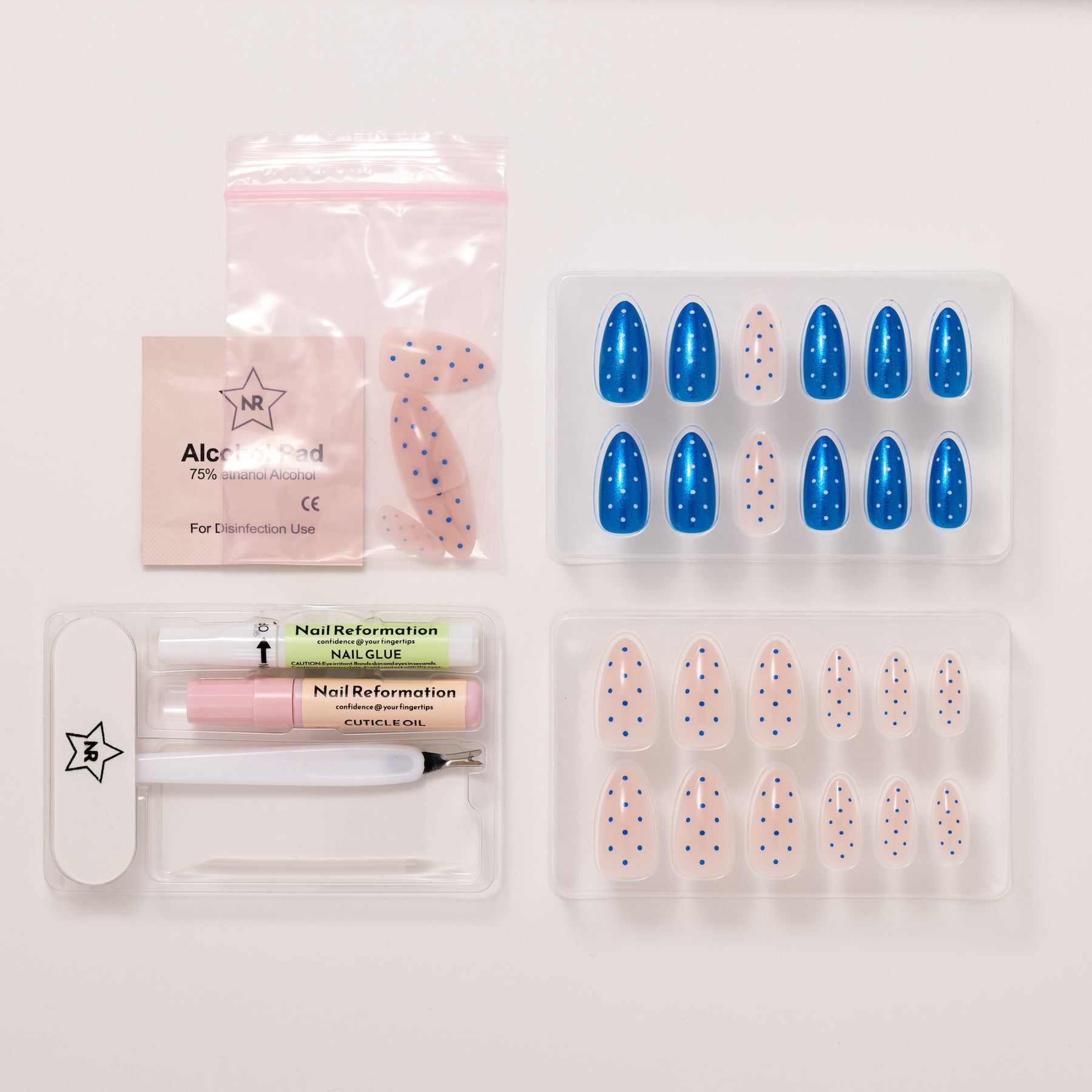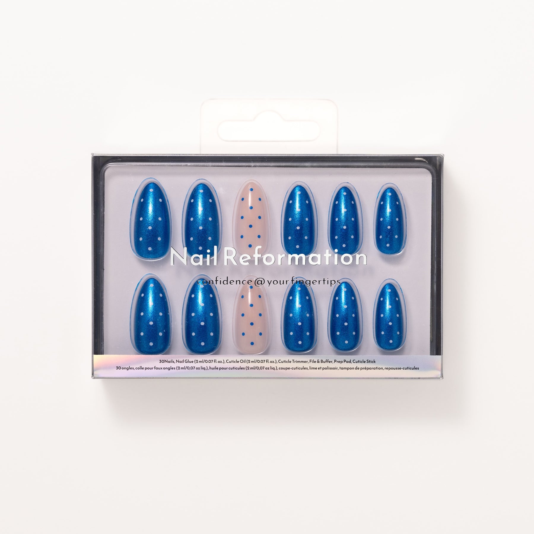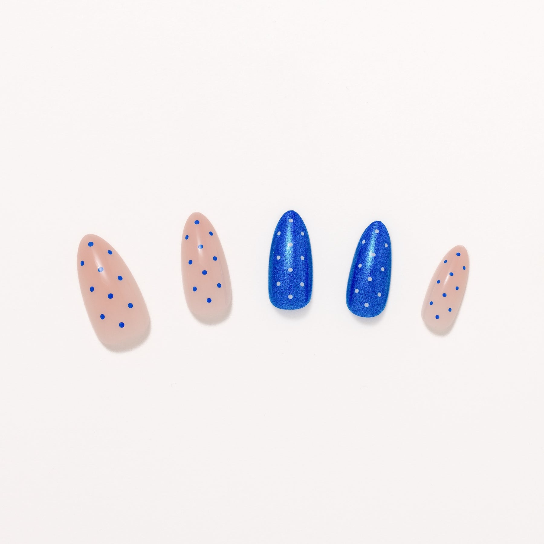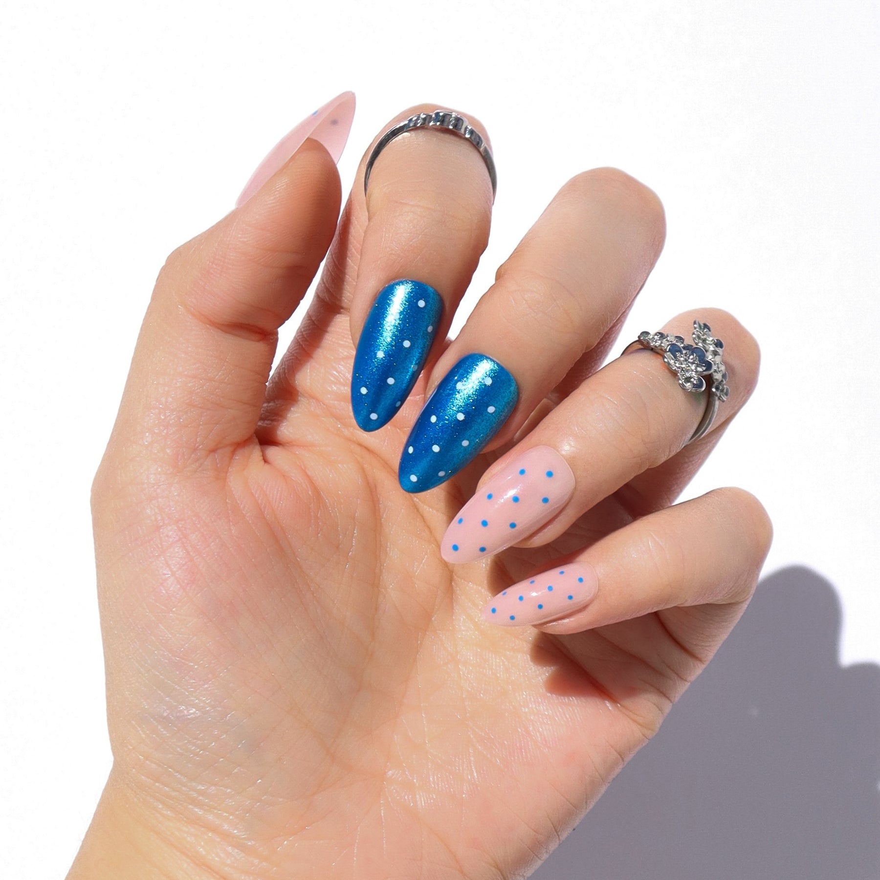 The Sapphire Beads press-on nail set brings a refined and architectural energy to your fingertips. Designed in a medium almond shape, each nail showcases a sophisticated transition of blue tones across a natural base. The design is defined by precise dot art in varying shades of sapphire and cobalt to create the effect of intricate beading moving across the nail. This intentional placement of color provides a tactile look that mimics the elegance of fine jewelry. The balance of translucent spaces and bold blue accents keeps the overall aesthetic modern and composed. Finished with a high-shine glossy coating, this set offers a polished take on micro-artistry that is both deep and luminous.