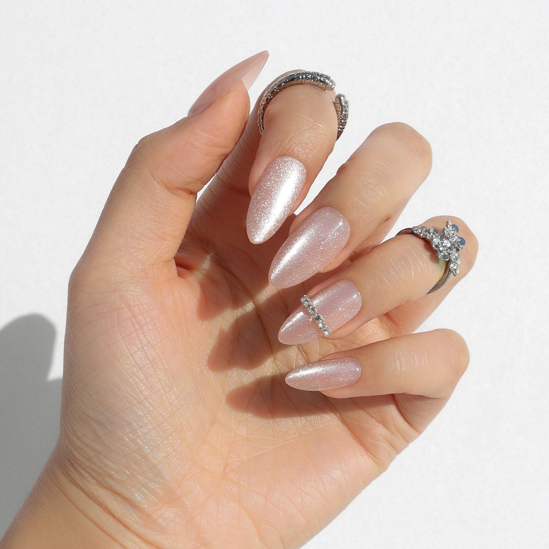 The Silk Jewel press-on nail set brings a refined take on cat-eye design with a soft, silky finish and a hint of sparkle. Designed in a medium almond shape, each nail features a warm nude base with a smooth cat-eye effect that shifts gently with the light, creating a fluid, elongated look. Select nails are finished with a delicate jewel accent, placed just enough to catch the eye without breaking the elegance of the design. The balance of subtle movement and restrained shine keeps the look polished and composed. Finished with a smooth, glossy coating, this set delivers understated glamour that feels elevated, modern, and effortlessly put together.