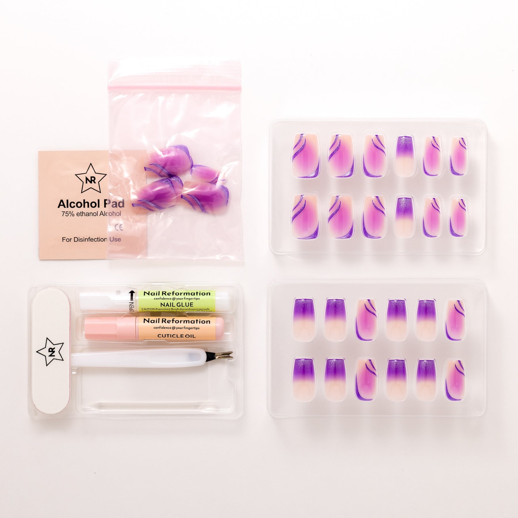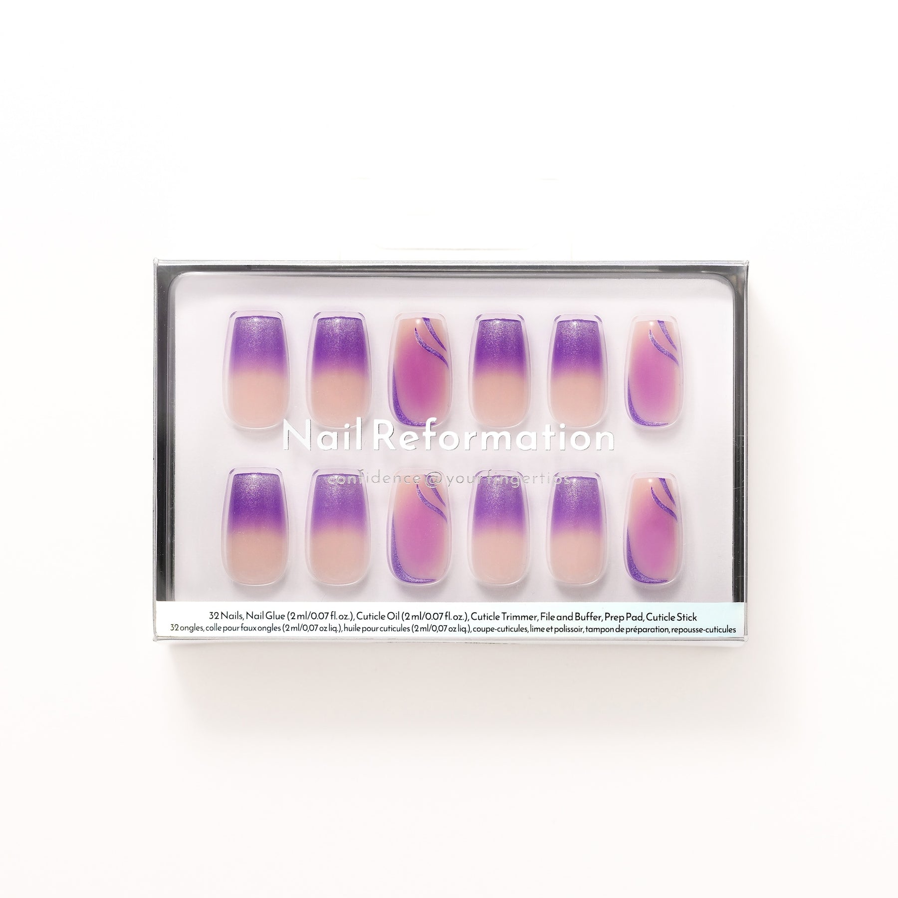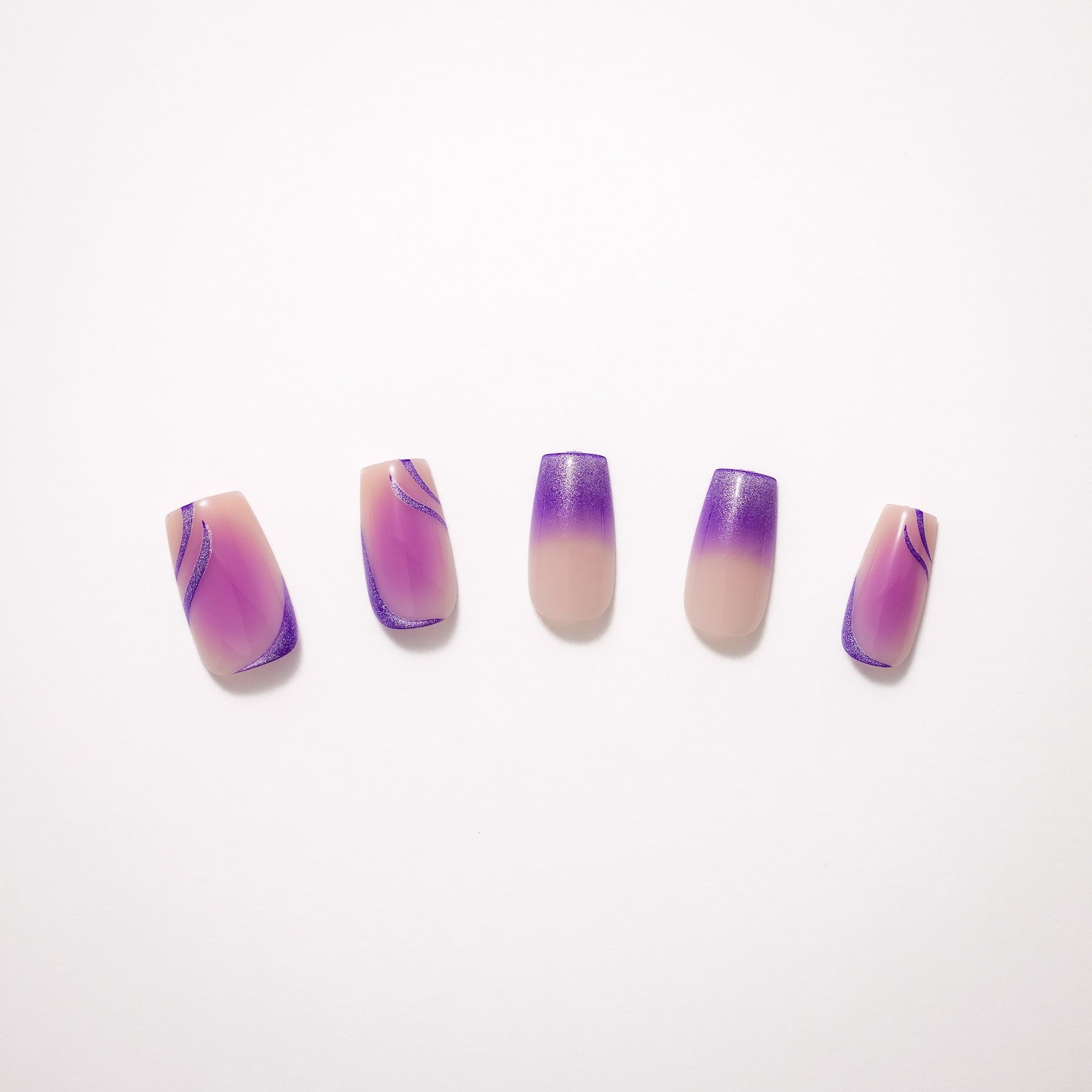A daydream come true. The Purple Hour press-ons blend soft nude and violet hues into a seamless ombré, capturing the beauty of a drifting thought just before it fades. A subtle cat eye sheen gives the illusion of movement, while metallic ribbons trace the design with light-catching detail. With its dreamy balance of color and calm, this short coffin set feels like something imagined made real.
