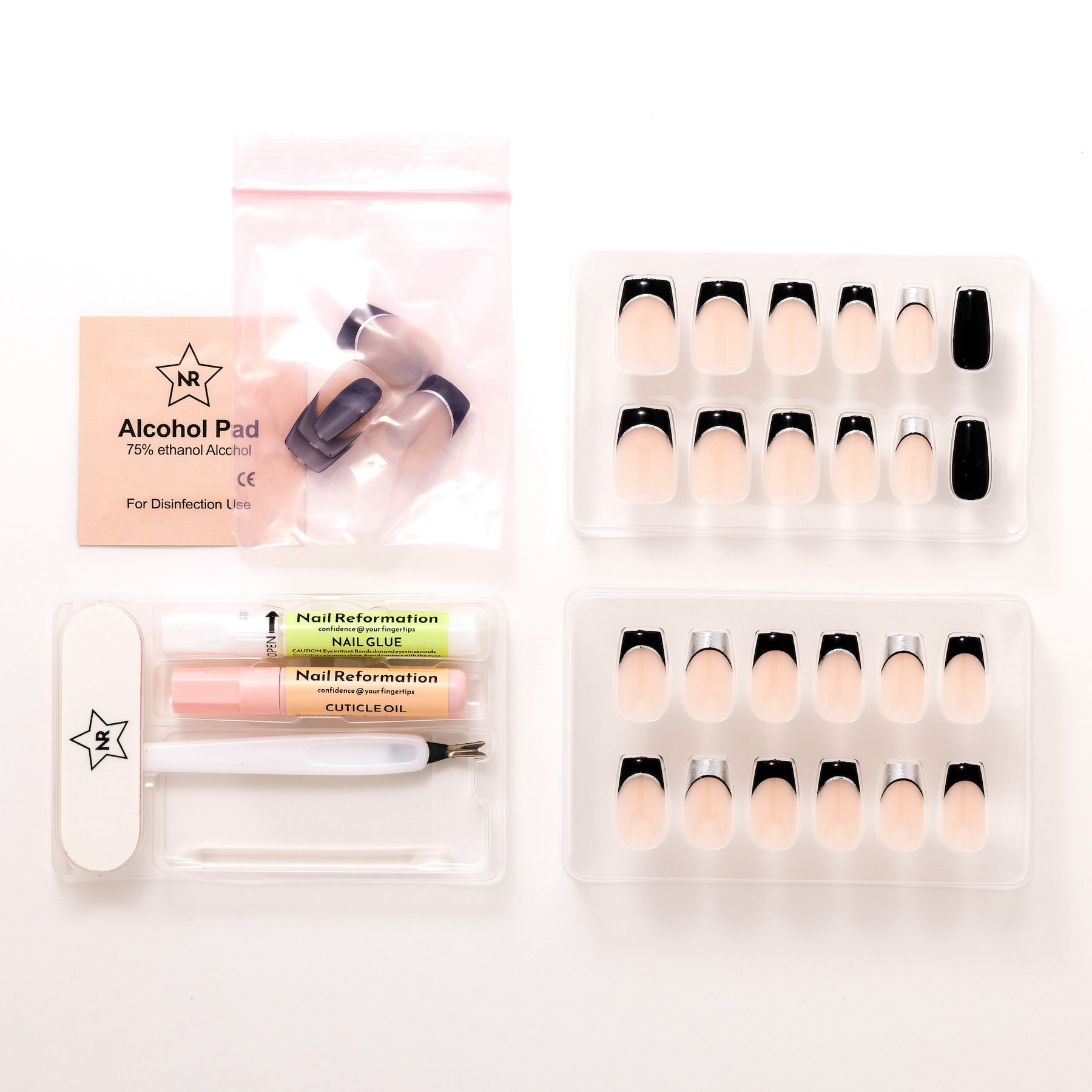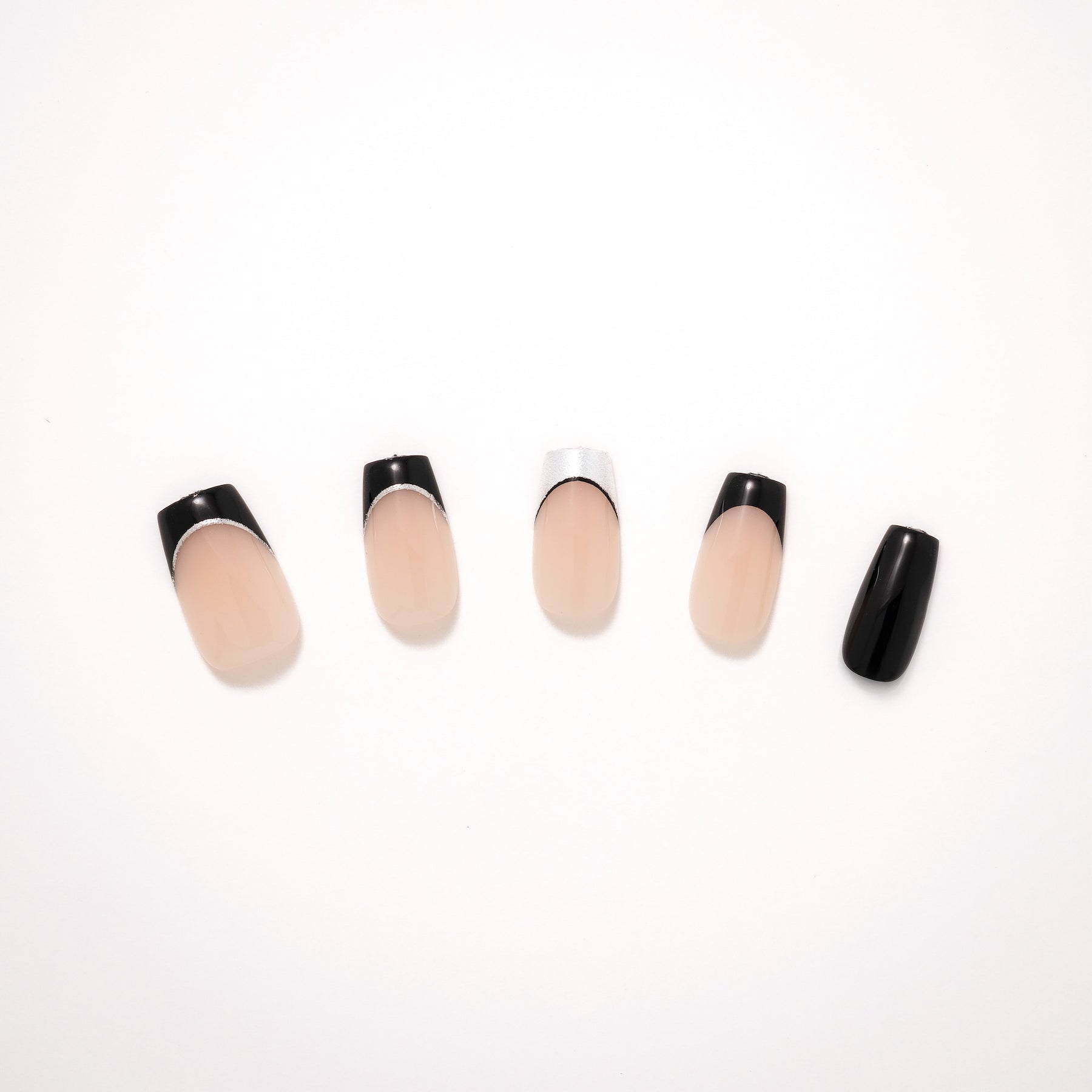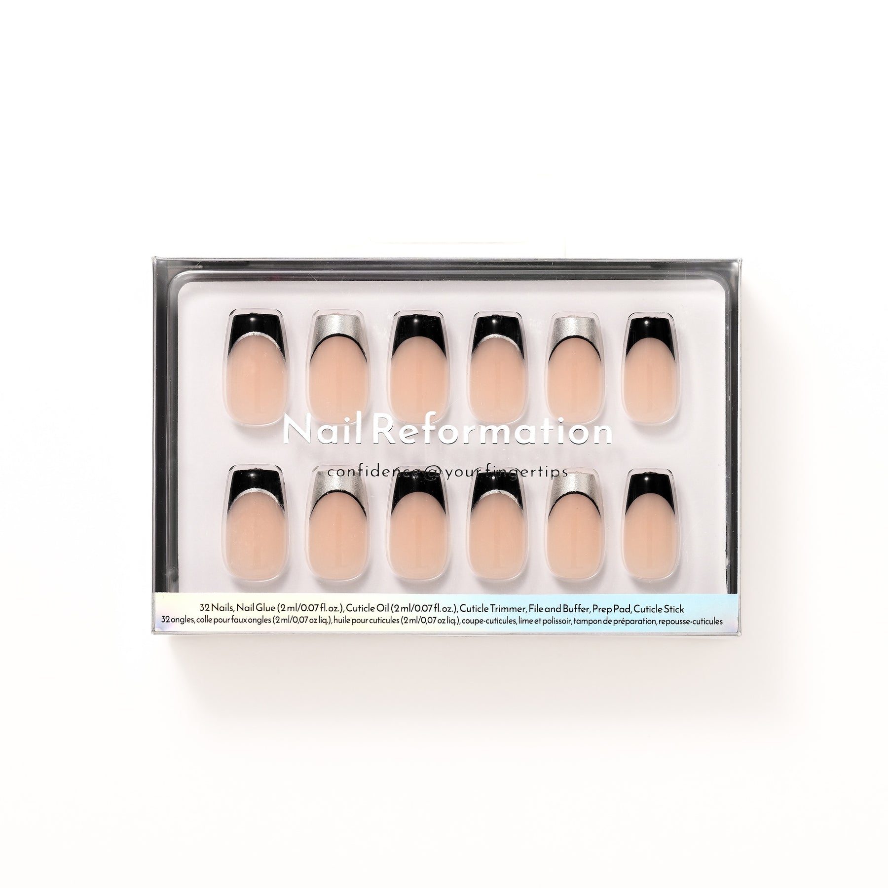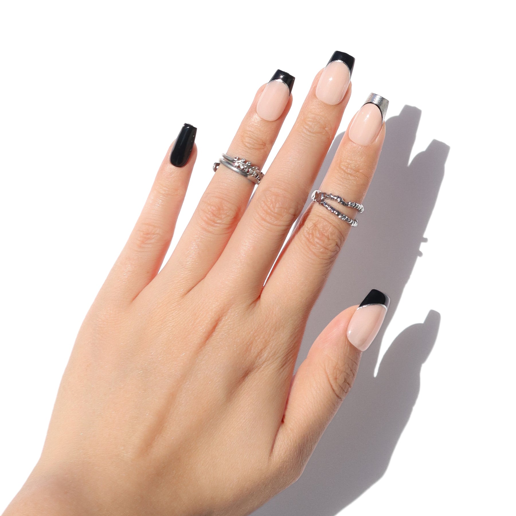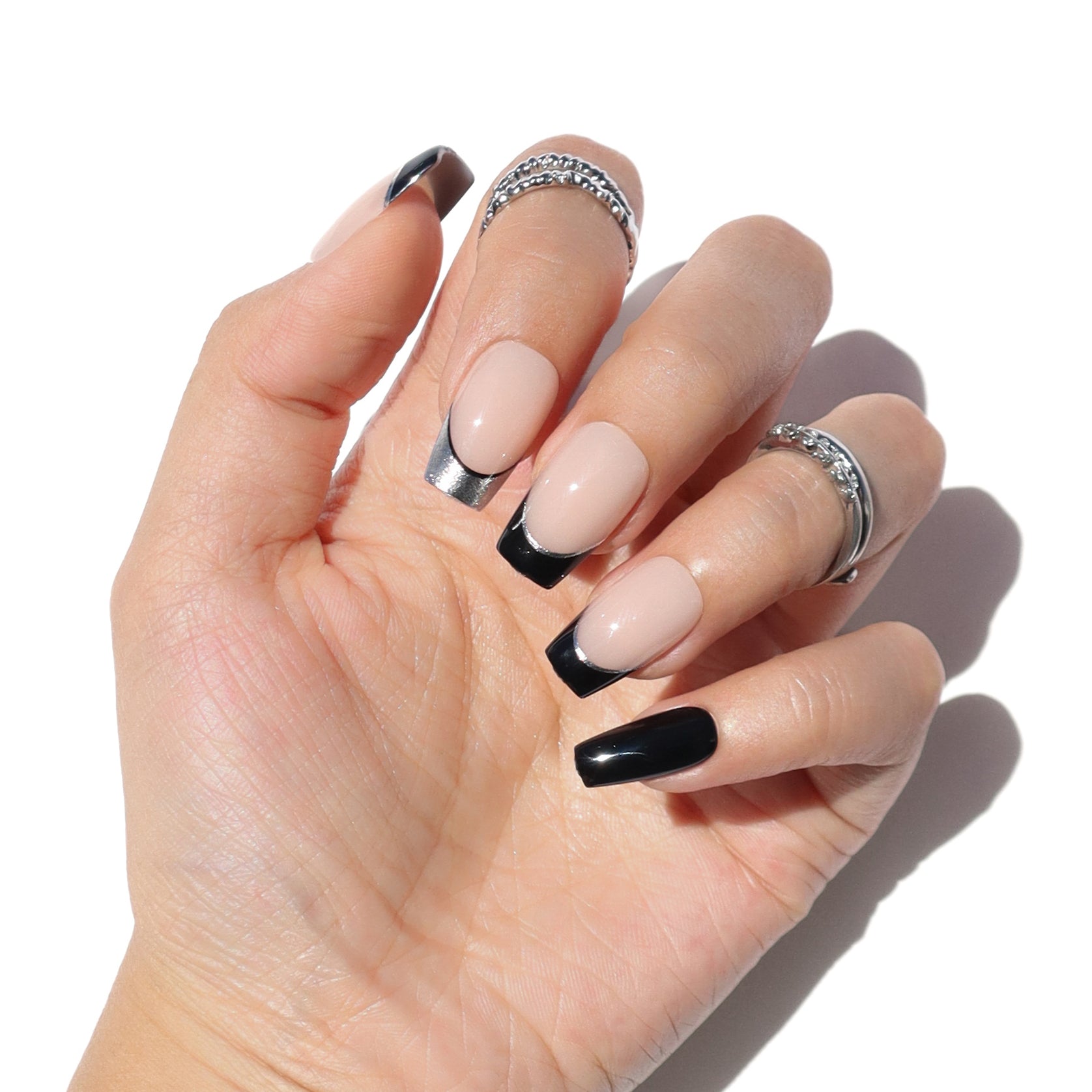 All smoke and mirrors. The Smoky Mirror press-ons capture the art of illusion, with a sleek, modern, and perfectly balanced design between mystery and shine. A nude base meets black and chrome French tips, creating depth and contrast that shift subtly with every move. The short coffin shape adds a structured edge, while the reflective finish keeps it polished yet enigmatic. Effortlessly cool and quietly commanding, Smoky Mirror proves that a little illusion goes a long way.