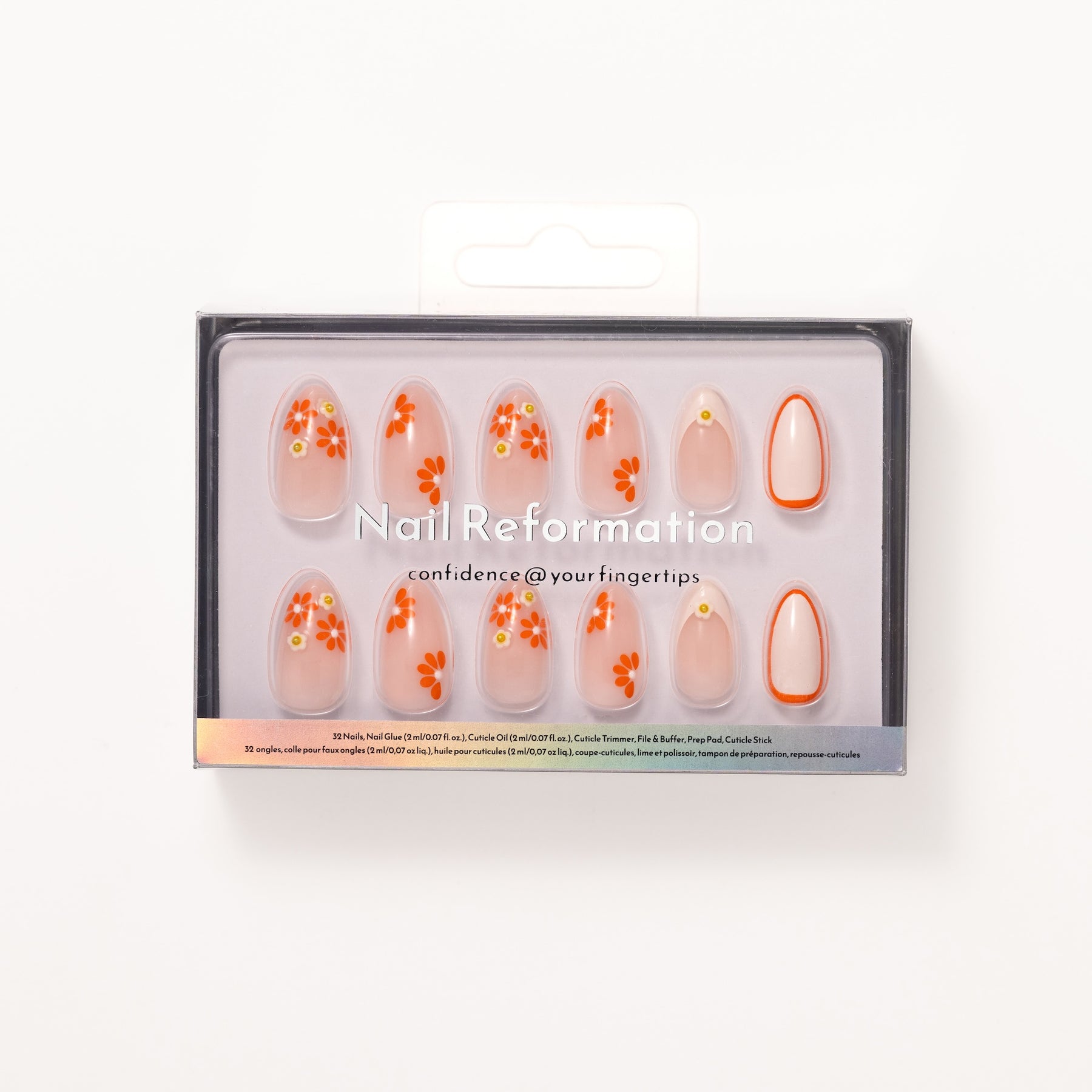 The Citrus Petals delivers a high-visibility aesthetic that keeps all eyes on you. Designed in a short almond shape, this set features a dynamic mix of solid vibrant orange nails and artistic floral accents that refuse to fade into the background. Select nails showcase sharp orange and white flower motifs, while others feature a refined French tip with floral detailing and sparkling silver jewels for a flash of light-catching brilliance.