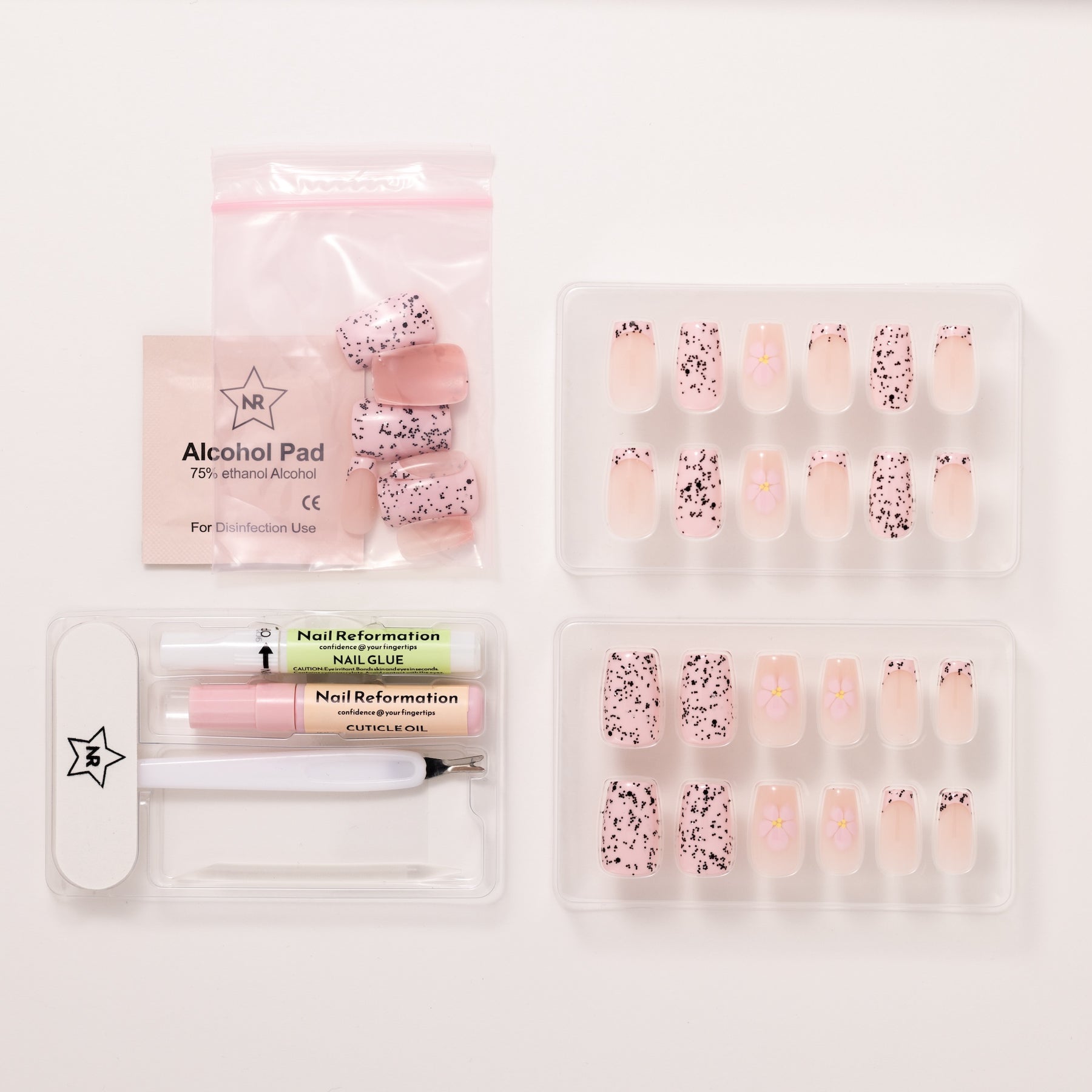 The Poppy Seed adds a subtle, textured charm with a fresh floral twist to your look. Each short coffin nail features a soft pink base, where some nails are adorned with a delicate scattering of black "seed" specks and others are accented with a single, dainty white flower. Finished with a high-shine glossy polish, this design perfectly balances a playful energy with a clean, modern aesthetic.