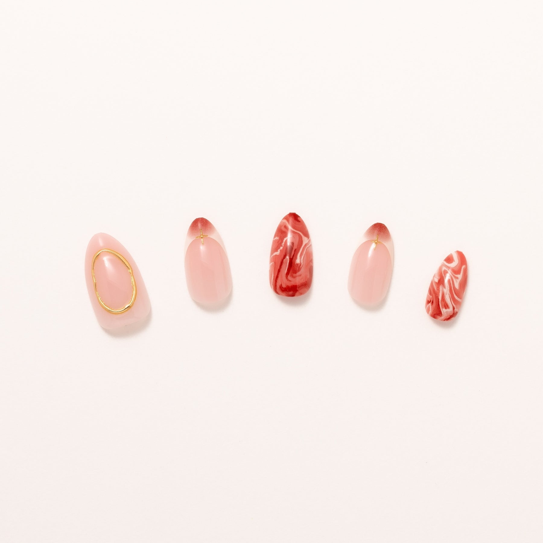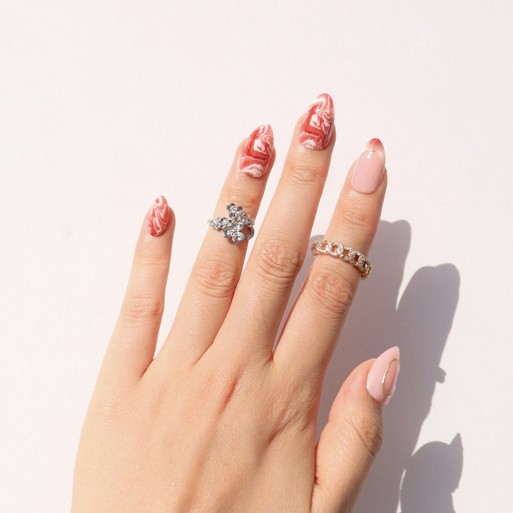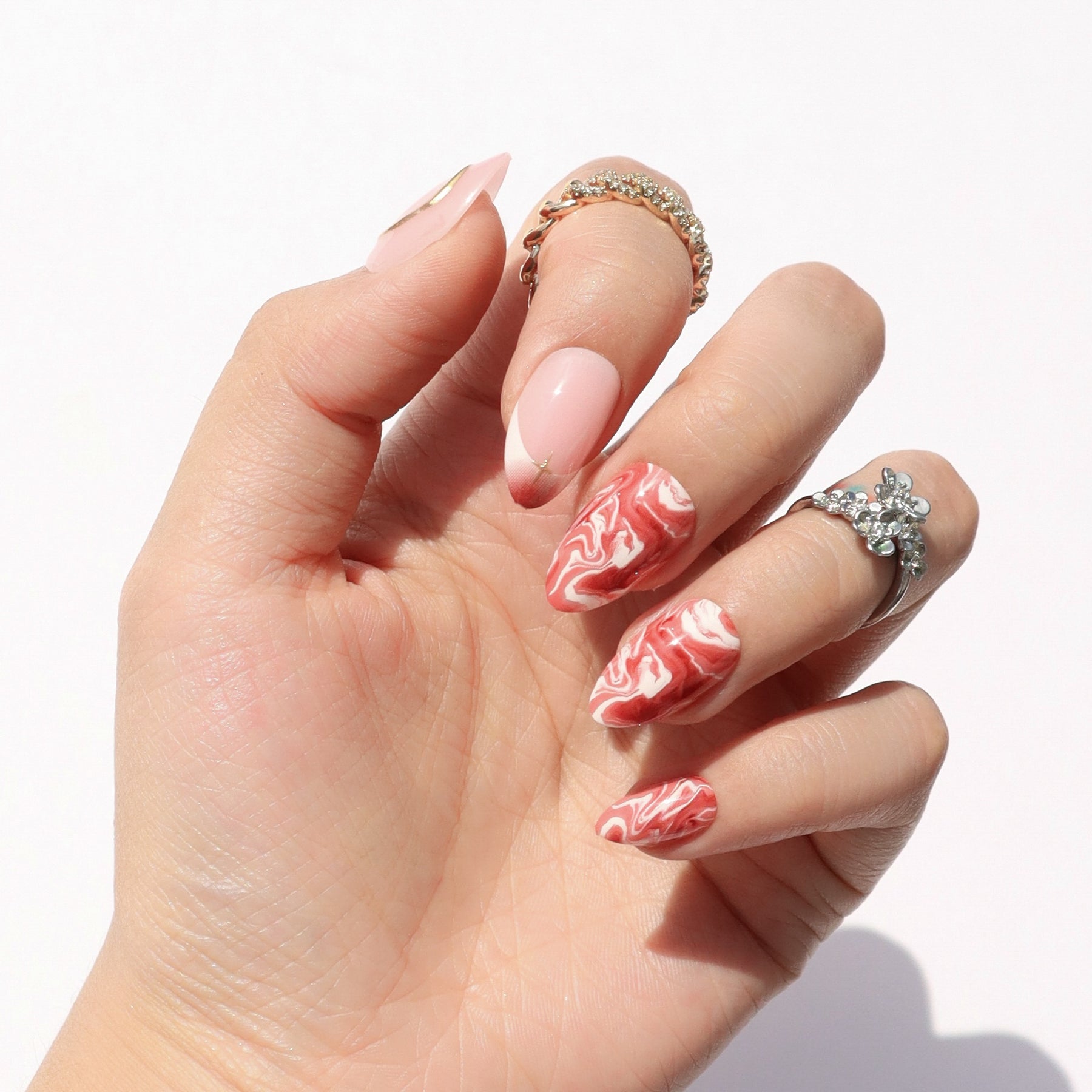 The Cinnamon Swirl press-on nail set blends cozy hues and delicate marbling for a manicure that feels sweet and spiced. Each almond-shaped nail is decorated with rich red and nude-toned swirls, mimicking cinnamon glaze in motion. A metallic gold accent adds a touch of shimmer to the soft, pastry-inspired palette. Finished in a high-gloss coat, this set is a perfectly baked treat for your fingertips—warm, rich, and totally indulgent.