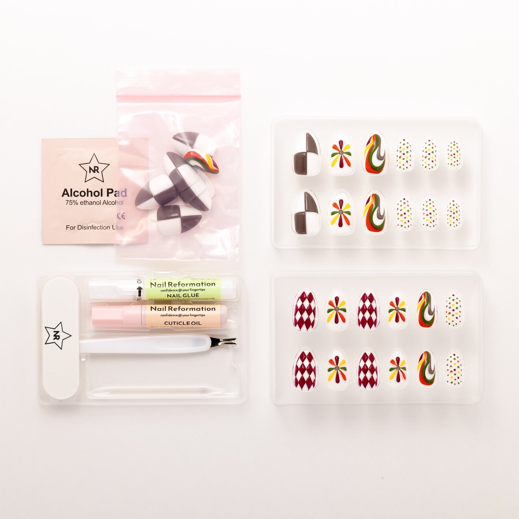 The Pattern Play press-on nail set is a 3D nail art party where nothing matches but everything goes. With short almond press-on nails in retro stripes, color block curves, warped florals, diamonds, and candy dot accents, this design leans into a maximalist moment with vintage flair. Each nail’s sculpted finish adds fun texture while keeping the whole set glossy and wearable. It’s the mani equivalent of mixing prints, but make it polished.
