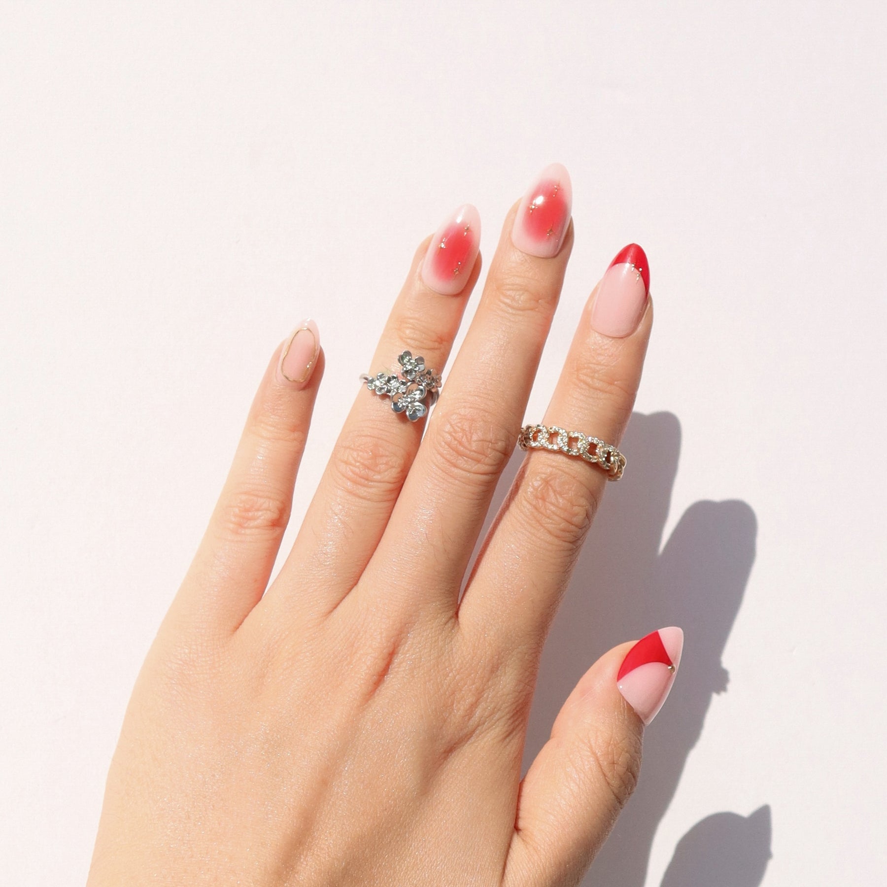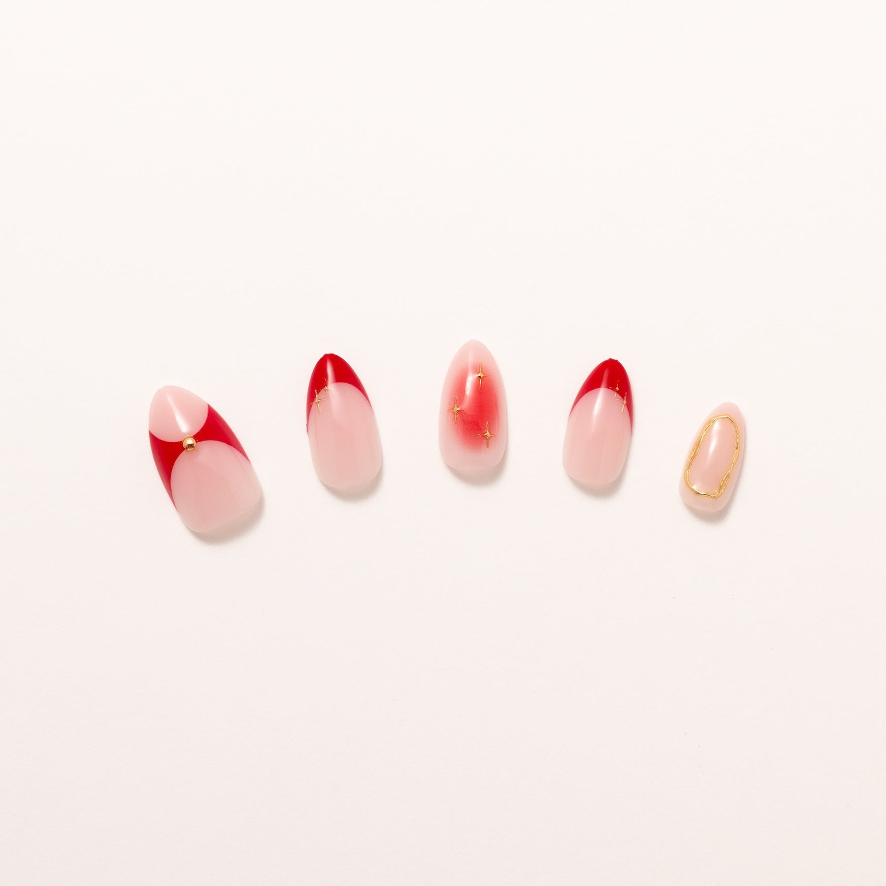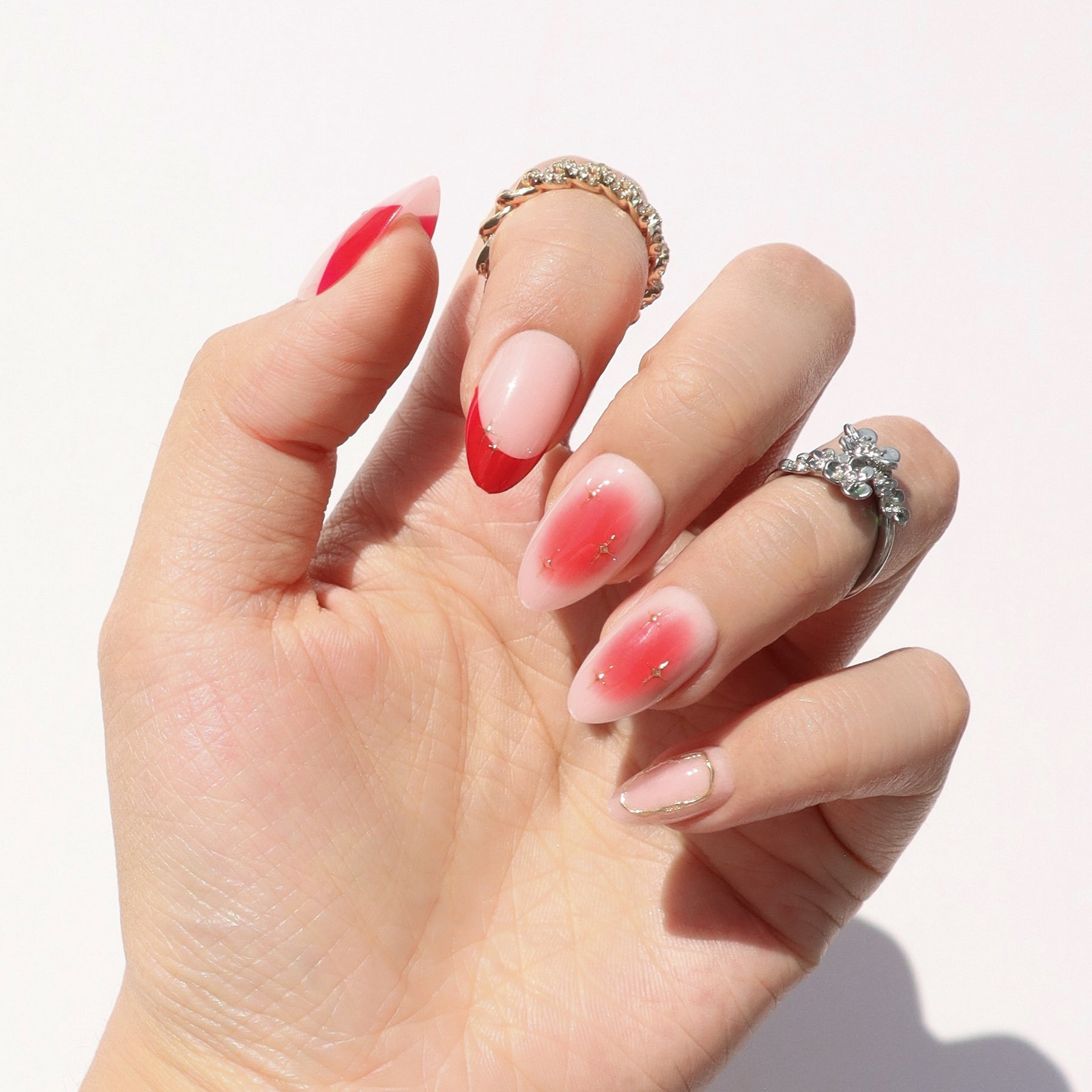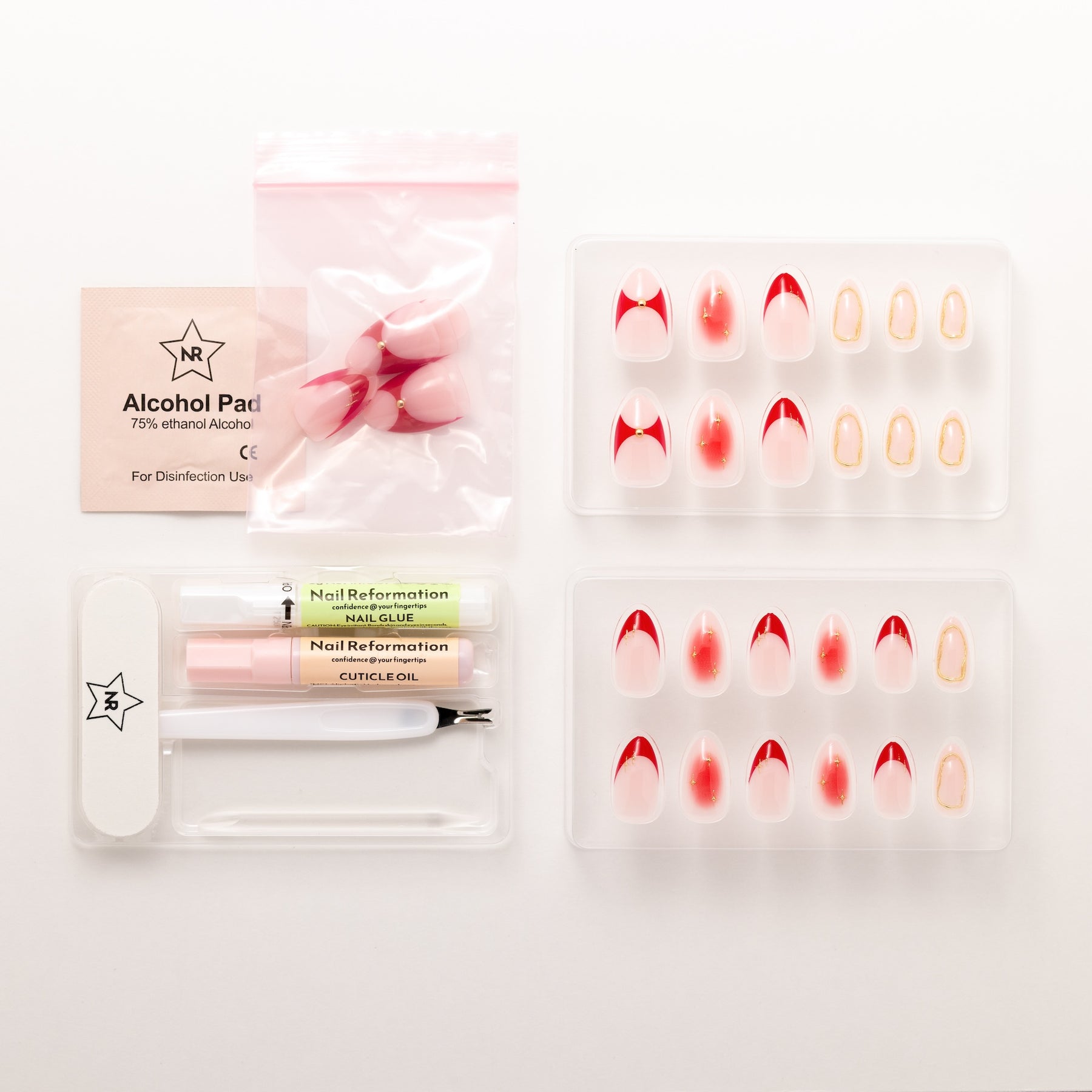 The Red Dress press-on nail set captures curve-hugging confidence in crimson. With red French tips, gradient fades, and elegant curved accents, each short almond nail wears like a statement piece. Equal parts sultry and sophisticated, this set is your go-to for when you want your manicure to wear the dress.