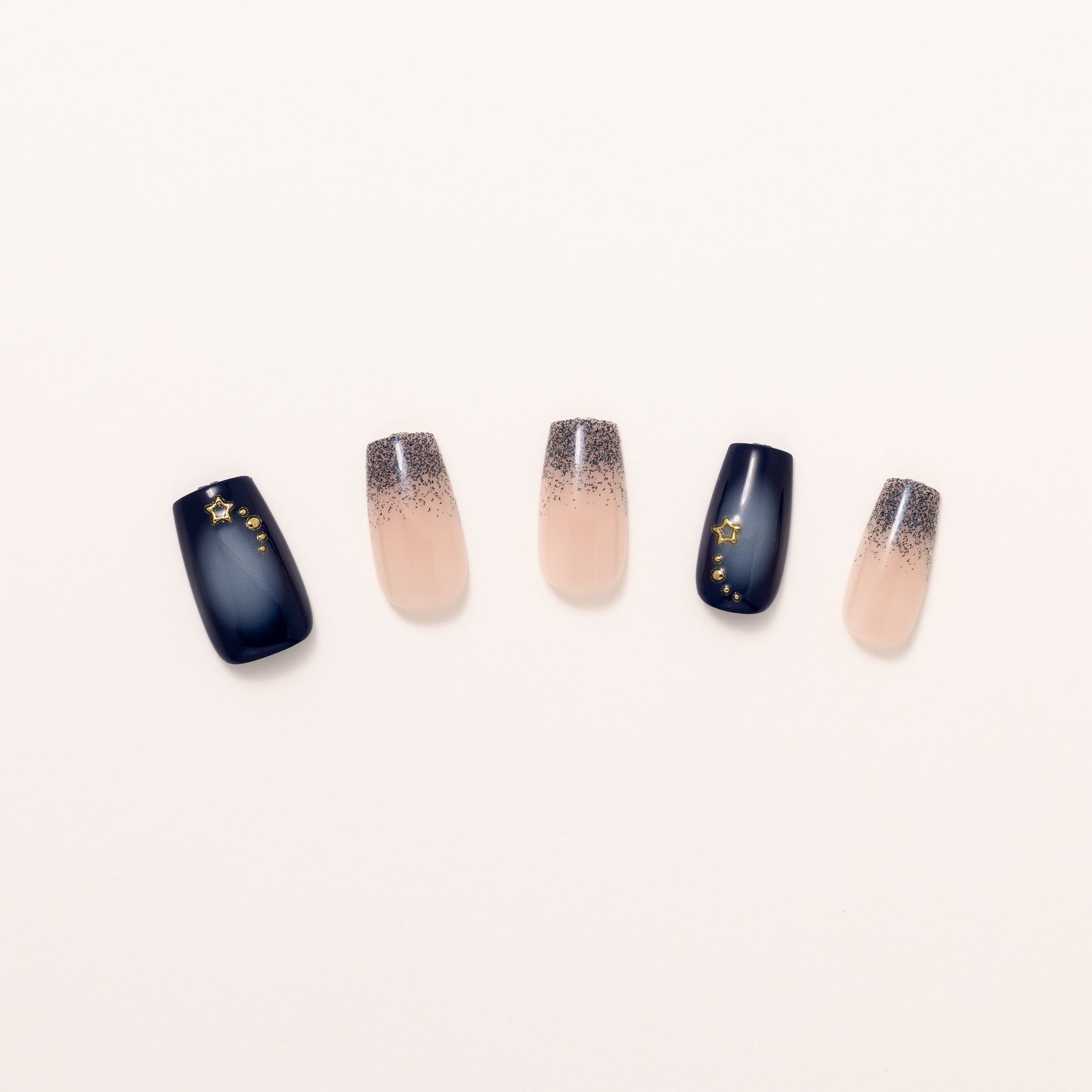 The Maple Leaf press-on nail set layers syrupy brown tones with sheer blush and scattered rose gold foil to mimic the look of melting sugar. Each medium almond nail feels warm and fluid, like a swirl of maple glaze on skin. Finished in a soft-gloss top coat, this set is all about smooth lines and sweet simplicity with just a bit of shimmer.